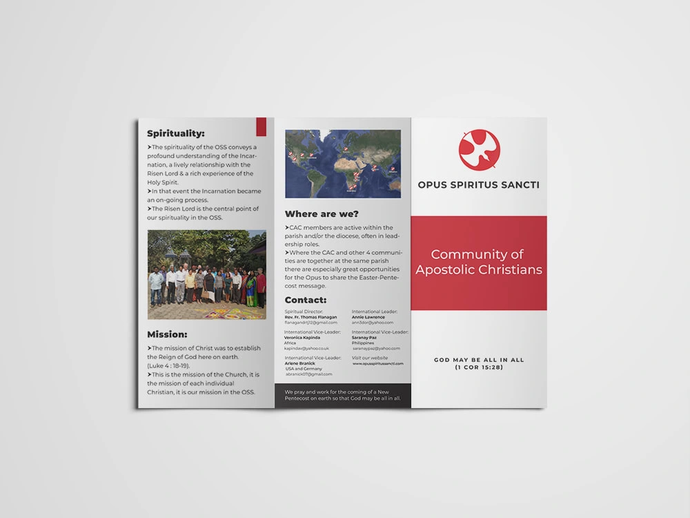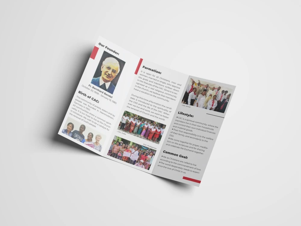 The Brochure was designed for an International Christian group known as the Community of Apostolic Christians. With the groups being widely spread in about 5 continents, the groups carry out activities together and individually. The design aspect focuses on the minimal and modern approach as the community keeps growing.