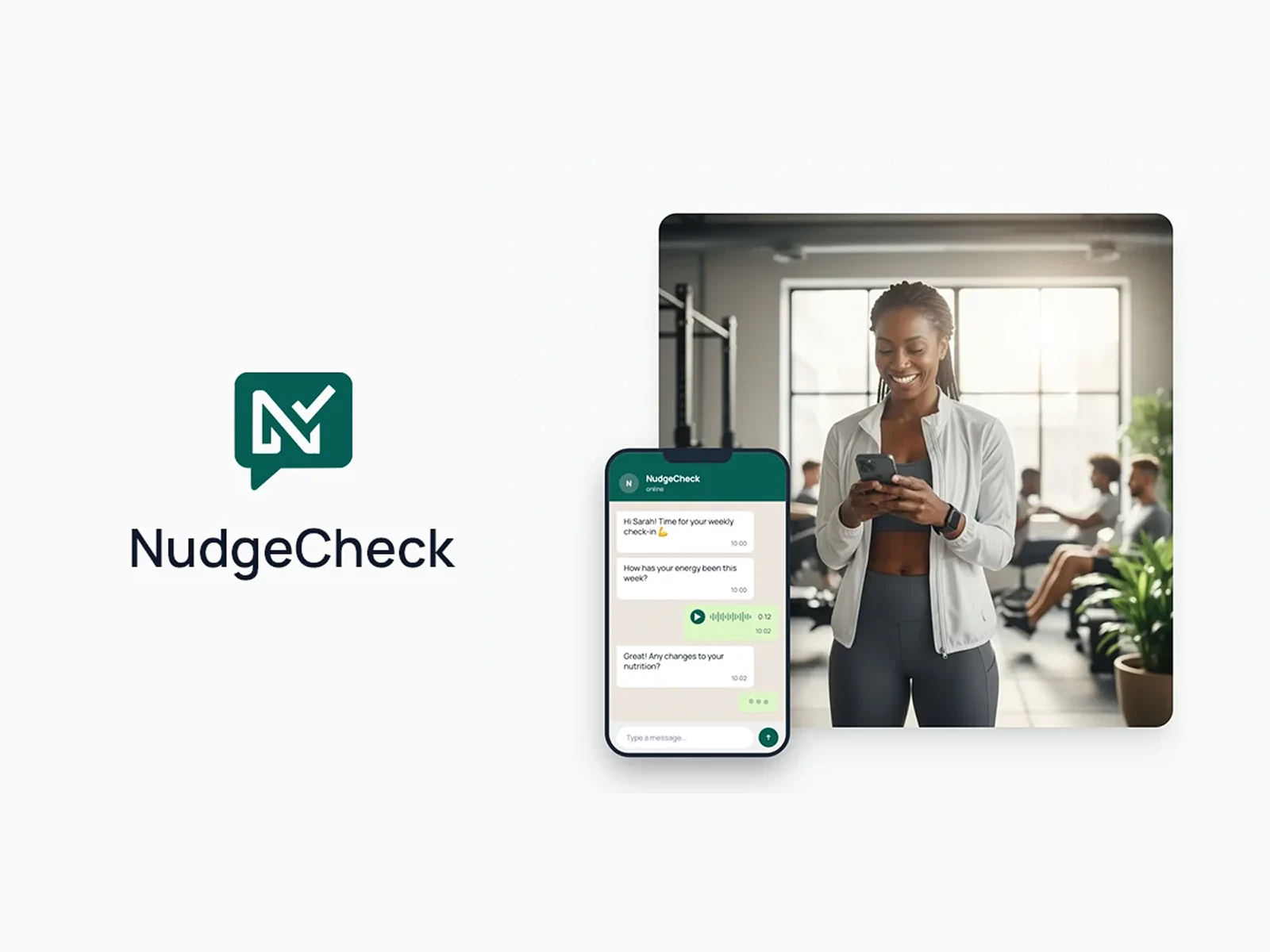 NudgeCheck sends scheduled check-ins over WhatsApp using the Meta Cloud API. The coach creates a form with questions (ratings, multiple choice, free text), assigns it to a client, sets a schedule. At 8am on Tuesday, the client gets a WhatsApp message. They reply with text or voice notes.