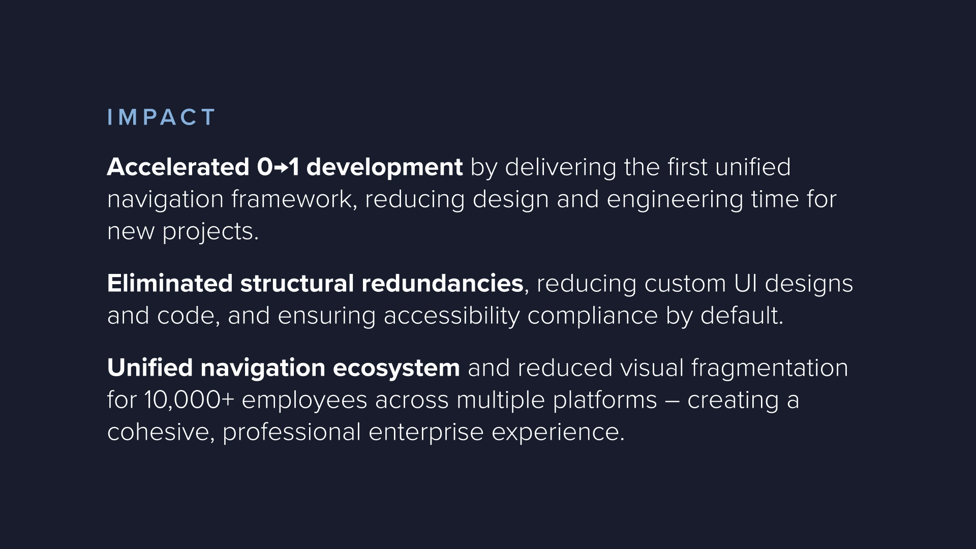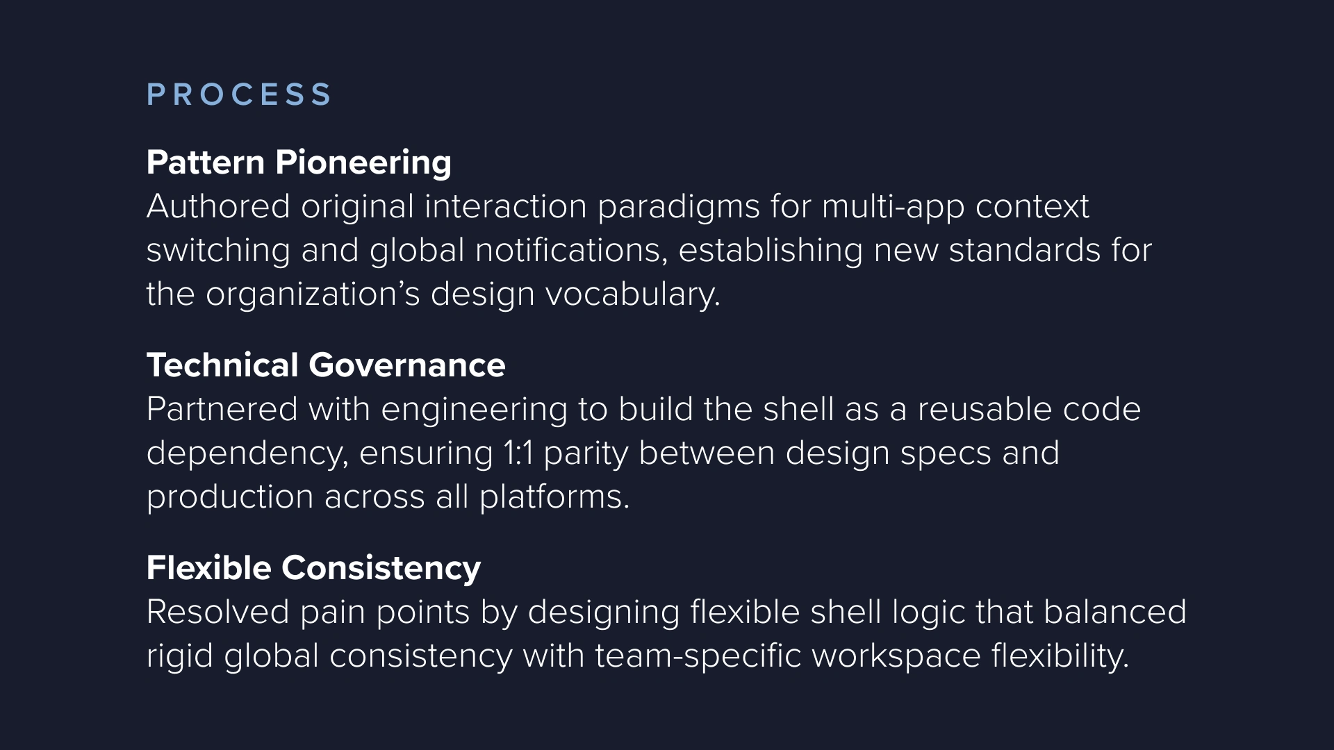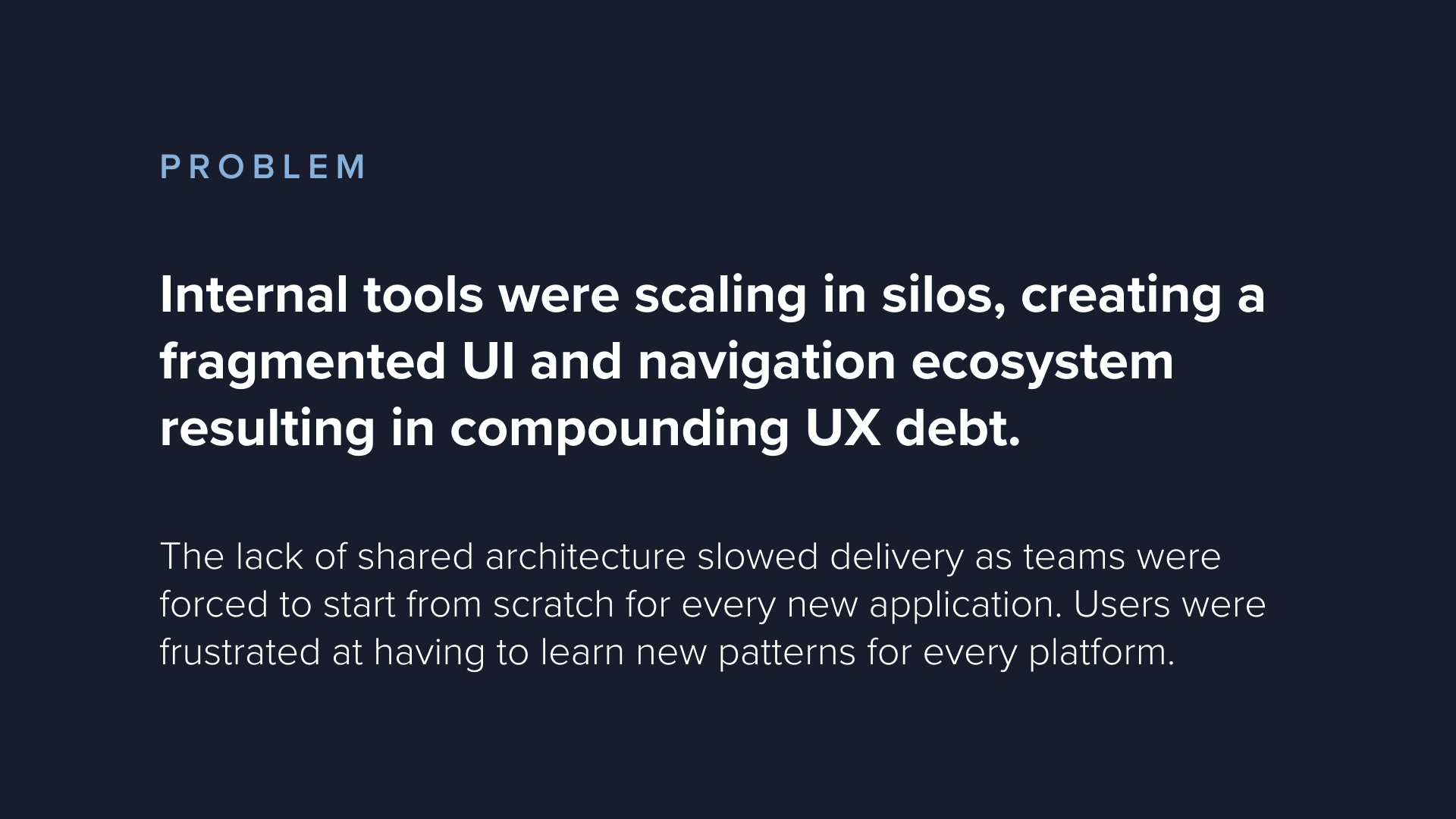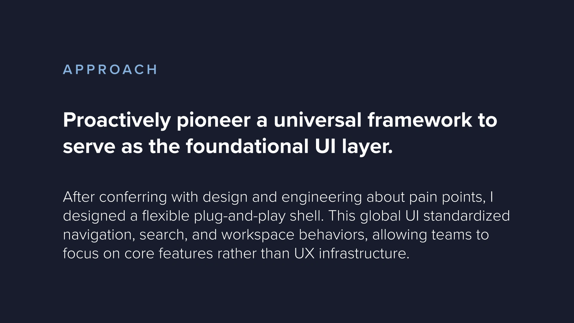 Internal tools were scaling in silos, creating a fragmented UI. So I pioneered a universal framework to standardize navigation, search, and workspace behaviors