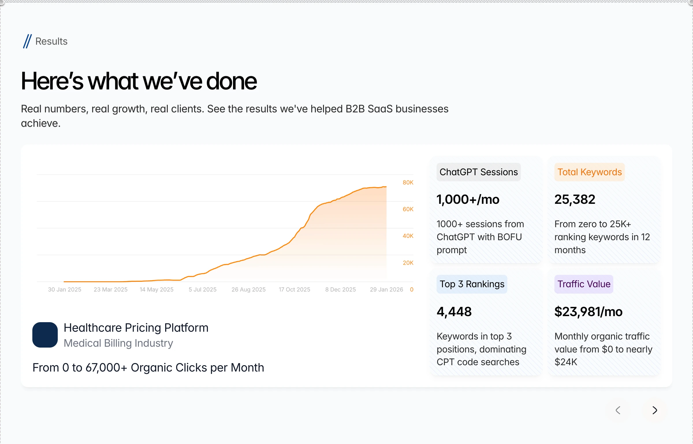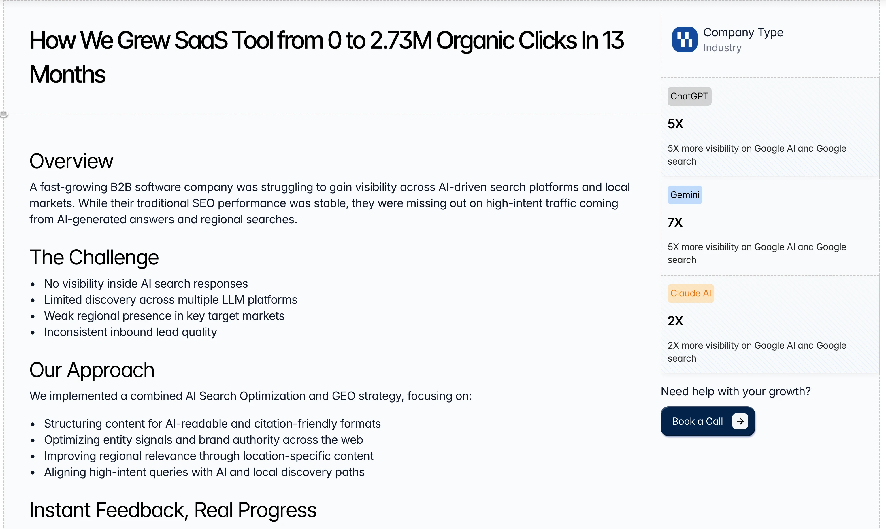 Results pages are only as good as the numbers they show. The case study layout was built to surface metrics fast like 5X visibility, 7X AI search presence, 67,000+ organic clicks with enough narrative context to make them believable.