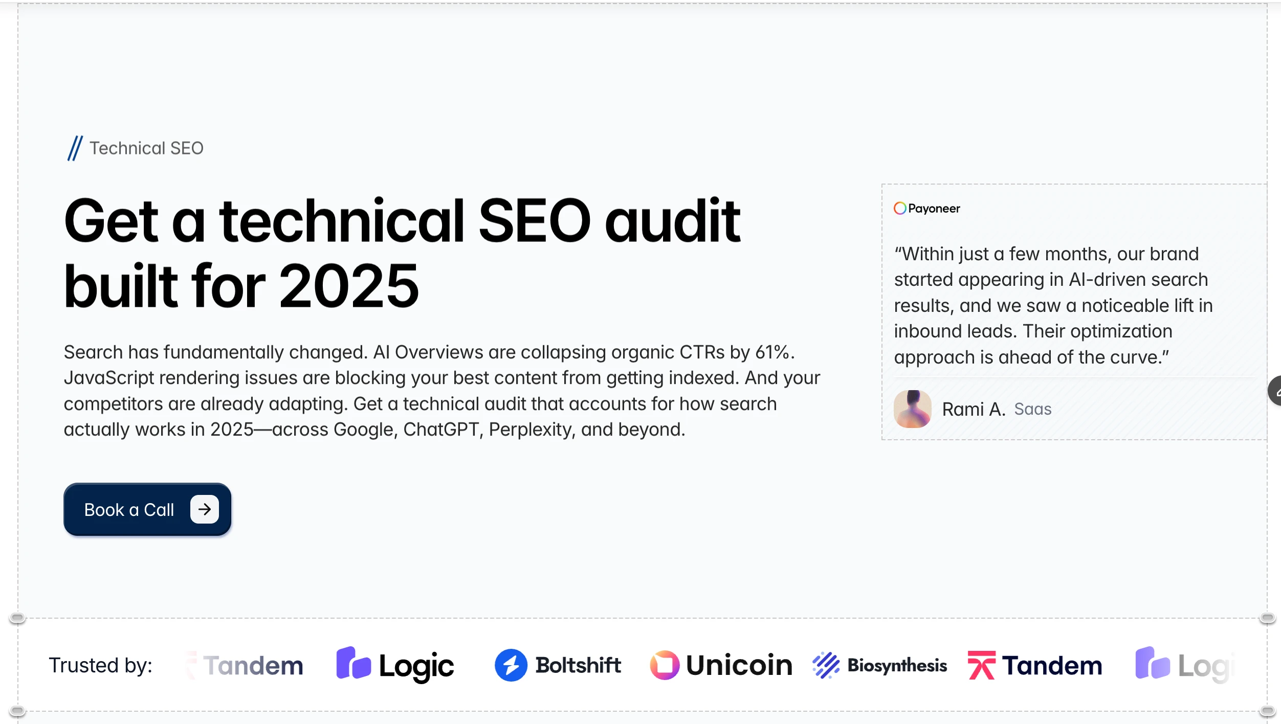 The hero led with the core value proposition. making Google and AI search a revenue channel and moved quickly into social proof, trusted logos, results, and a clear CTA. Hierarchy did the heavy lifting so visitors understood the offer before they had to think about it.