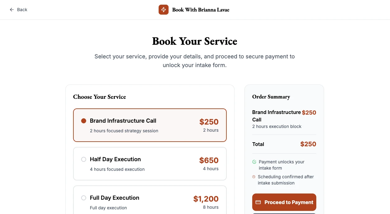 The final product lives at book.briannalavae.com, connected to my domain and powered by Stripe for instant, secure payments.