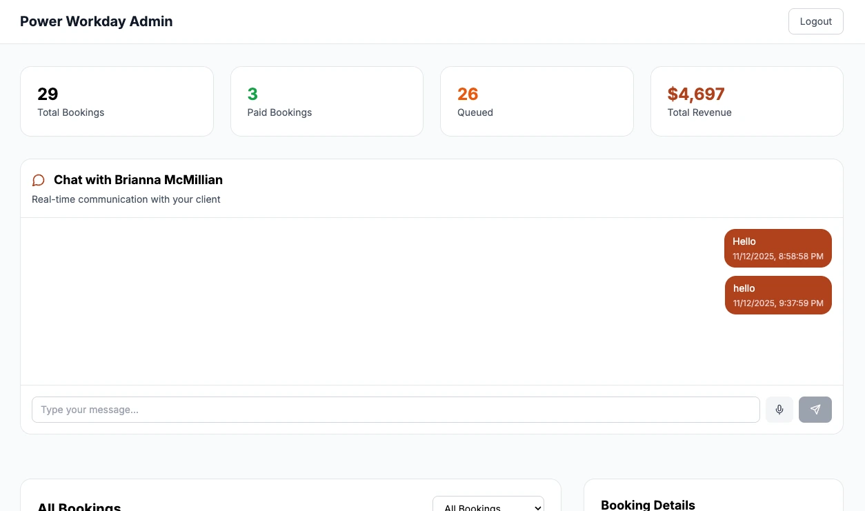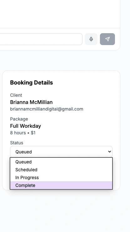 This allows instant communication between me and the client — no email threads, no switching apps — giving a concierge-level experience inside the booking platform itself.