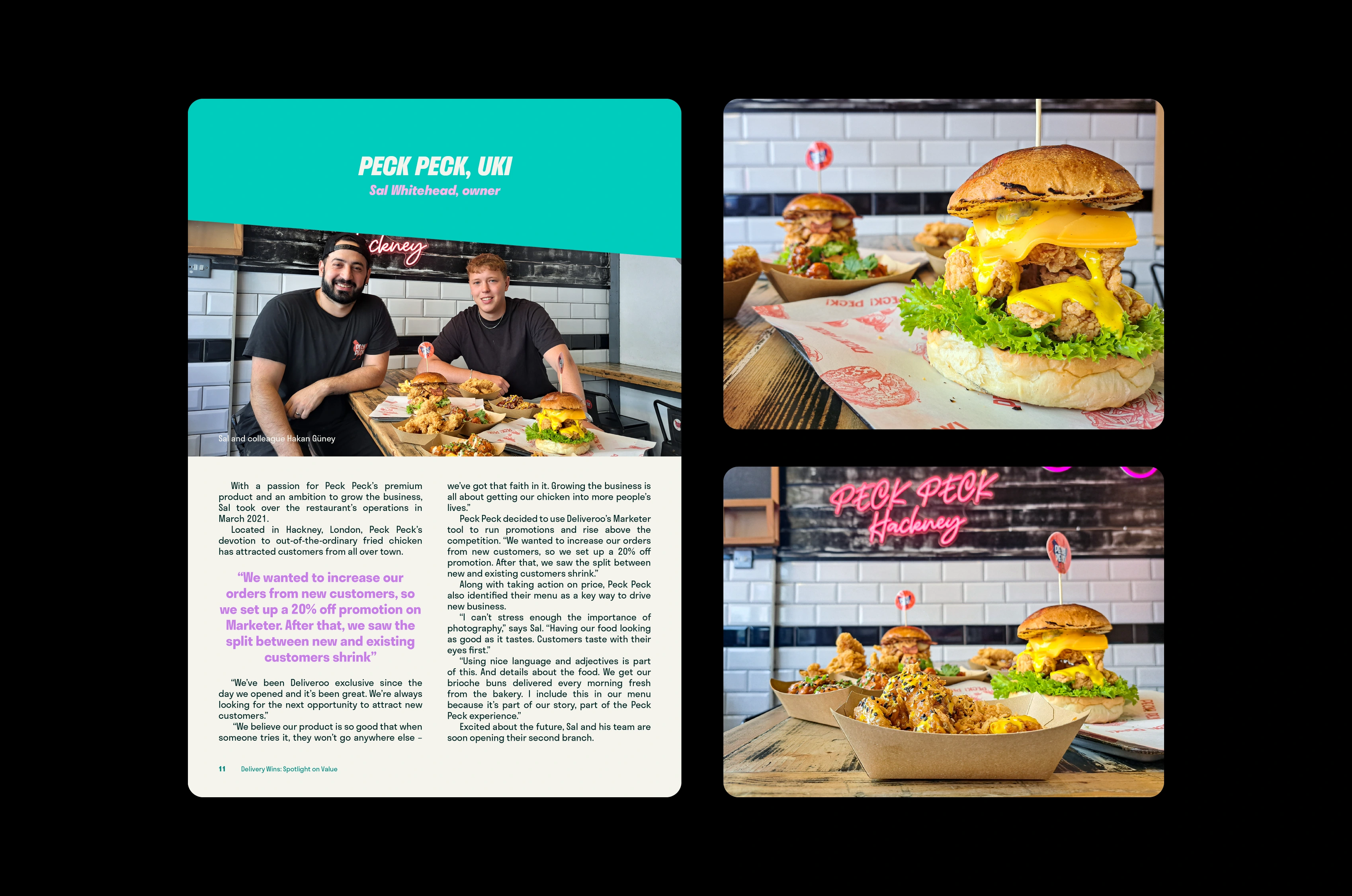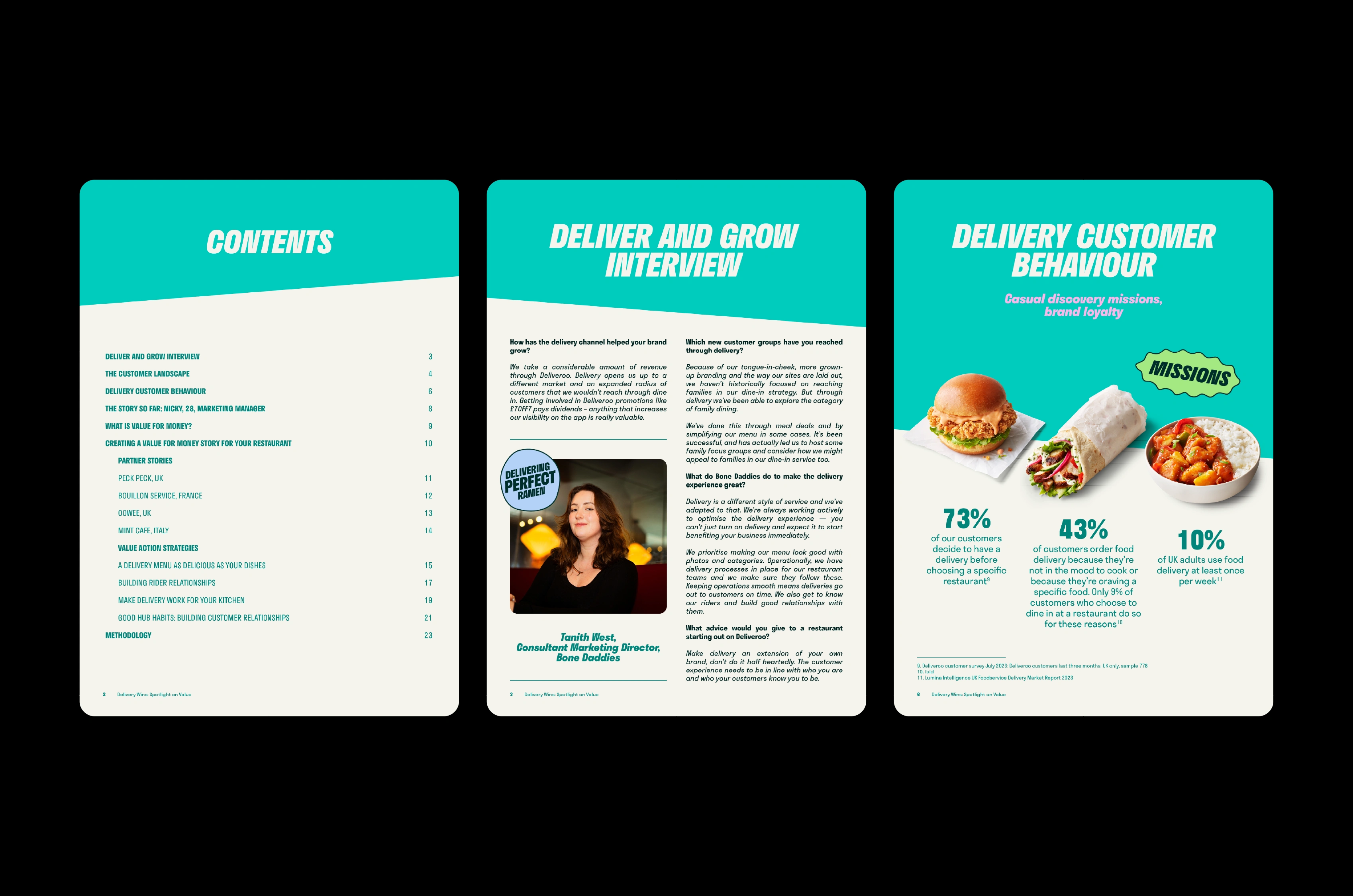 Design: For this project, I designed the layout and formatting of the 23-page insights report on Adobe InDesign using Deliveroo's new branding package, which included an expanded primary and secondary colour palette, graphic shapes, B2B iconography, and food photography.
