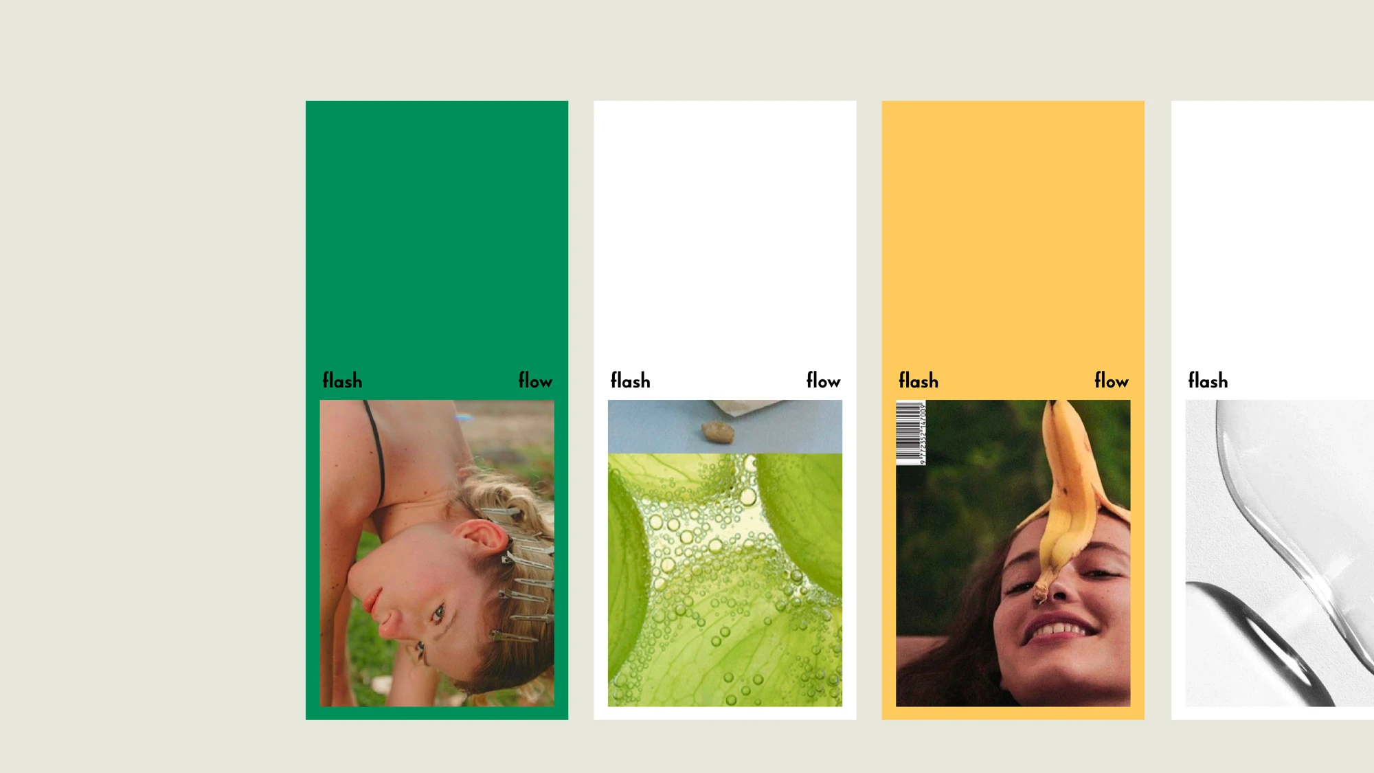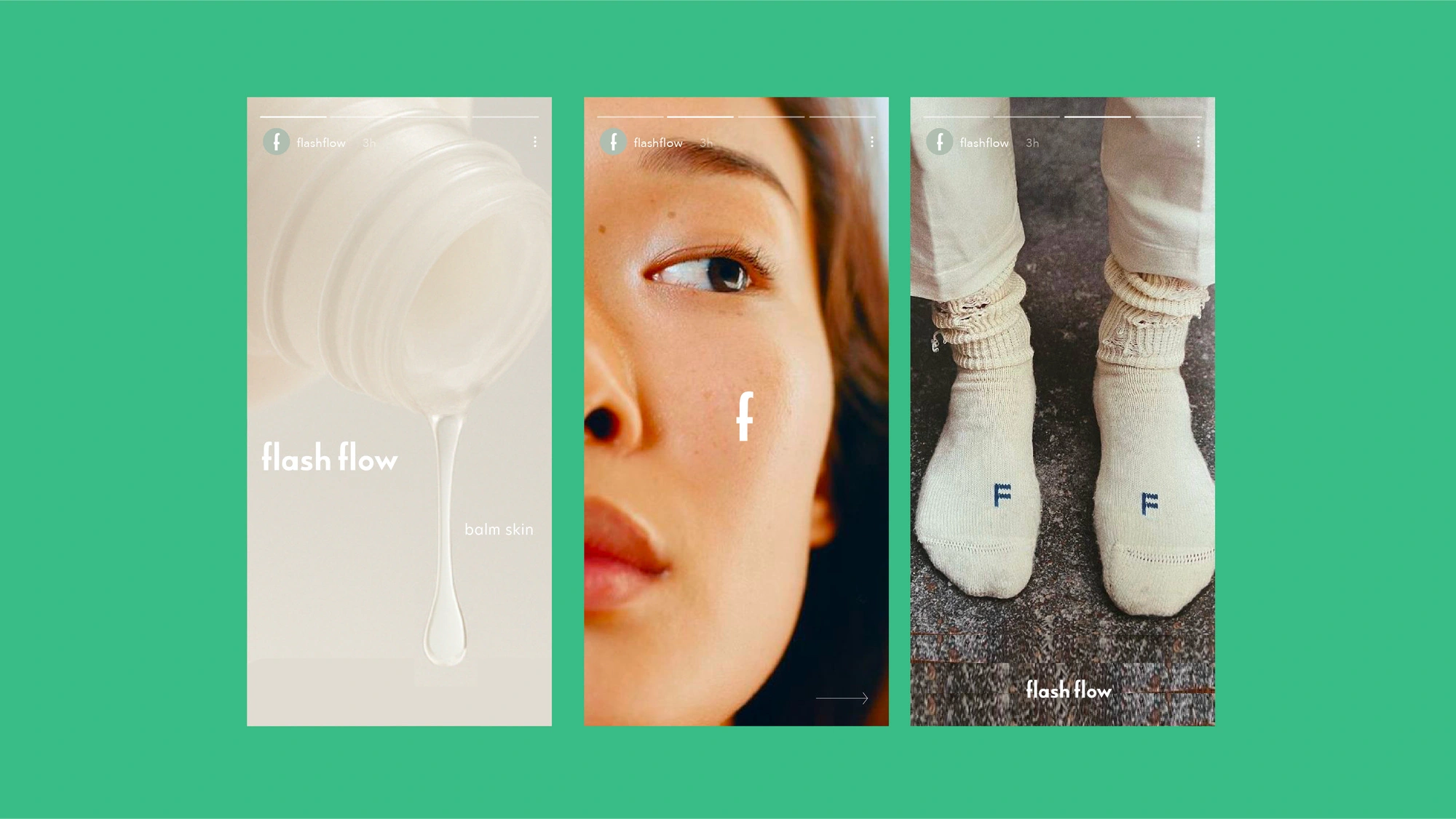 The packaging clearly communicates the product’s key benefit—hydration—while the content visuals explore imagery associated with the name Flash Flow, such as bursts of light, shimmer, movement, and transformation.