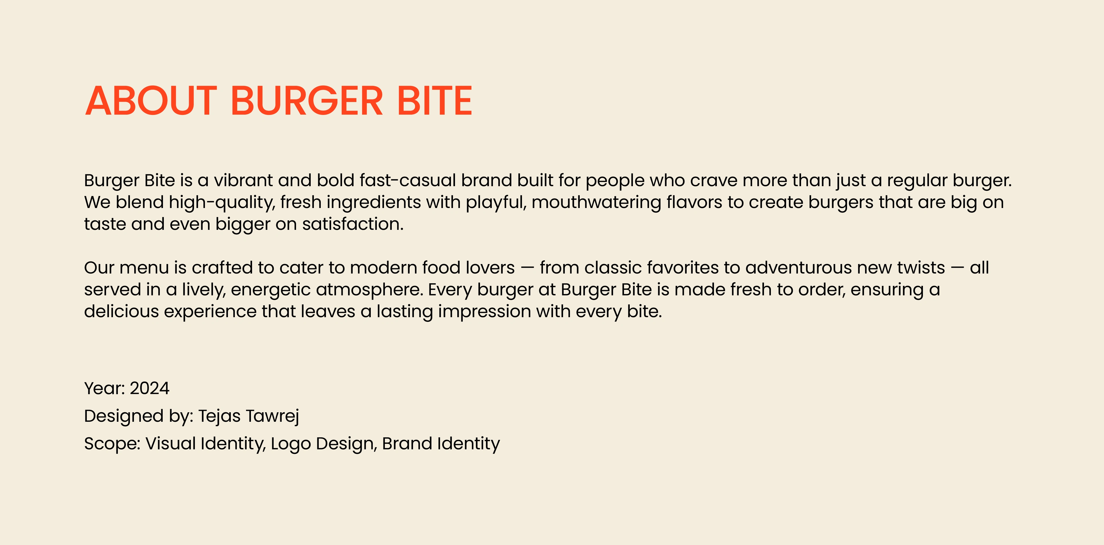 Burger Bite is a vibrant fast-casual brand serving bold and flavorful burgers. To help them stand out in a competitive market, I designed a fresh new logo and full brand identity. The updated visual system reflects their playful, energetic spirit while emphasizing quality, freshness, and a fun dining experience that connects with both new and loyal customers.