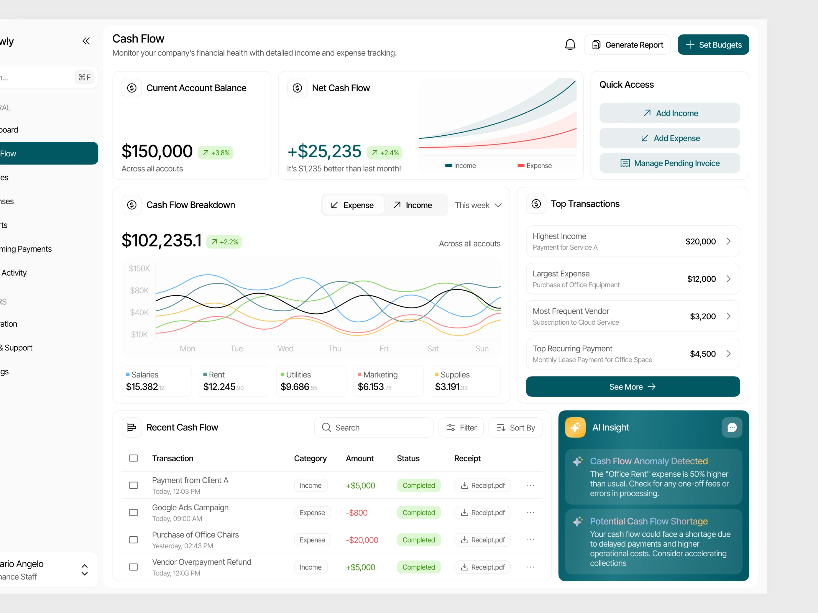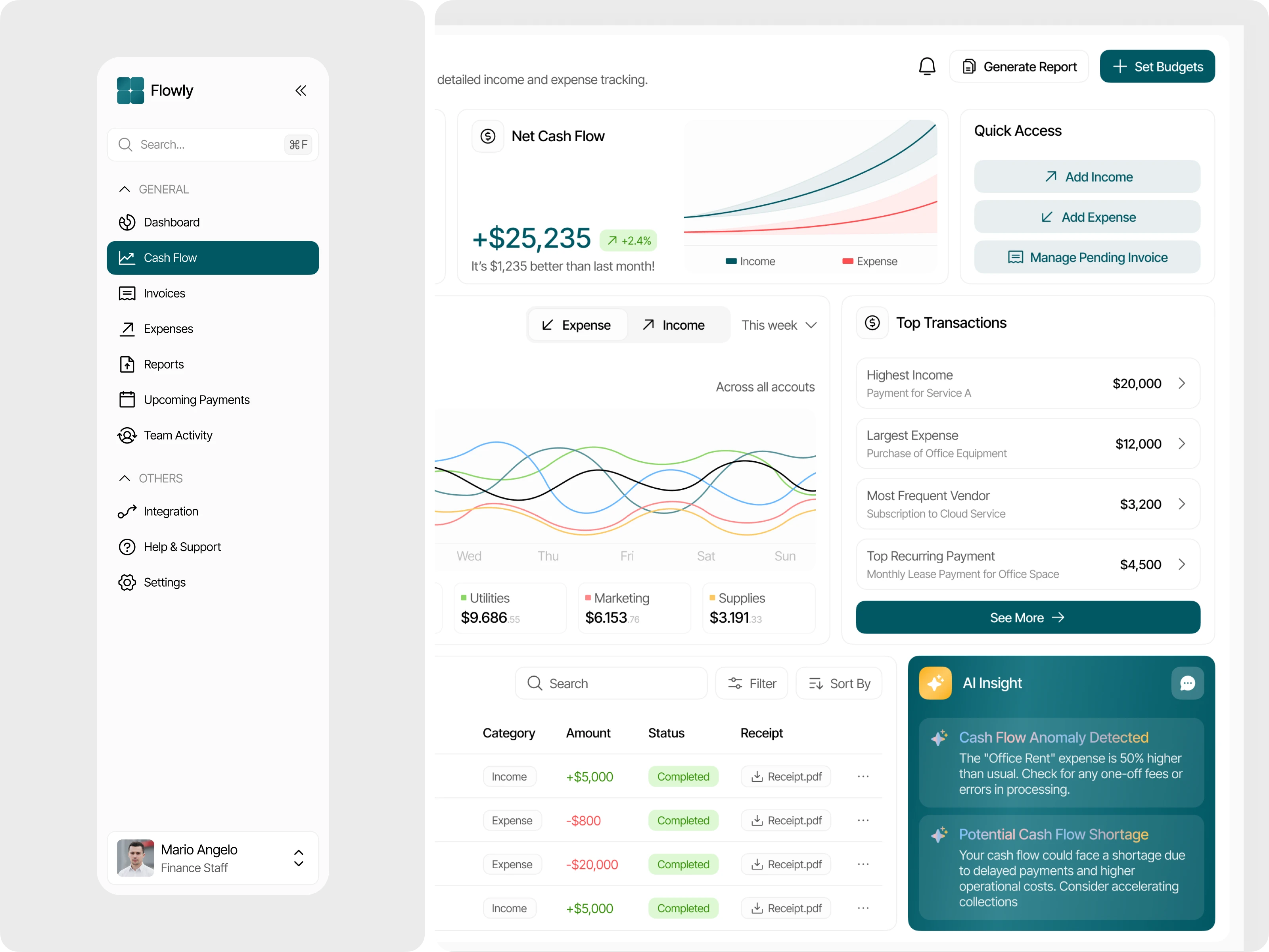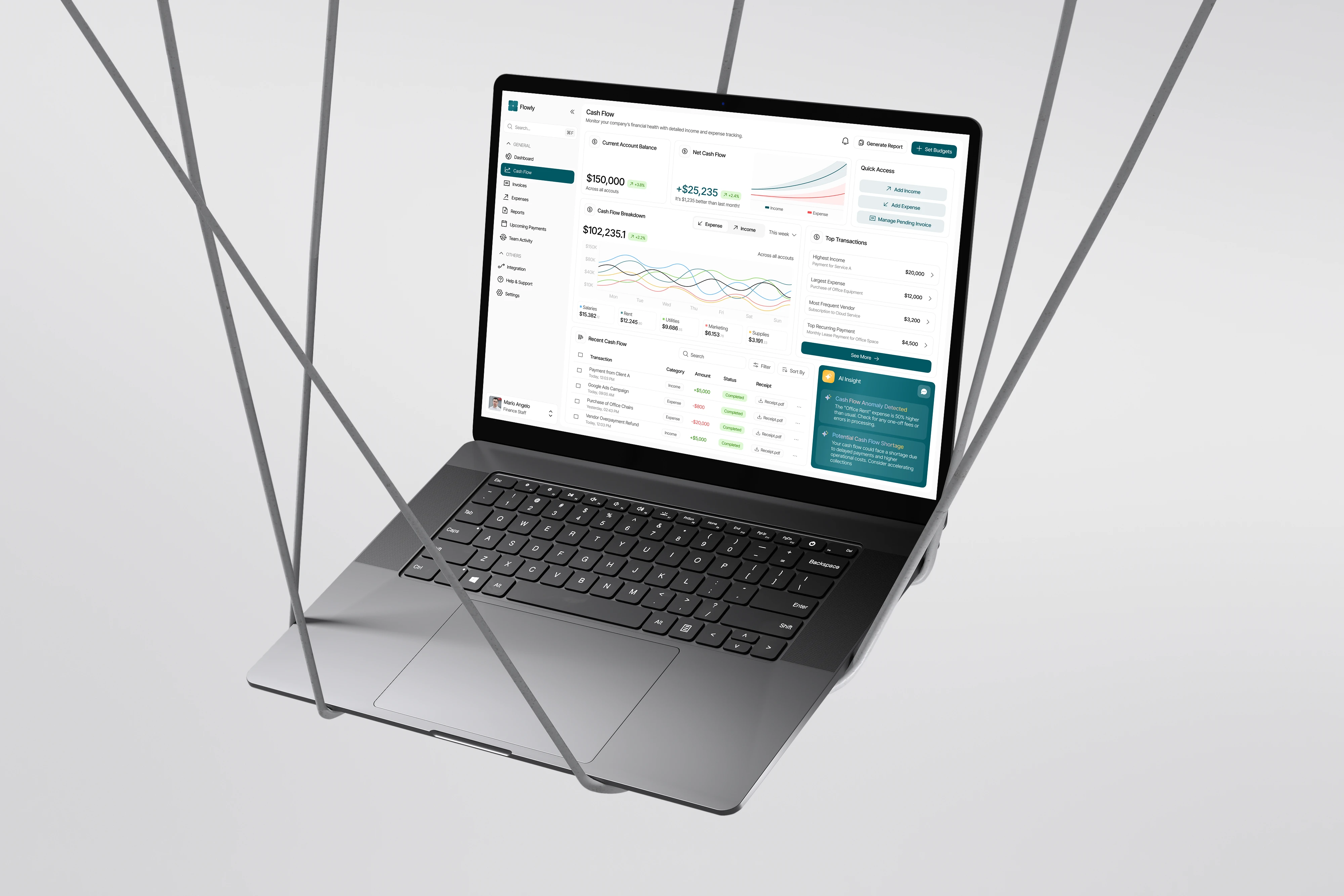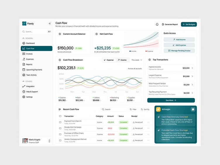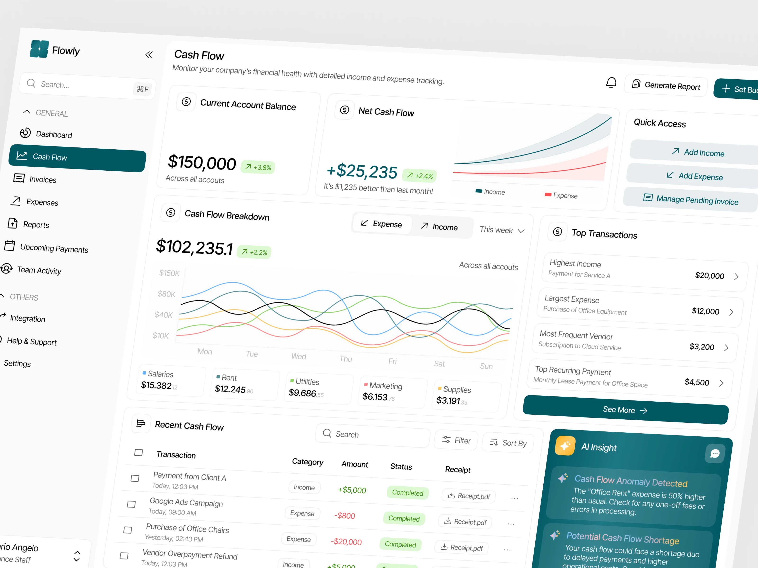 provides a clear and intuitive view of a company’s financial health. It displays key metrics like the current account balance, net cash flow, and detailed cash flow breakdown across different categories. The dashboard highlights recent transactions, top income and expense activities, and offers AI-driven insights to alert users about any financial anomalies or potential cash flow shortages. With quick access to essential financial tools and reports, Flowly helps businesses stay on top of their financial management with ease.