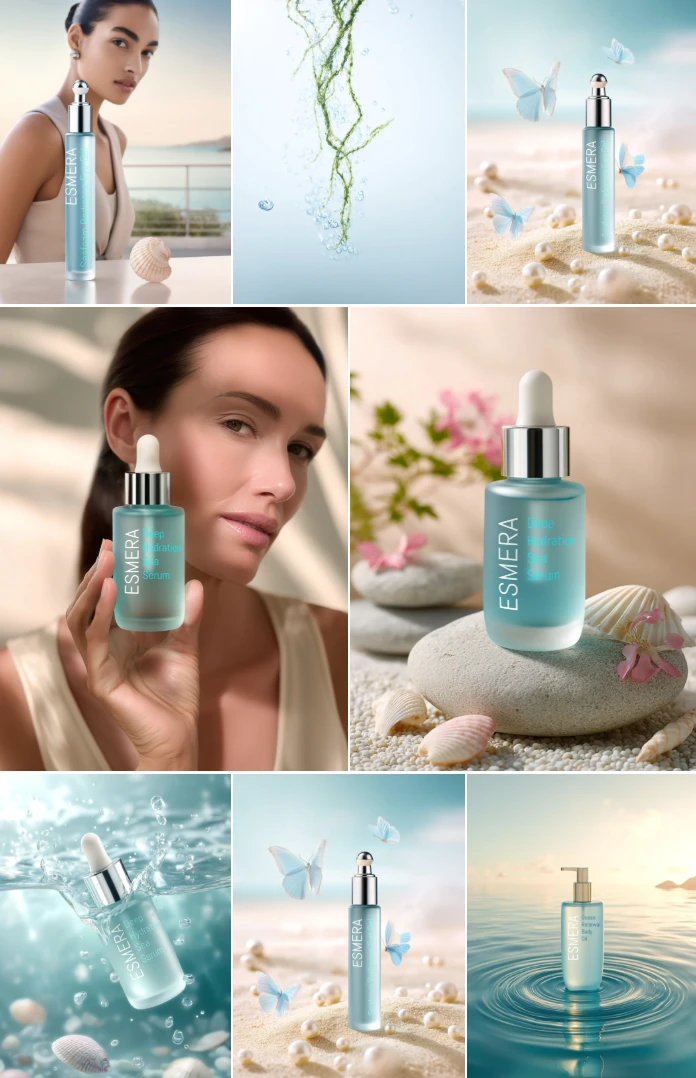 AI brand photography for Esmera, a coastal luxury skincare concept. Consistent visuals that capture ocean freshness, spa-like calm, and a polished premium look.