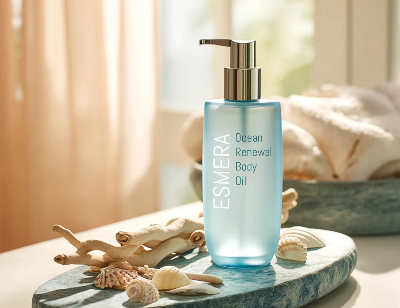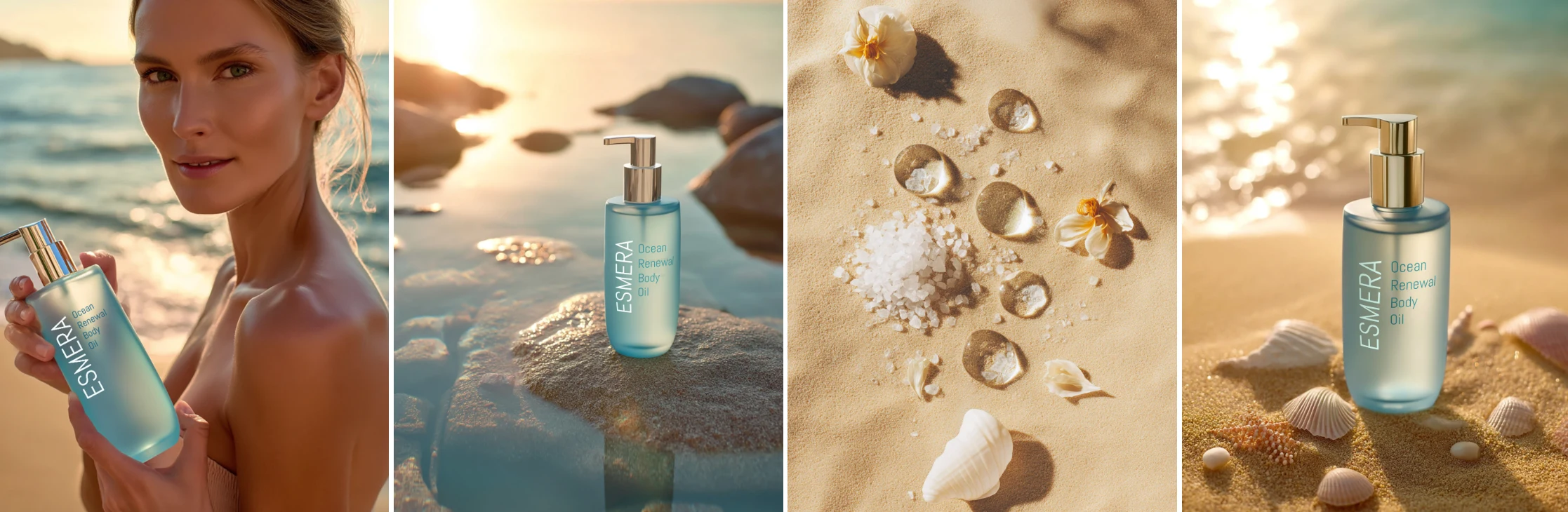 The final set feels like a cohesive brand story. Whether it’s a product on the shoreline, drops of oil glistening in the sand, or a lifestyle portrait, every image ties back to Esmera’s coastal luxury identity.