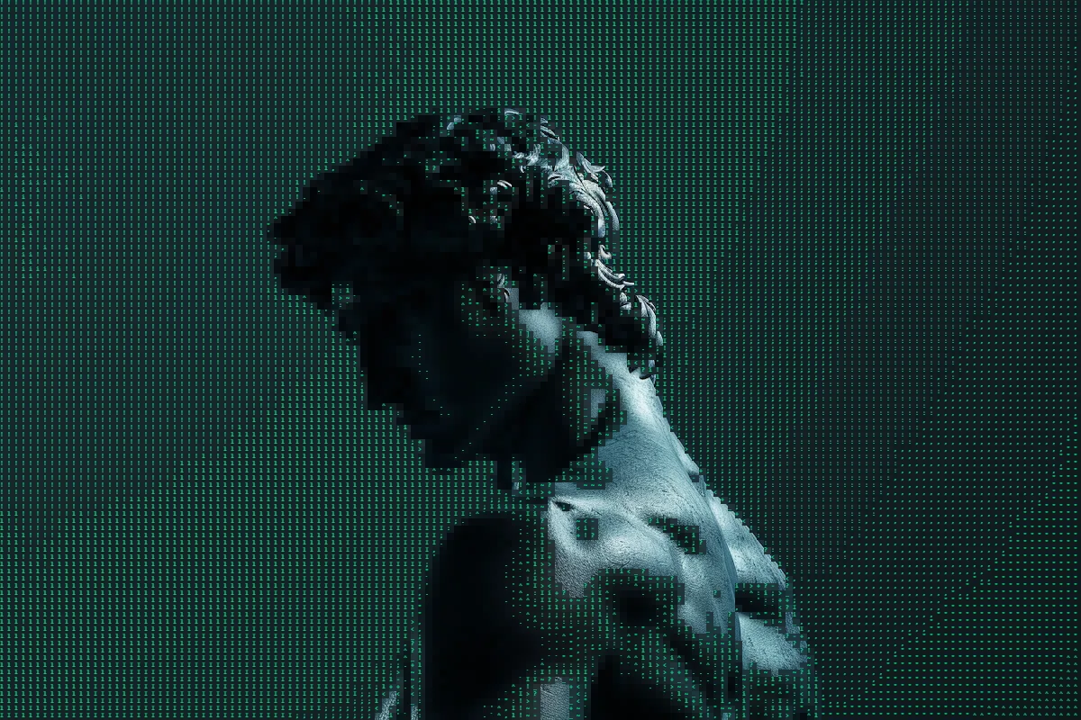 Greek and Roman statuary was the ancient world's attempt to make authority physical — to carve law, virtue, and power into a material that would outlast the people who commissioned it. Dithering is what happens when you attempt to reproduce that permanence through a machine with finite resolution. The algorithm cannot hold the marble. What remains is still recognizable, still weighty, but marked by the attempt at transmission.