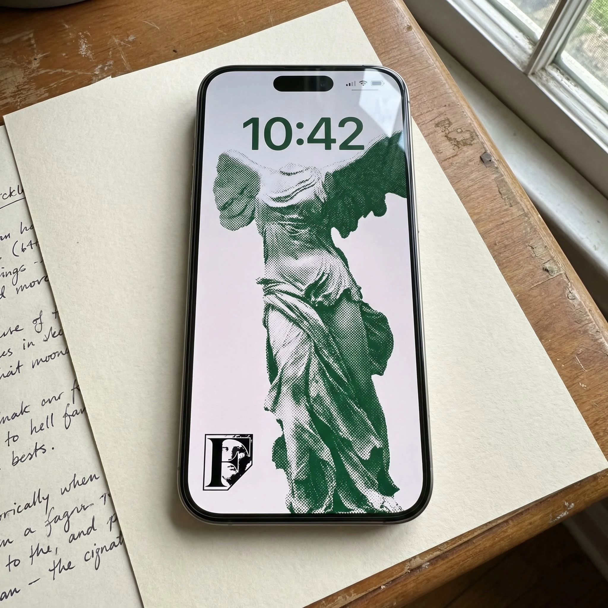 Phone lock screen — The Nike of Samothrace in dark green halftone on pale ground. The logo at bottom-left. The time reading 10:42. The piece that confirms the brand translates to every surface without losing its register.