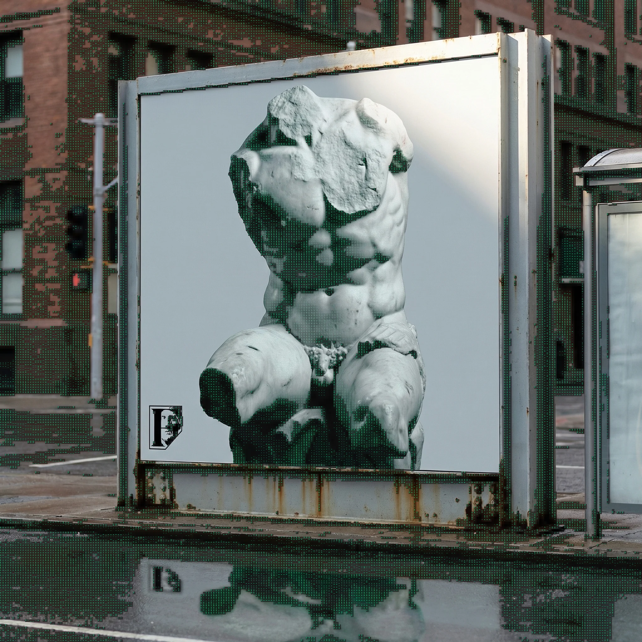 Billboard — The Belvedere Torso, headless and armless, on a rusting steel street billboard, wet pavement reflection below. No copy except the logo. The fragment as a statement: what survives is what was made to last.