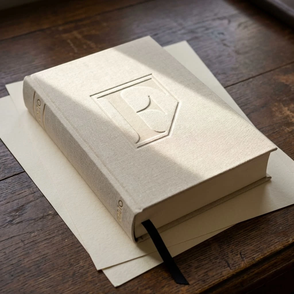 Hardcover brand manual — Natural linen cloth, blind-debossed logo on the cover, gilt FOLIO on the spine, black grosgrain ribbon. The manual itself as a physical argument for the brand's premise: documents are objects, objects have weight.