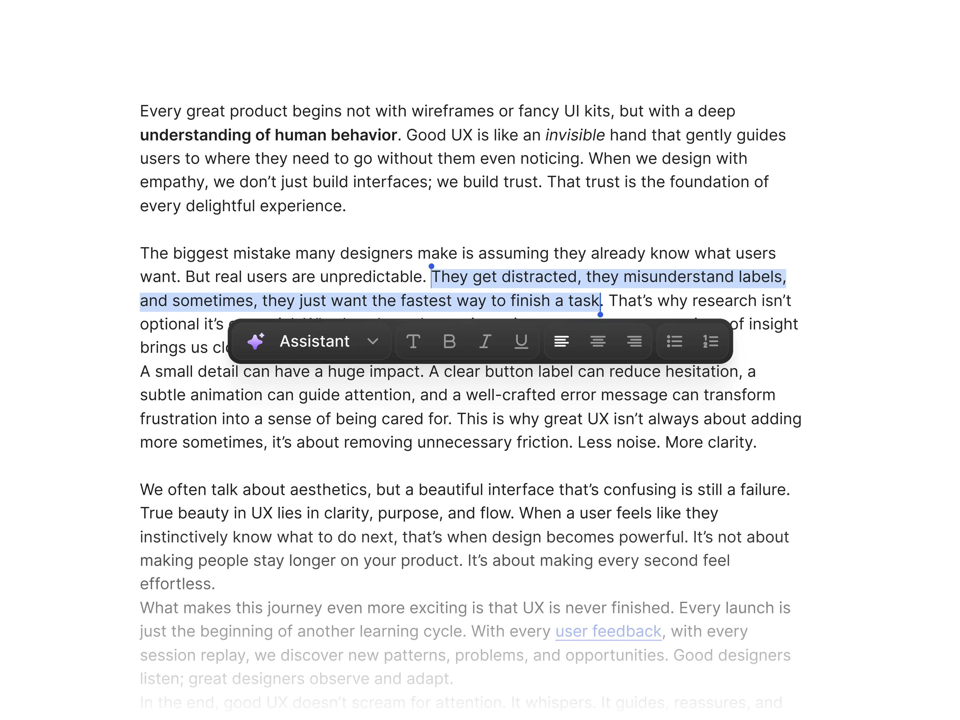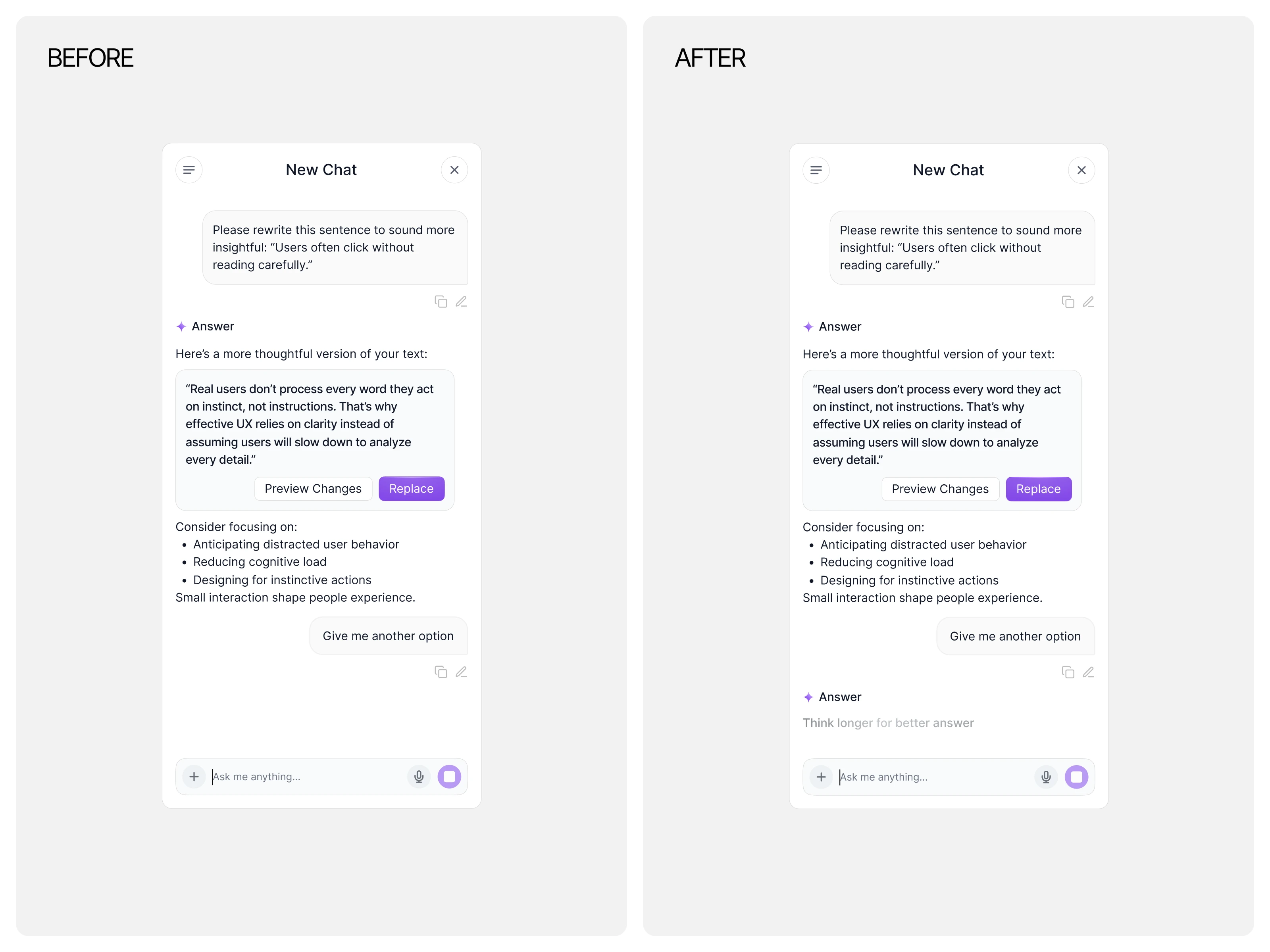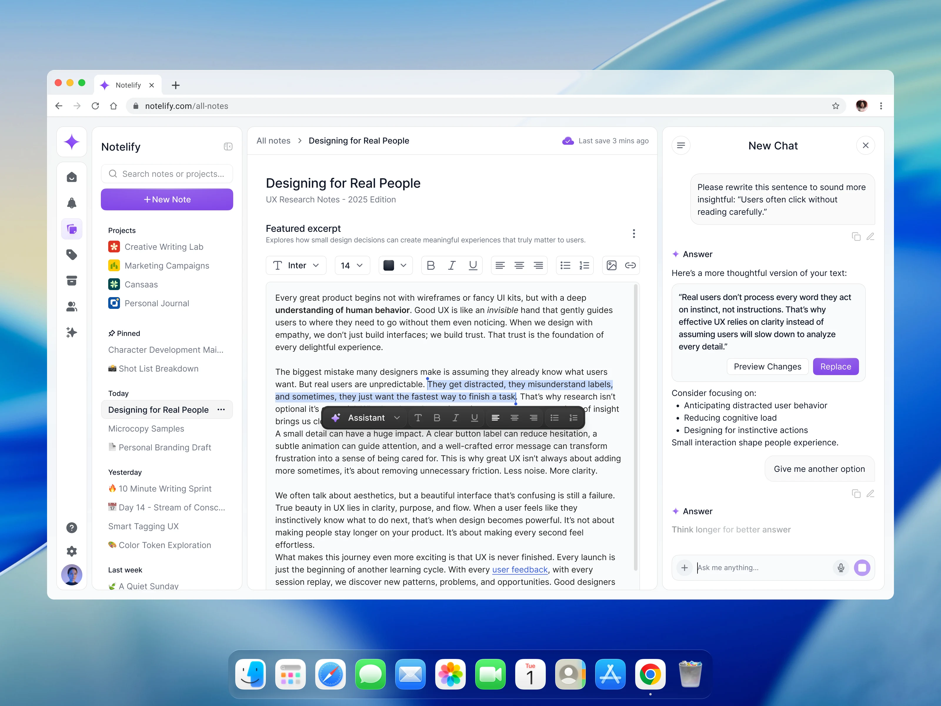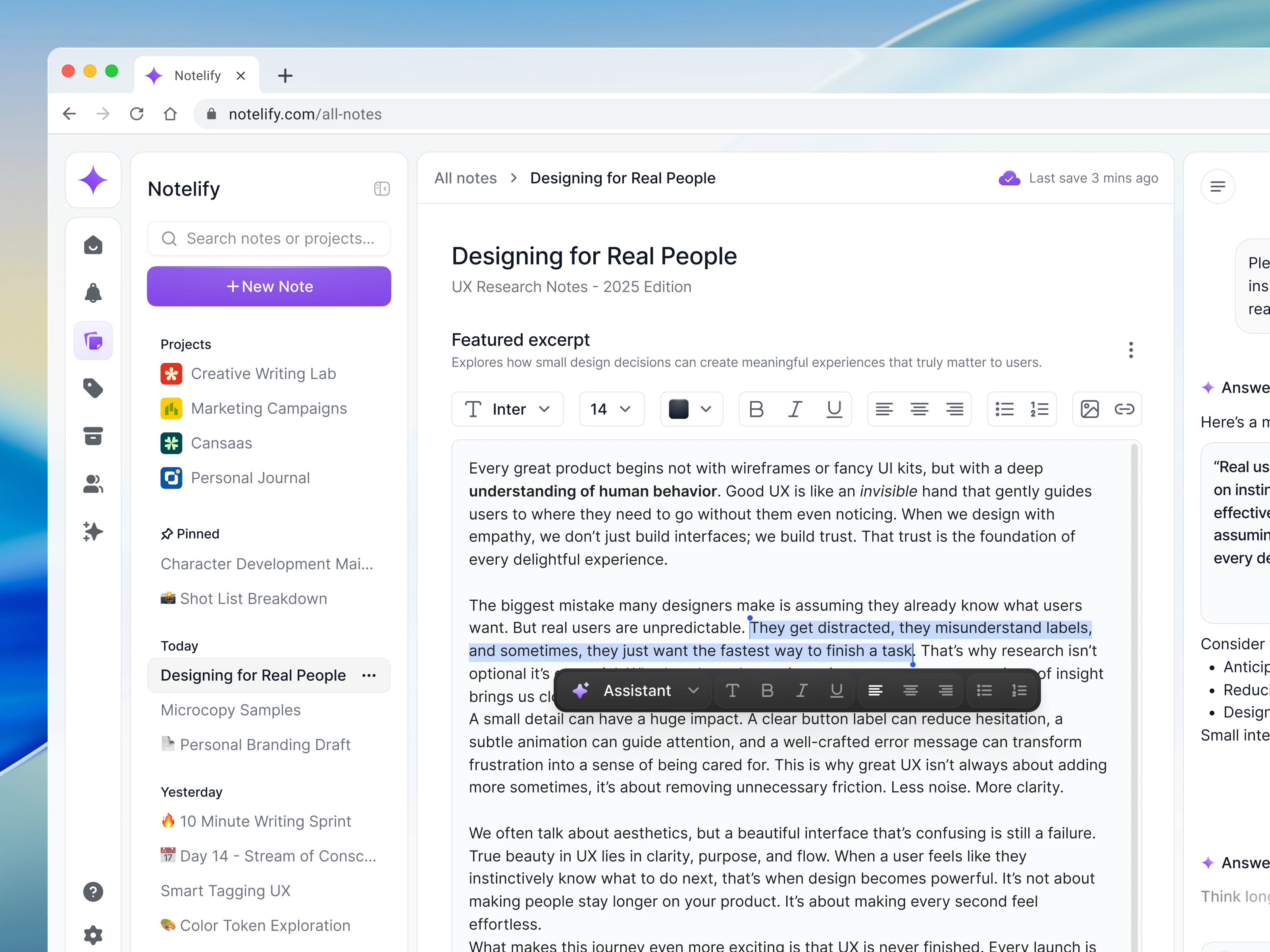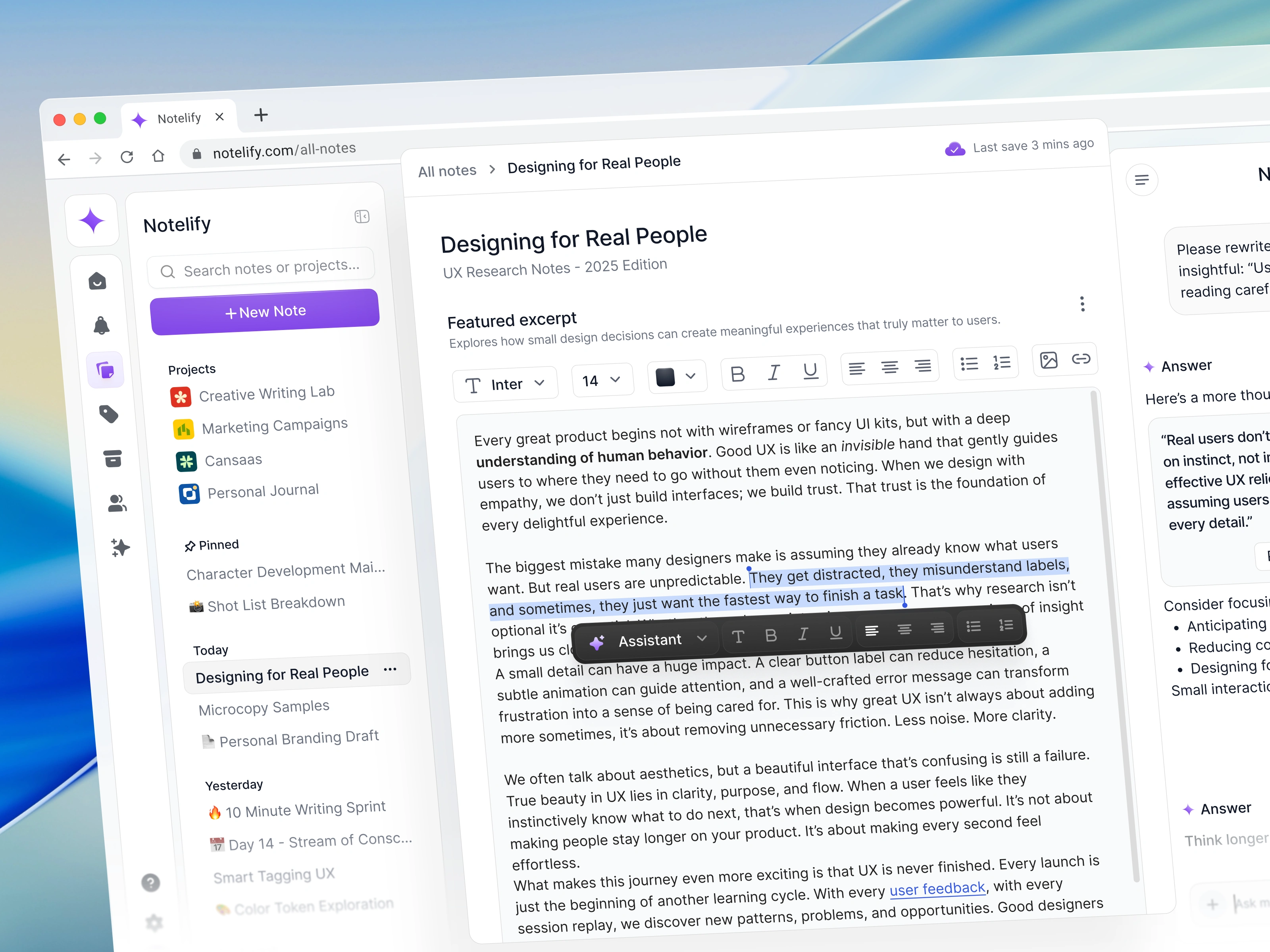 Traditional writing tools often fall short when it comes to turning raw thoughts into refined, high-quality content. Users switch between apps, copy-paste drafts, and lose focus due to fragmented workflows. The challenge was to create an environment where thinking, editing, and AI refinement coexist in a single, uninterrupted space.