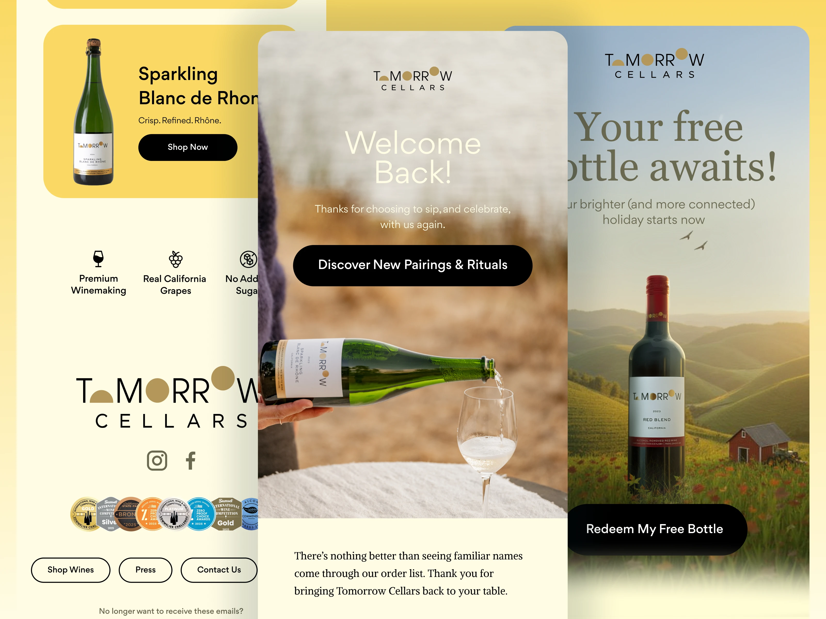 I designed conversion-focused emails and promos for Tomorrow Cellars, creating warm, elegant experiences that drive discovery and reward redemption.