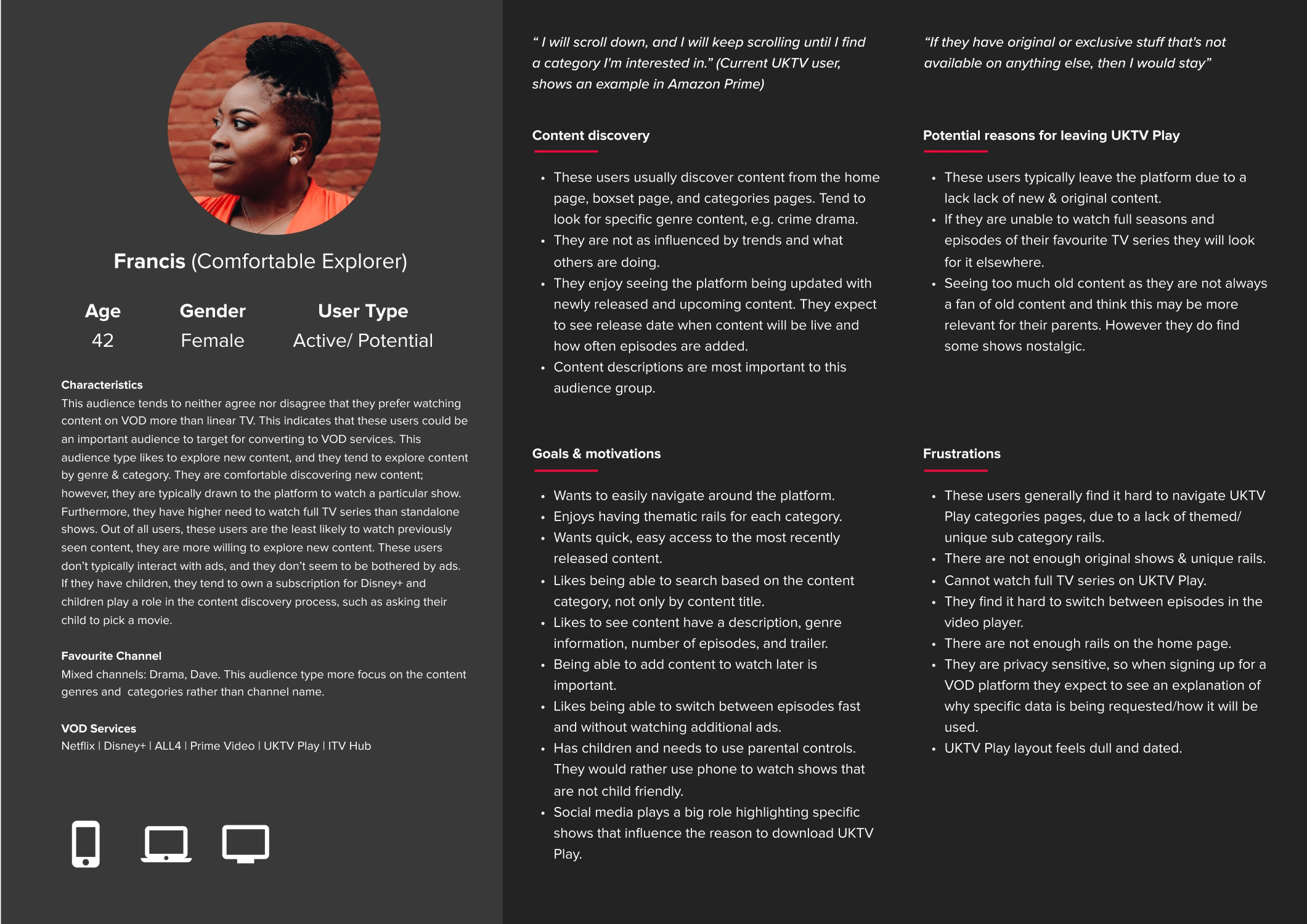 We spoke with 18 participants, including current and potential UKTV Play users, to uncover their habits, frustrations, and expectations. Accessibility insights also played a key role in shaping our findings.