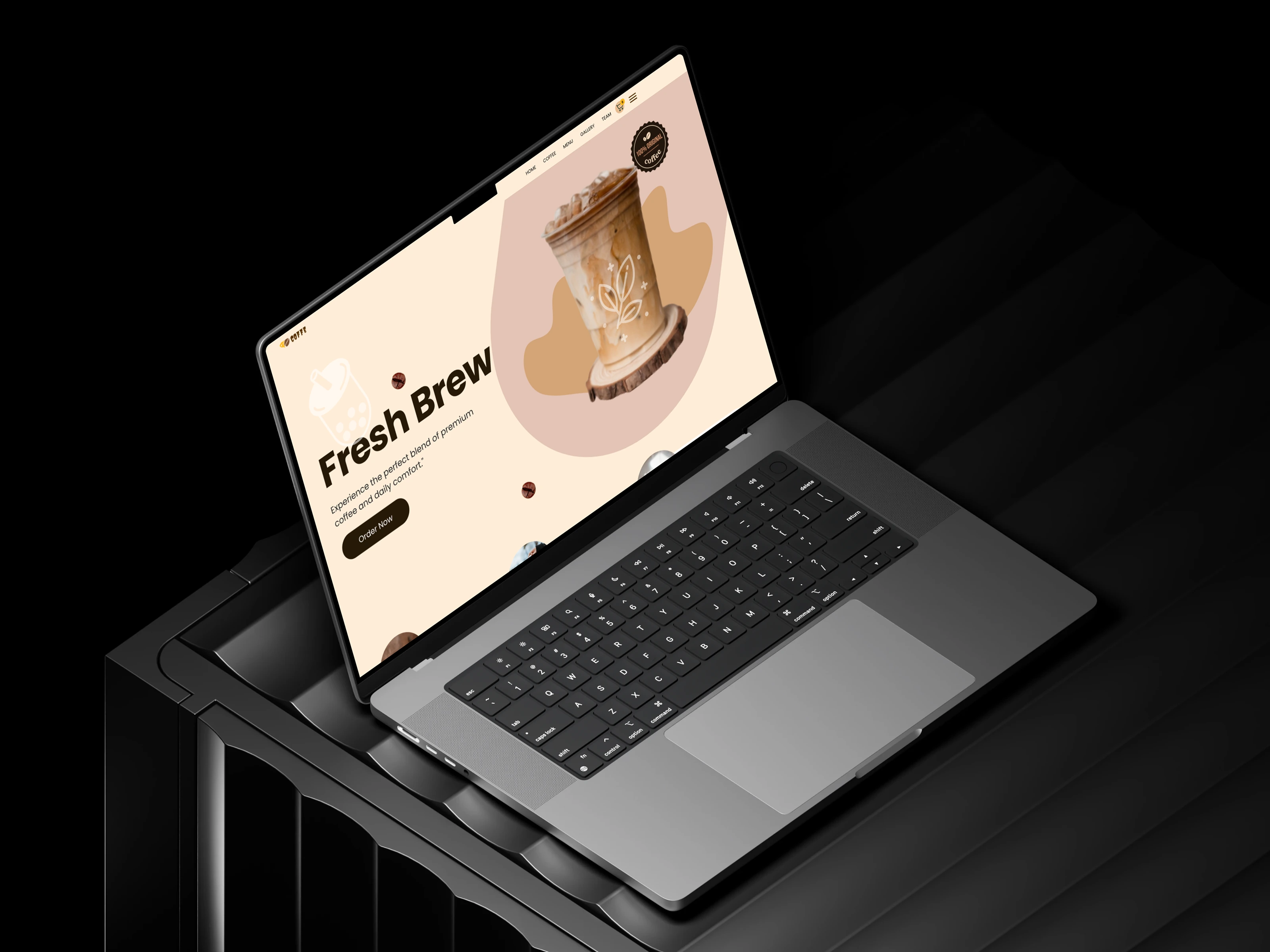 A soft cream palette, organic shapes, and rich coffee photography work together to create an atmosphere that feels like walking into the shop itself. The hero section doesn't just announce the brand, it pulls you in with a bold headline, a hero drink, and a single clear action. From there, the page builds trust naturally through product highlights, the brewing process, and a community events section that reminds visitors this is more than just a coffee shop.
