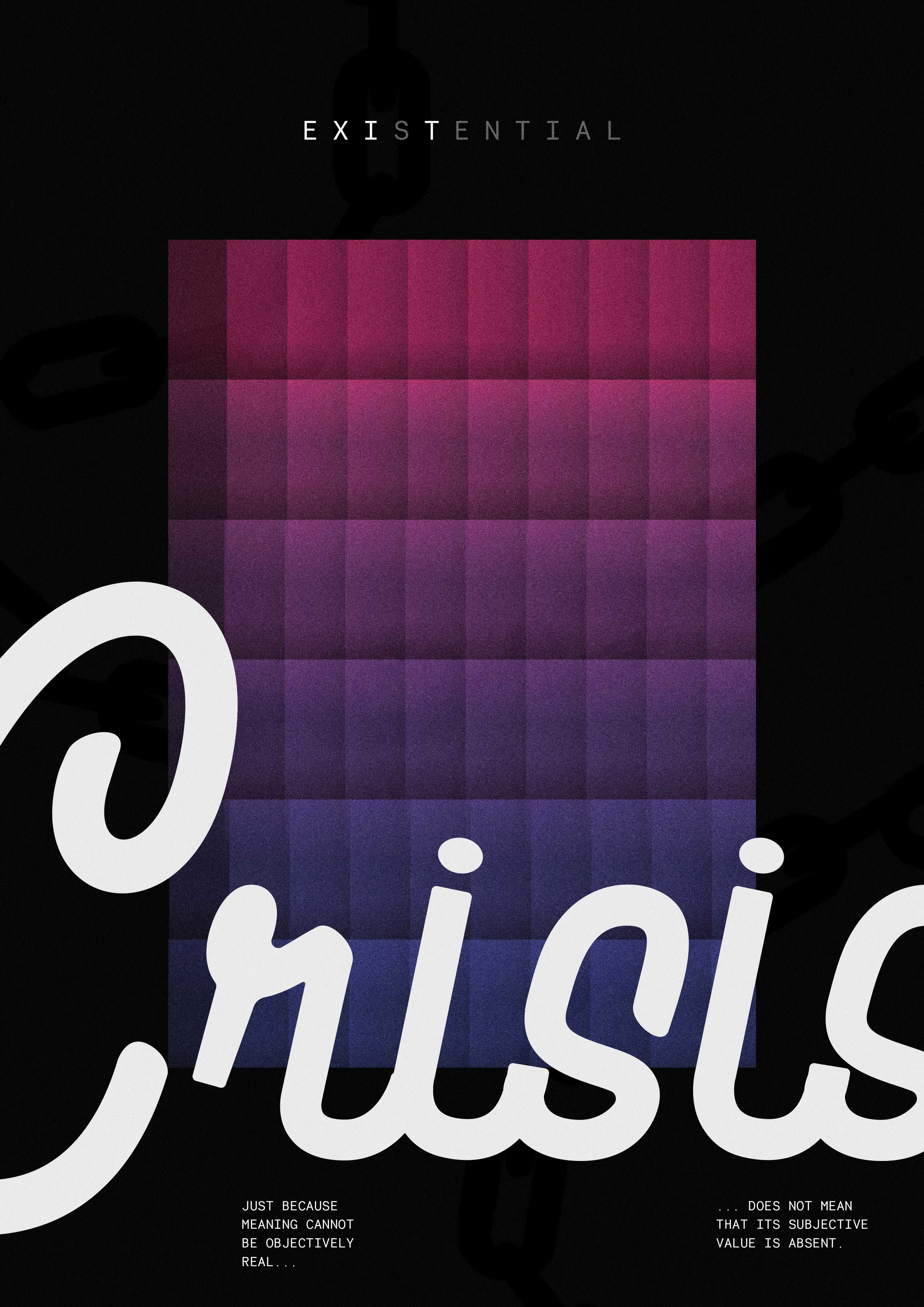 A minimalist poster titled 'Existential Crisis,' with a gradient grid and bold typography, symbolizing inner conflict. Subtle chain elements and philosophical text add depth to the design.