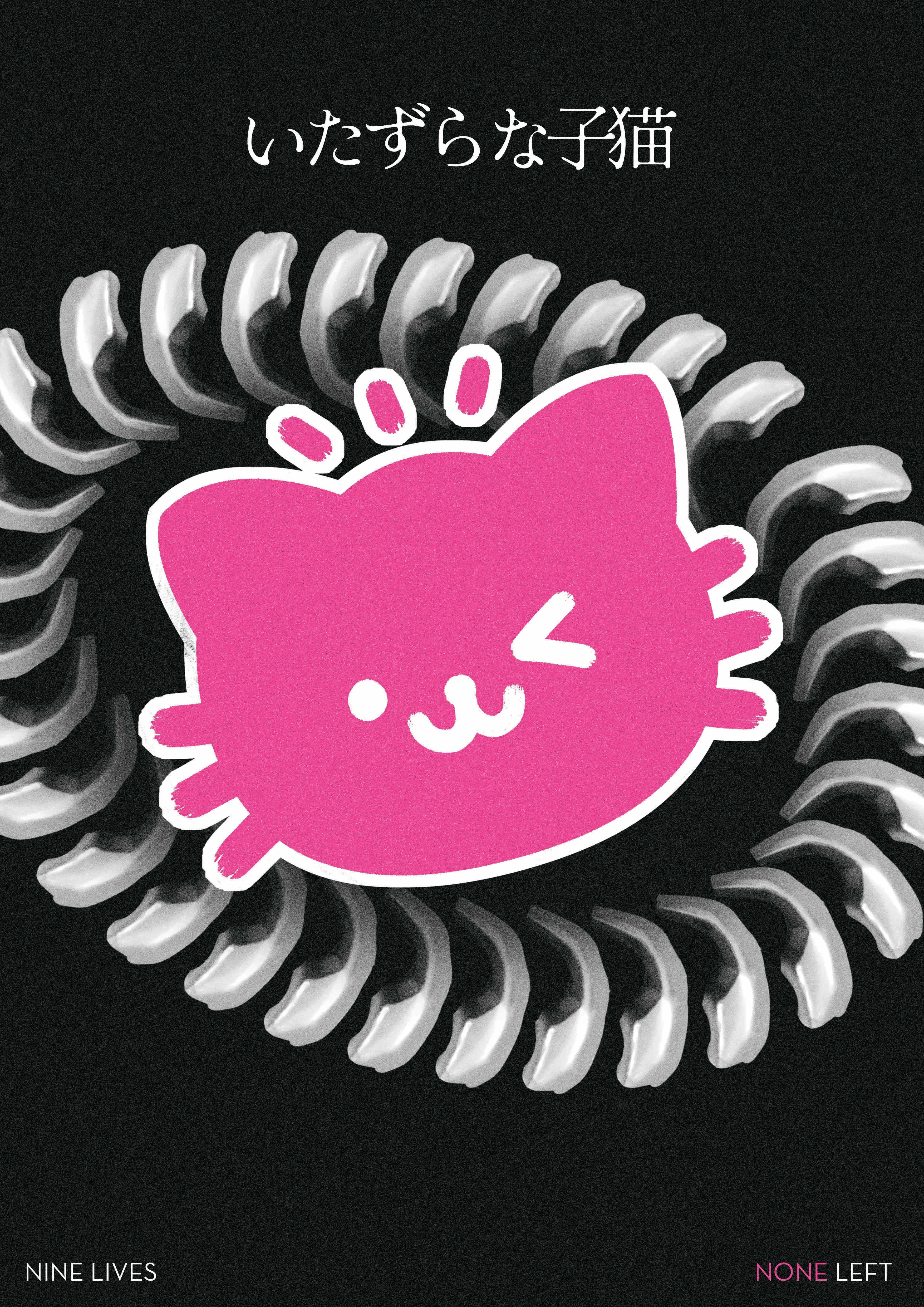 A playful yet striking poster featuring a bold pink, winking cat graphic against a hypnotic monochrome spiral. The Japanese text and contrasting colors give it a whimsical, edgy vibe, blending cuteness with a darker undertone.