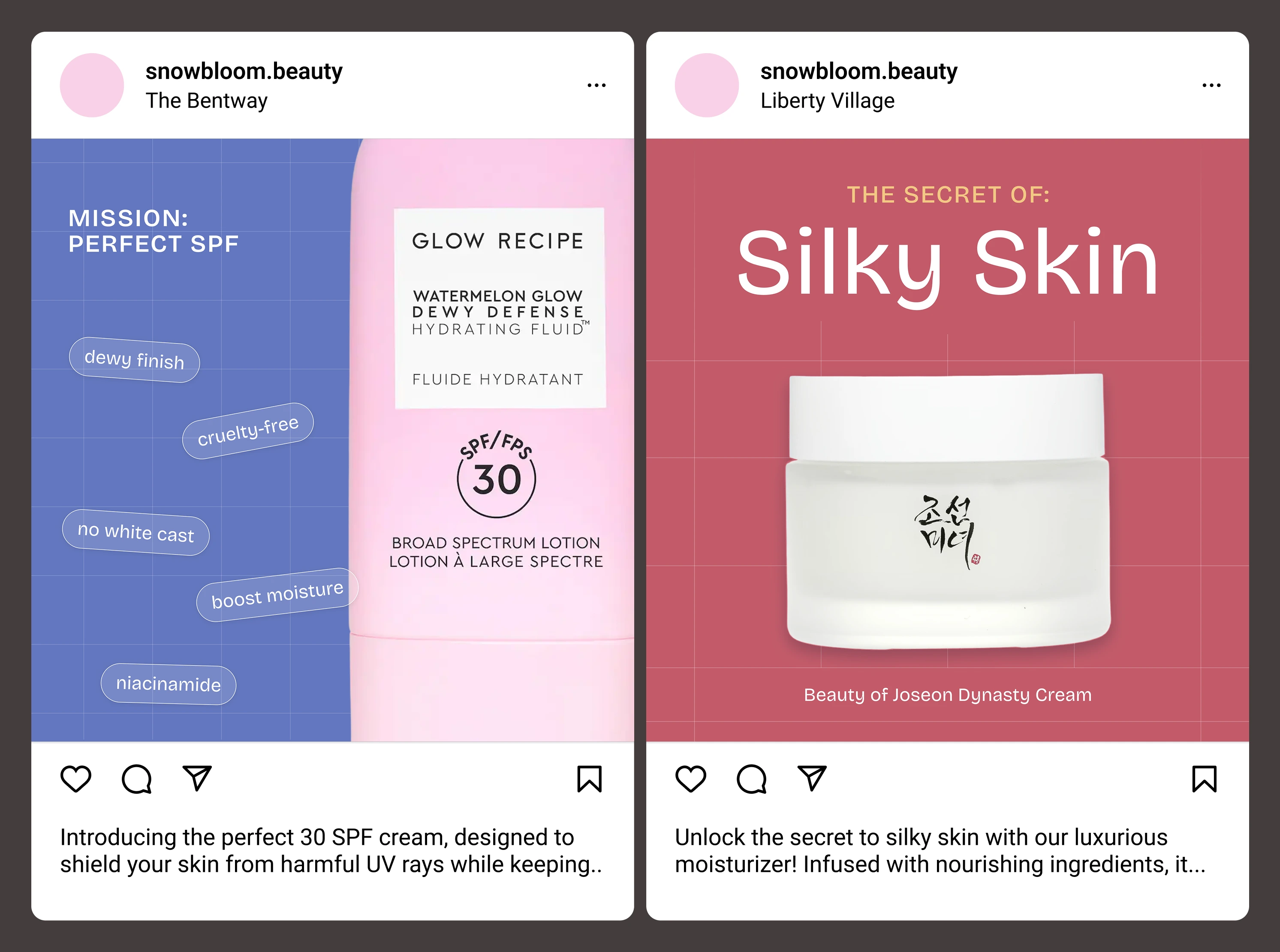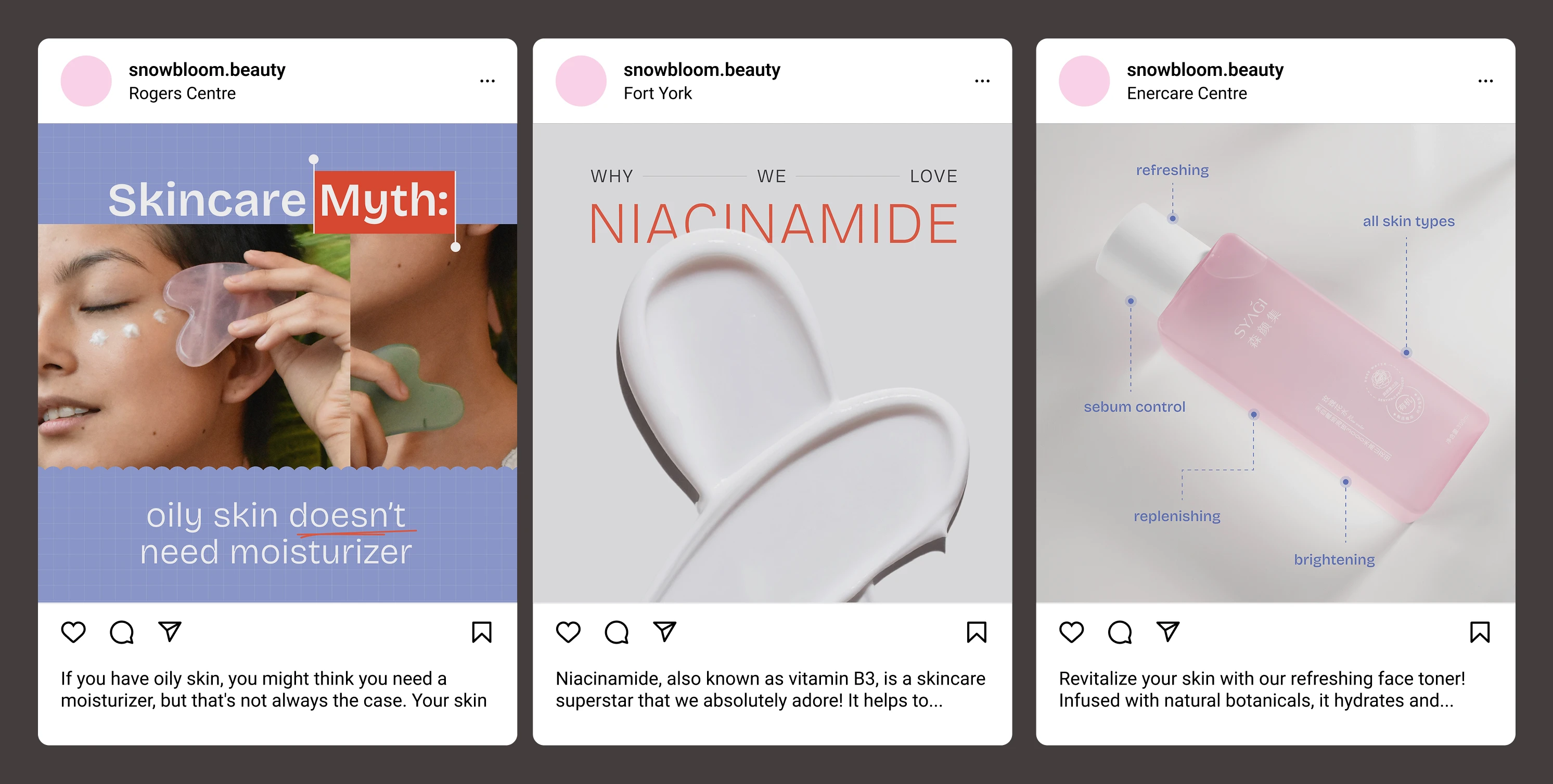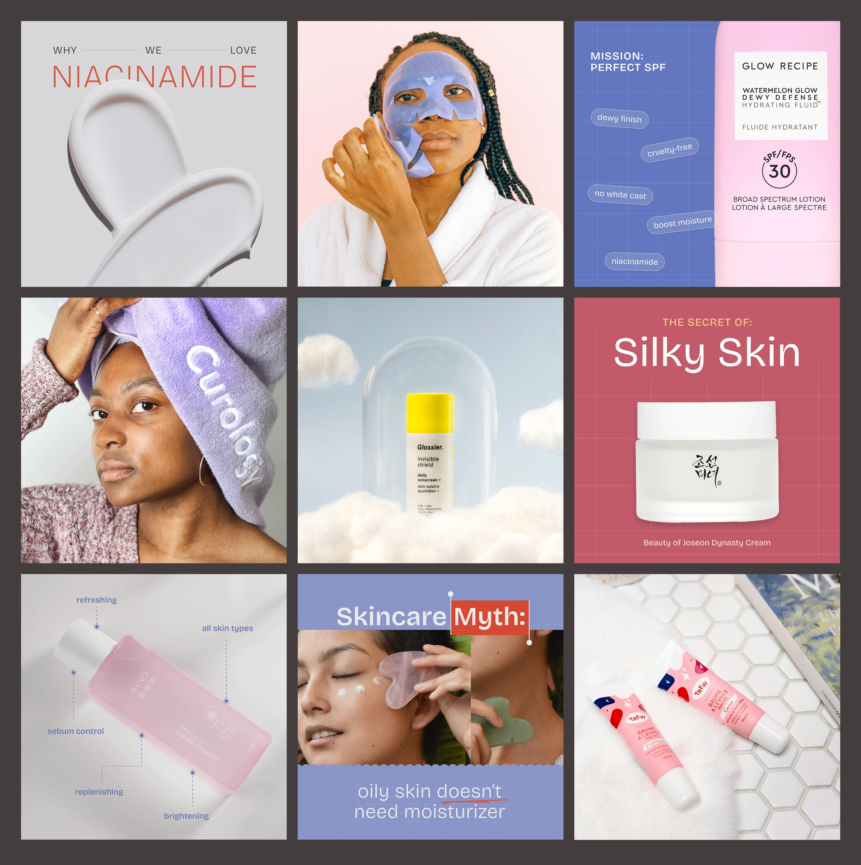 IG grid for a skincare brand to make their feed informative and eye-catching. The posts mix product highlights, skincare tips, and fun myth-busting content.