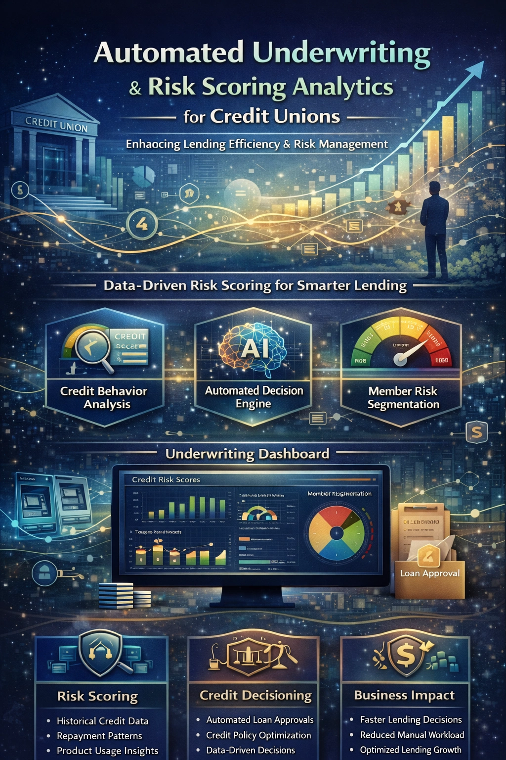 The solution leveraged historical credit behavior, repayment patterns, and member product usage data to generate member-level predictive risk scores. These scores were designed to integrate seamlessly into existing underwriting workflows, minimizing the need for major system or policy changes.