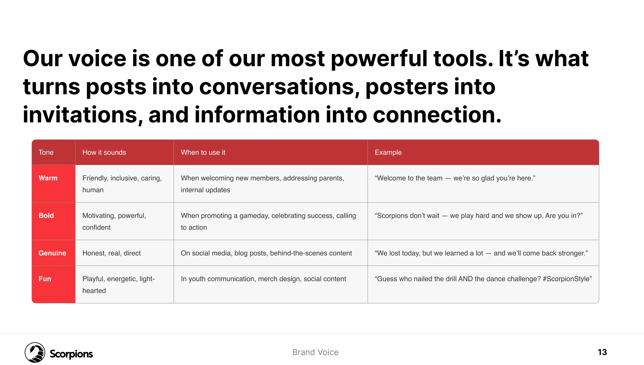 The Challenge: The Scorpions already had a logo, but no visual system, rules, or structure. Everything — from posters to uniforms to social media — had been done inconsistently and without clear direction. We couldn't redesign the logo completely, but we could evolve it. And that’s exactly what we did.