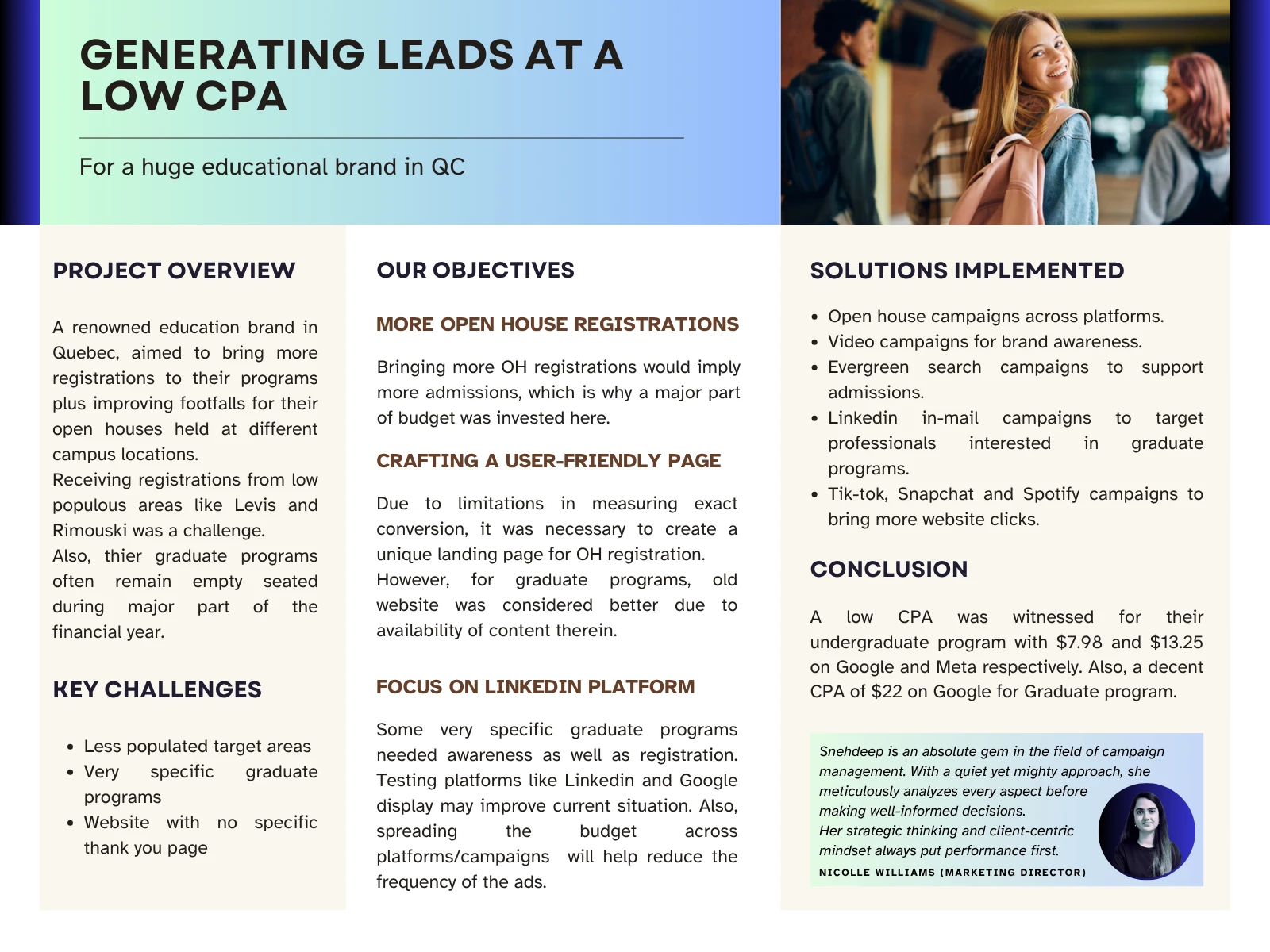 A renowned education brand, aimed to bring more registrations to their programs and improving footfalls for their open houses held at various campus locations.
