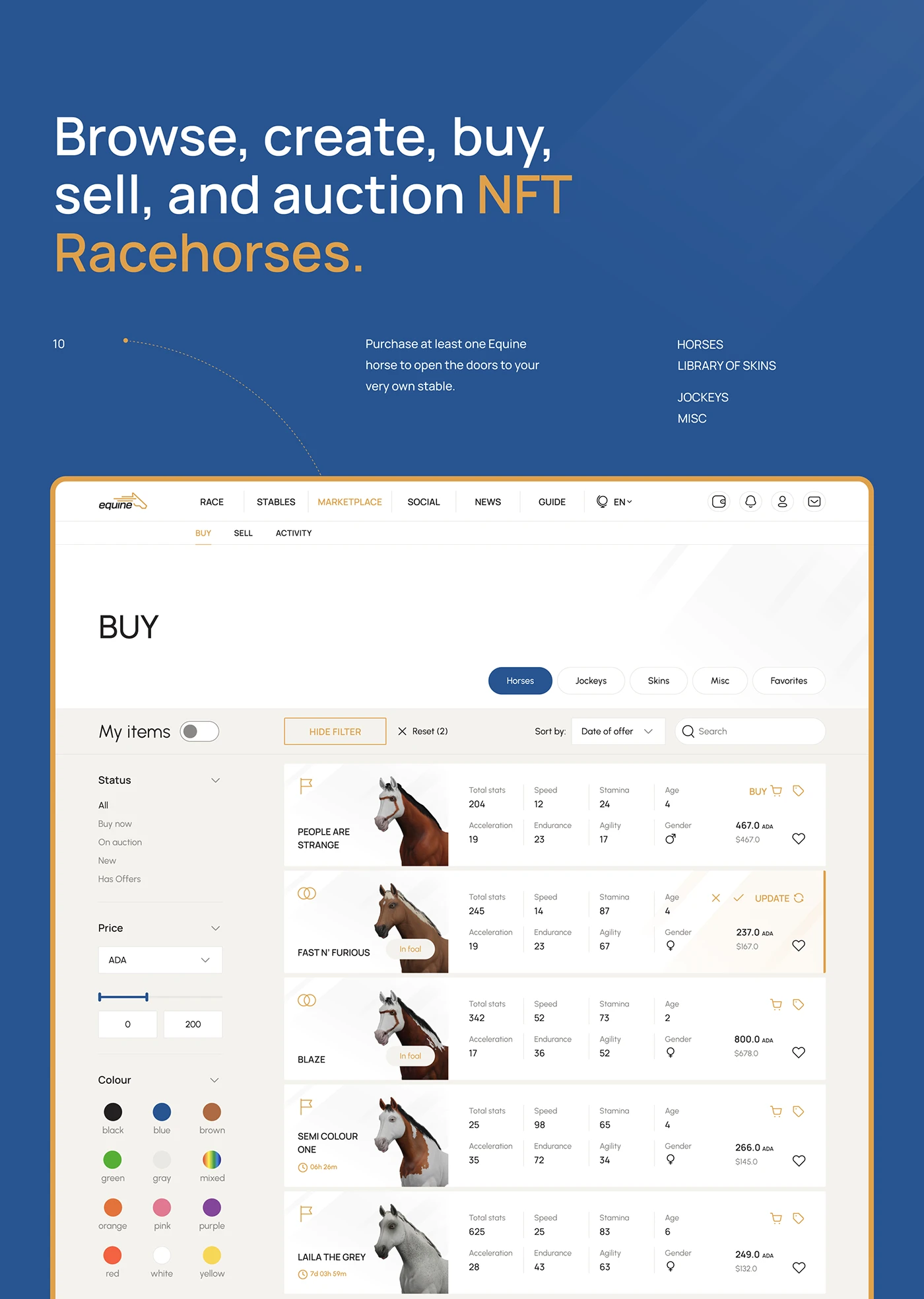 Equine is a racehorse management game that’s enriched with imaginatively fun content, yet grounded in reality. It’s an NFT-based platform that runs exclusively on the Cardano blockchain.