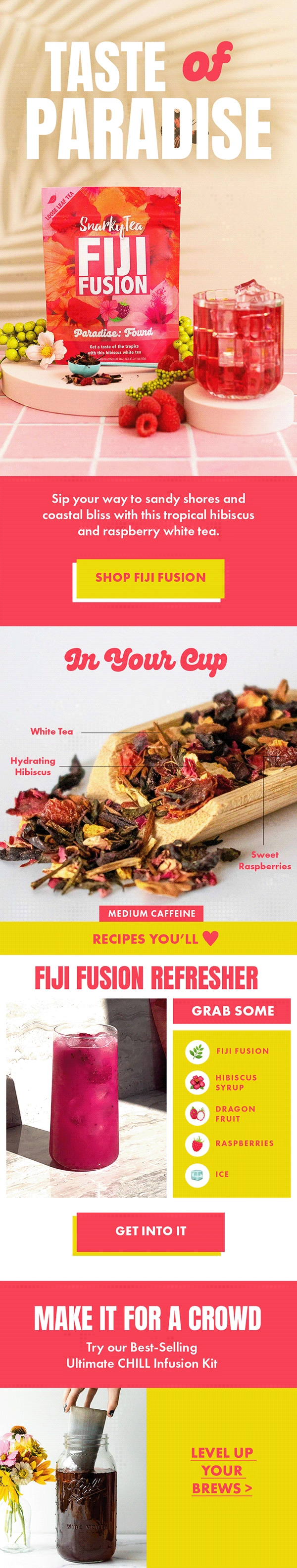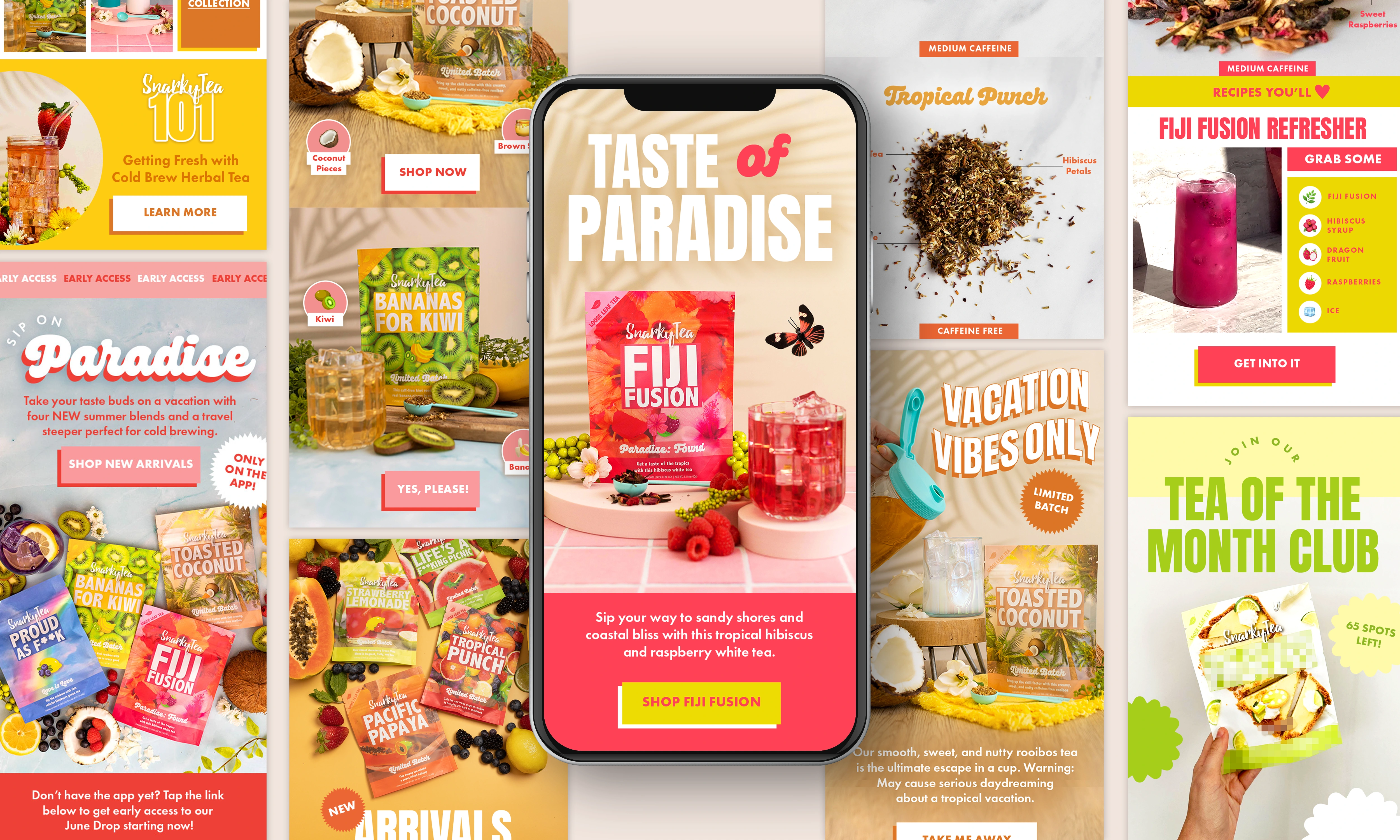 •Bright, tropical color schemes and playful typography to evoke a sense of fun and adventure, inviting customers to “Sip on Paradise.”