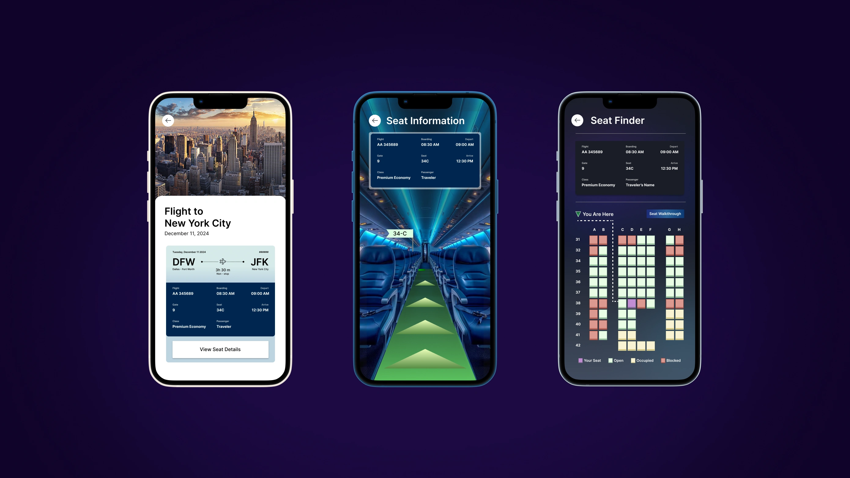 This screen shows a live seat map with the passengers current location, their assigned seat, and blocked/occupied seats. This helps travelers quickly orient themselves, which reduces delays from seat confusion.