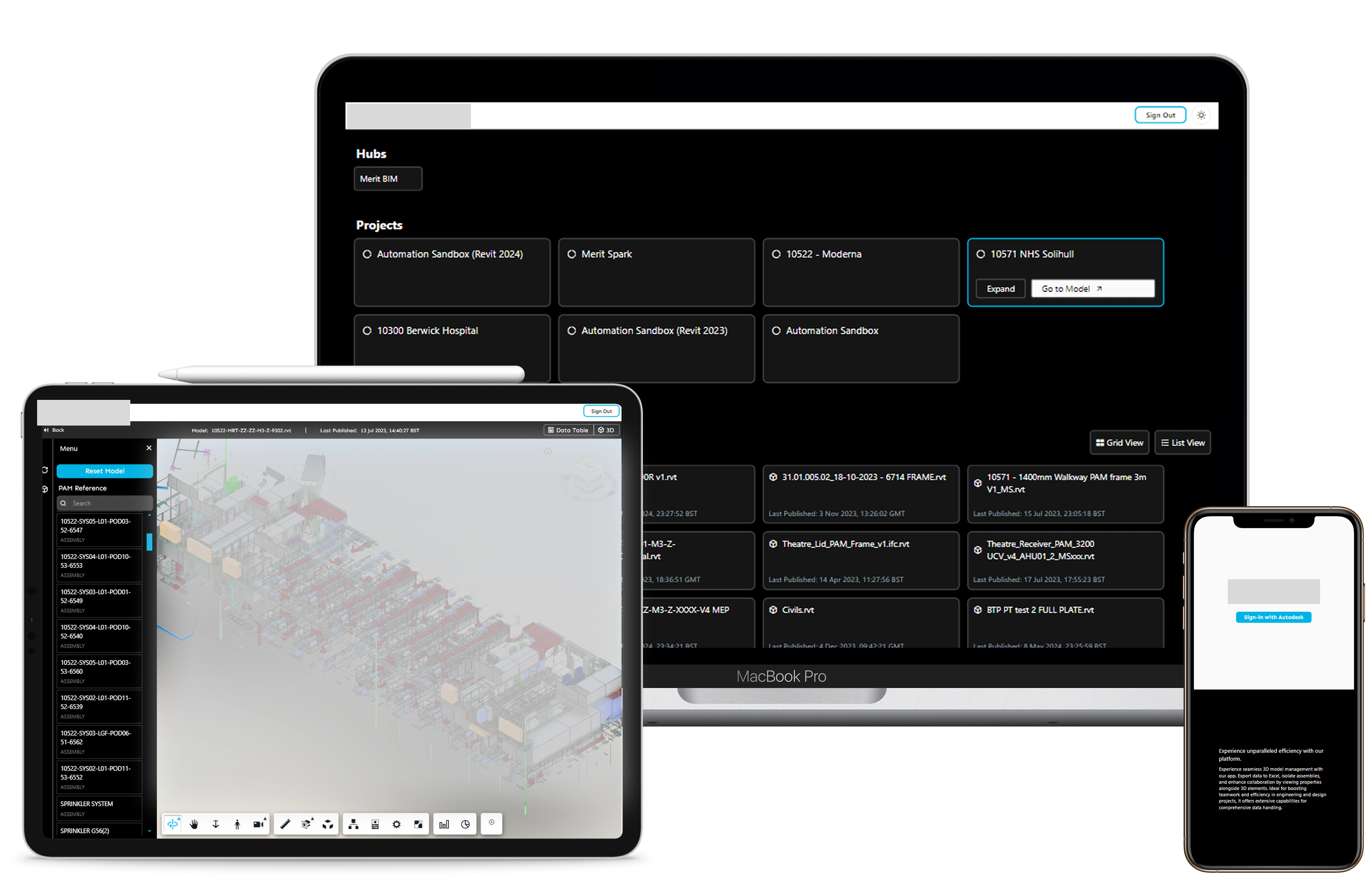 Spark Construct is a secure, web-based 3D model management application built on Autodesk Platform Services and hosted on private endpoints for enterprise data security. Designed for engineering, construction, and manufacturing teams, it enables seamless BIM360 model access, visualization, and collaboration—without requiring Revit licenses or advanced technical skills. The application is fully responsive, ensuring seamless access and functionality across mobile, tablet, and desktop devices, optimizing flexibility in diverse work environments.
