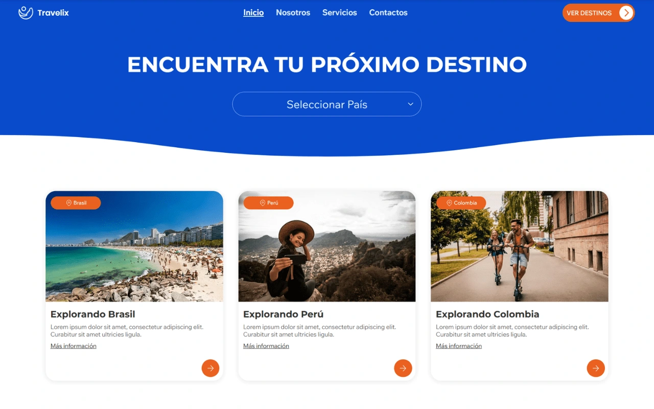 Sitio web para Agencia de viajes, cuenta con sistema para subir destinados y filtros de búsqueda para filtrar destinos por país. Puede adquir como plantilla.