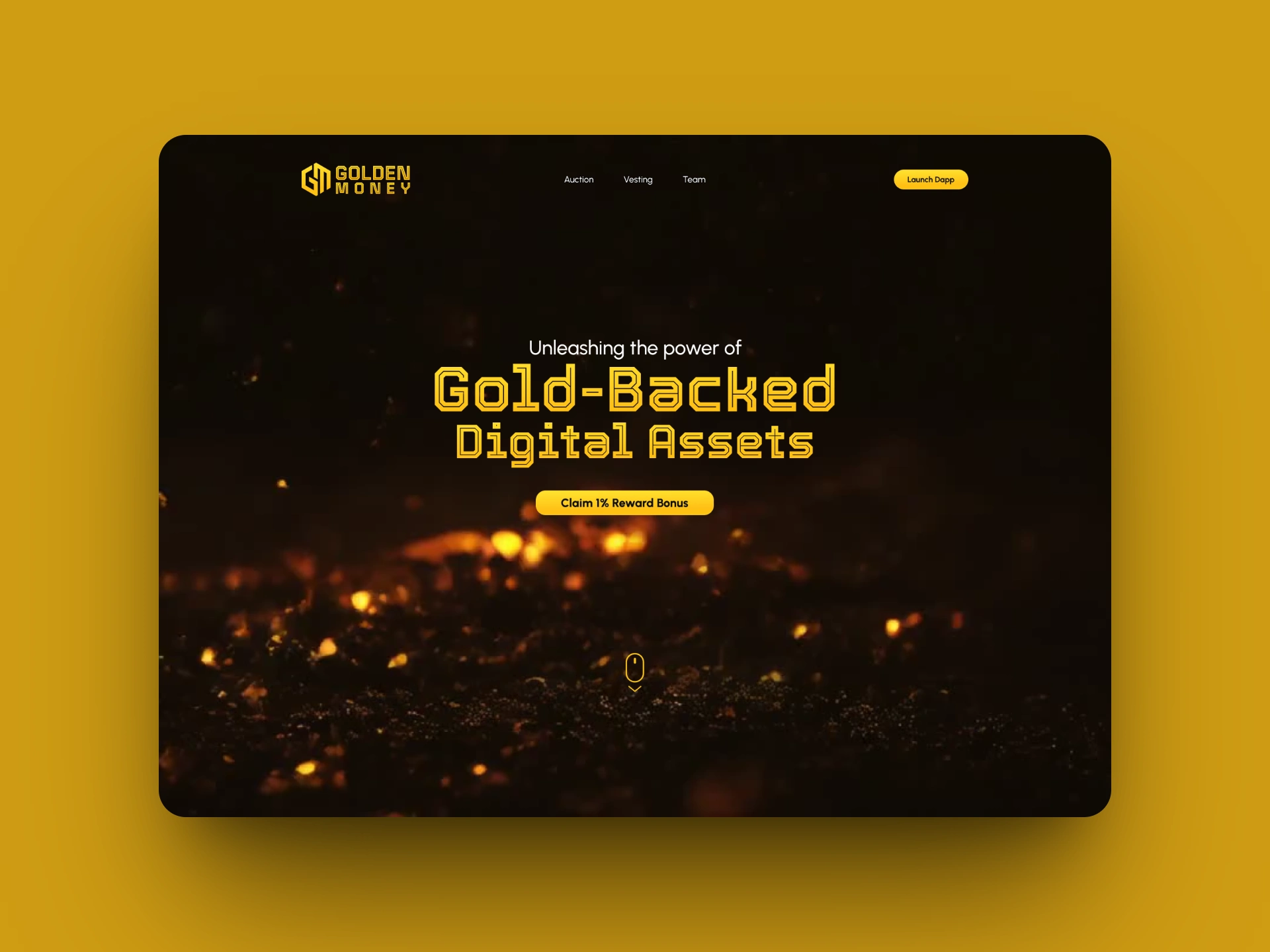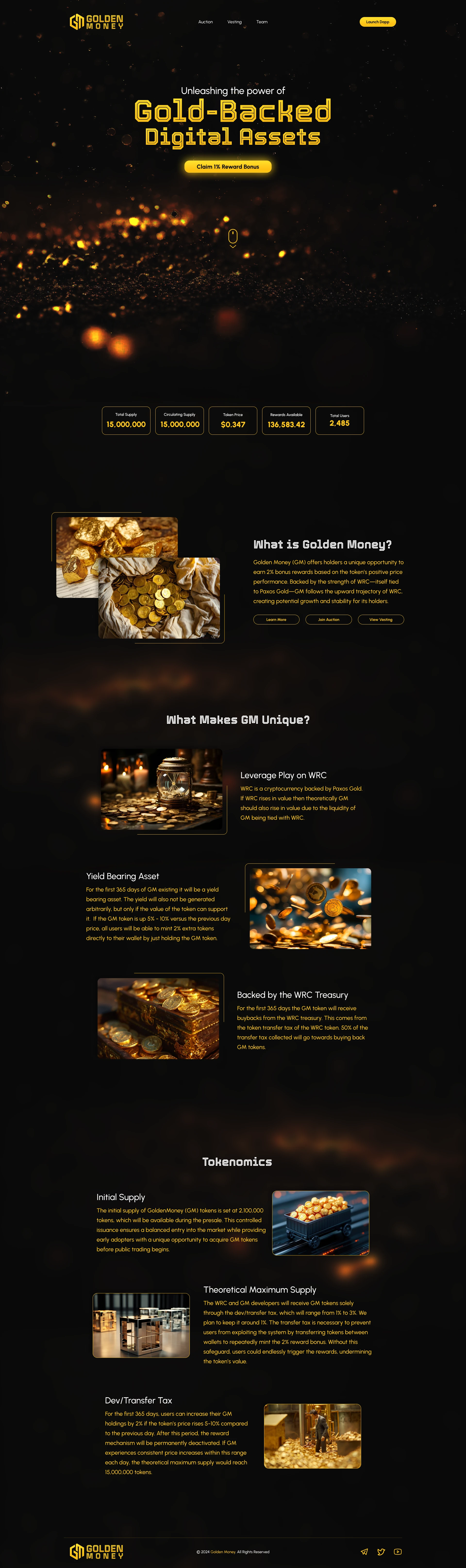 A luxury Web3 landing page for a gold-backed digital asset, blending bold visuals and clear UX to highlight tokenomics, rewards, and real-world value.
