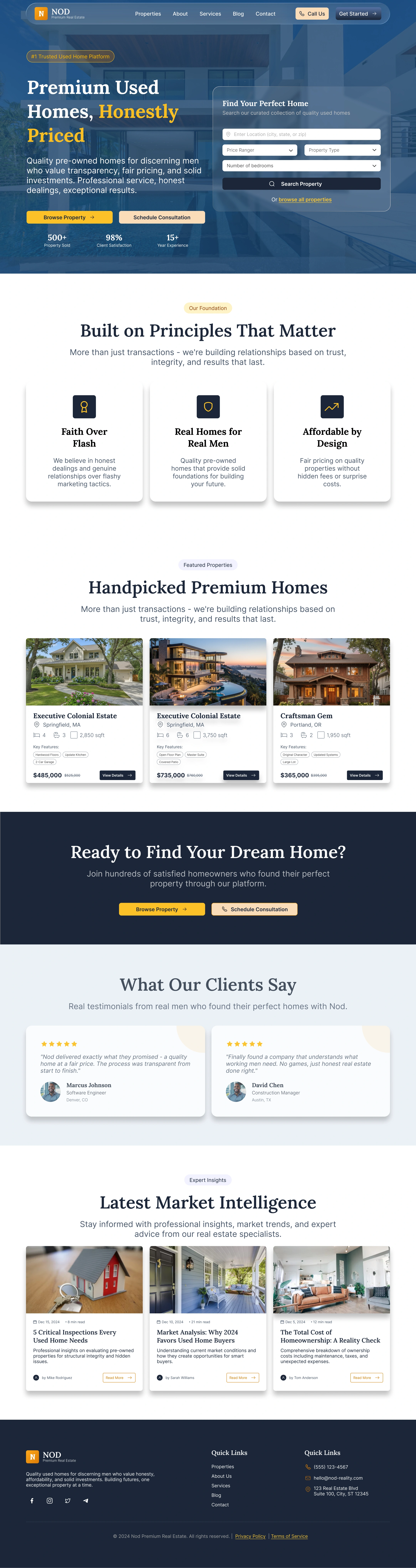 The NOD landing page was designed as a digital platform for premium pre-owned homes. The focus was on trust, transparency, and value, offering men a straightforward way to browse, evaluate, and purchase used homes without the noise of flashy marketing. The design emphasizes clarity, credibility, and a strong visual hierarchy to guide users through property discovery.