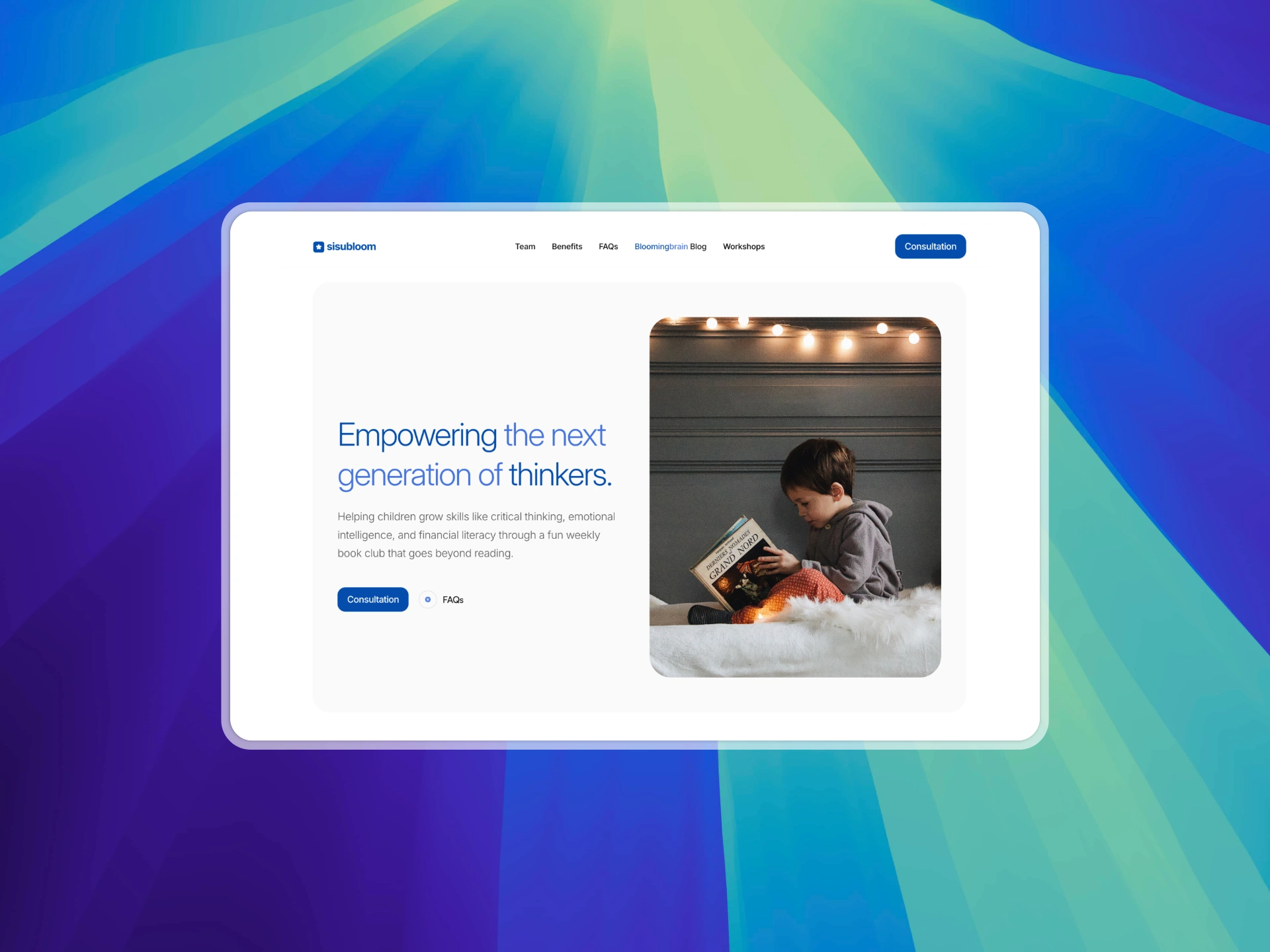 Framer-built site for SisuBloom — helping children grow critical skills through storytelling, workshops, and Socratic learning in a calm, blue-white design.