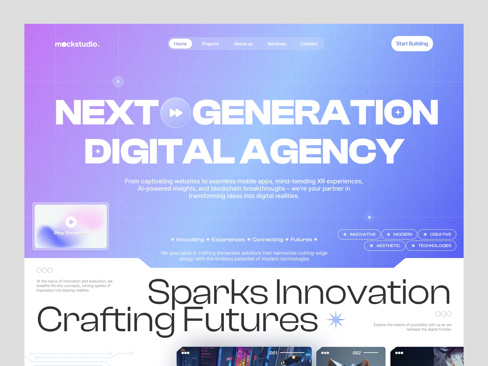 This is the hero design concept of the MockStudio website. MockStudio is your creative partner in creating stunning websites, stunning XR experiences, AI-powered insights, and blockchain breakthroughs.