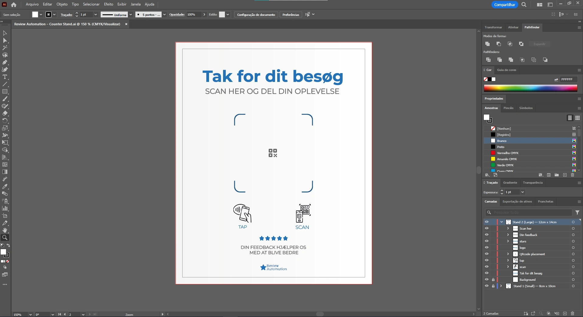 Designed premium NFC + QR counter stands for a B2B SaaS brand. Print-ready files in Figma + Illustrator, CMYK, 300 DPI, 3mm bleed. Rated 5.0 by the client.