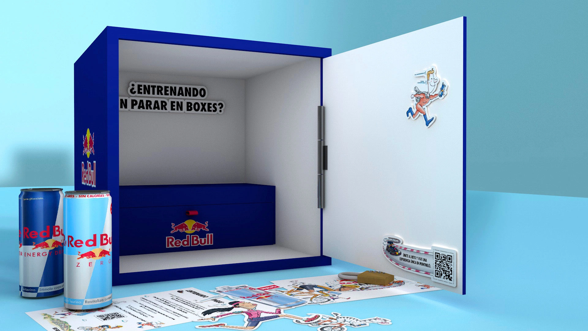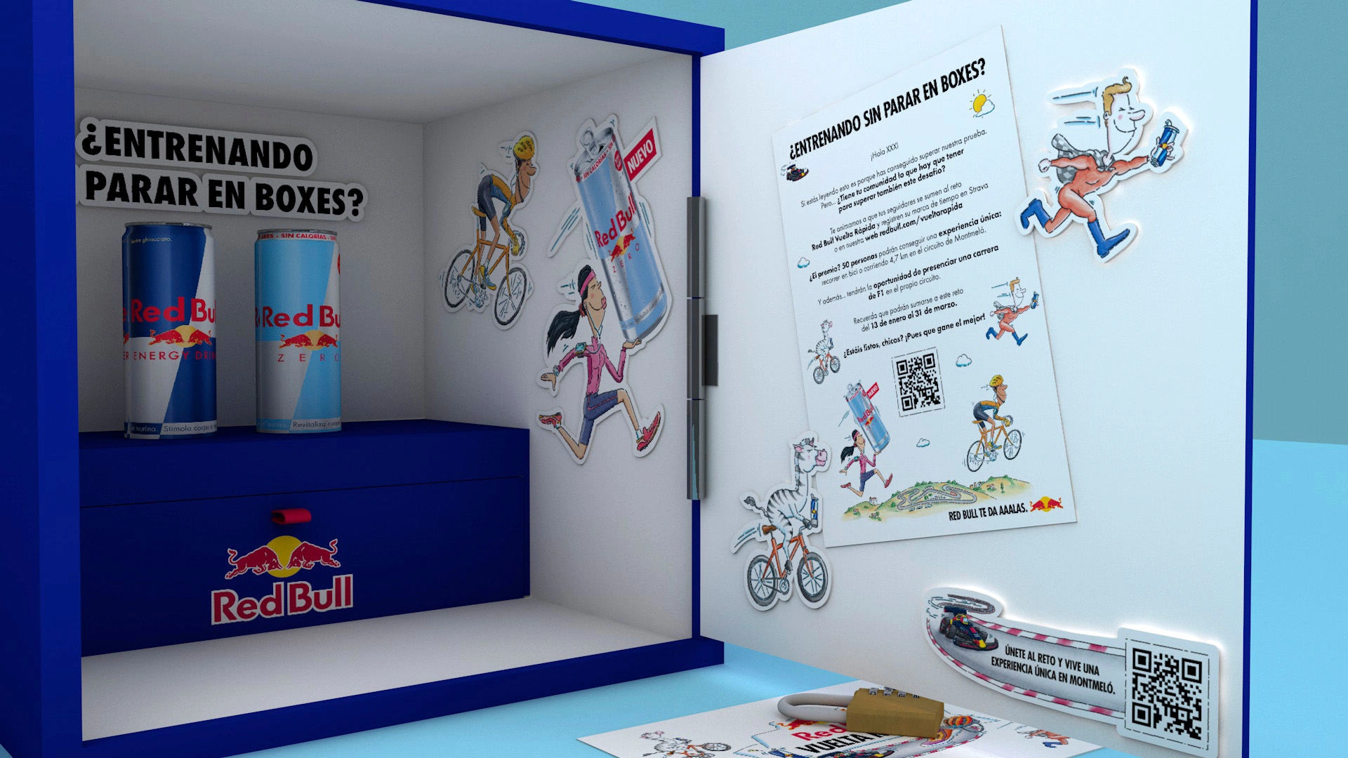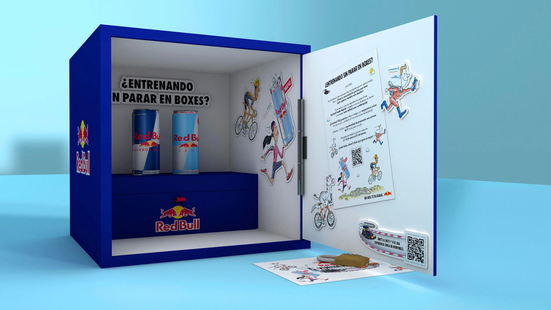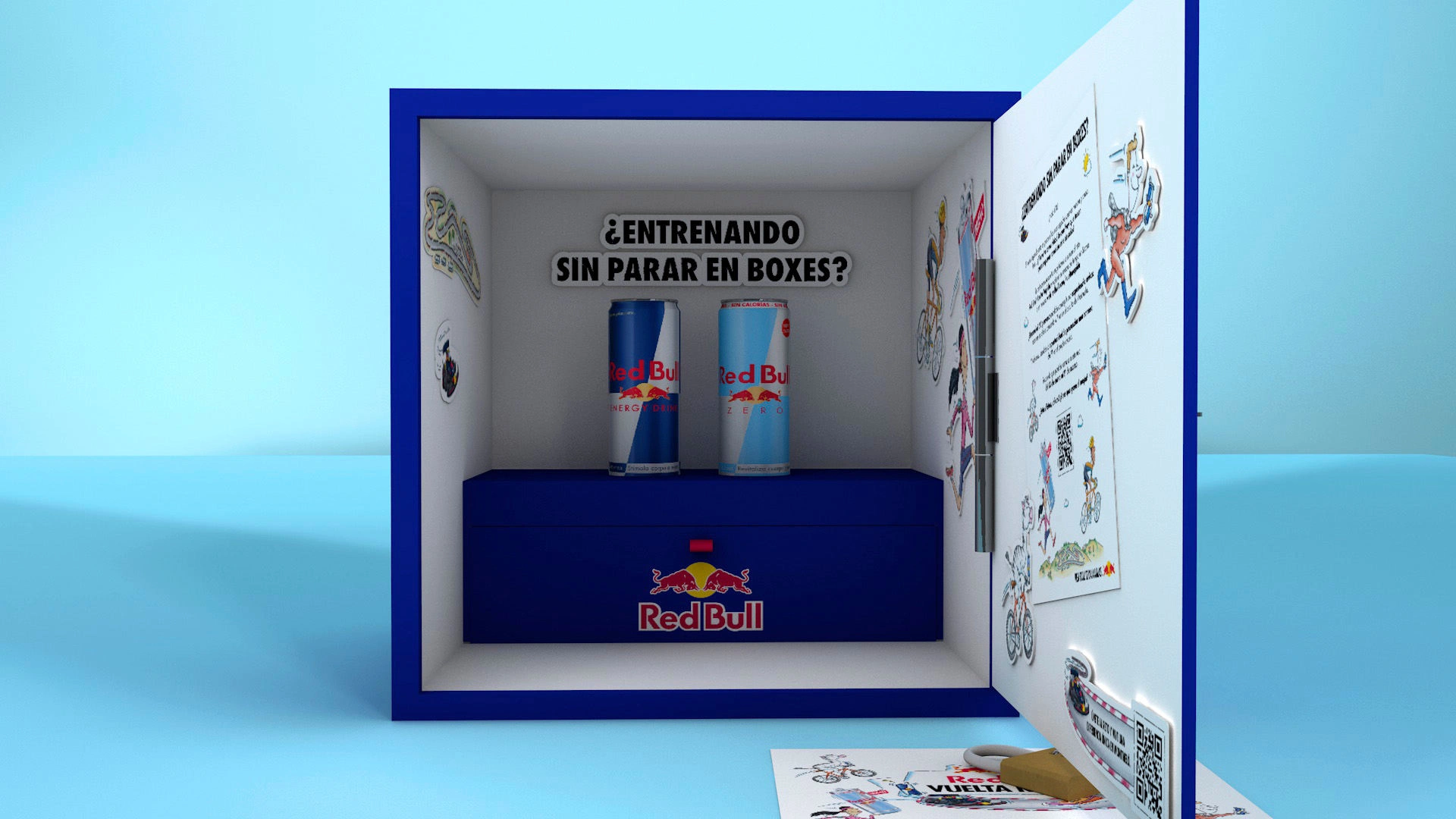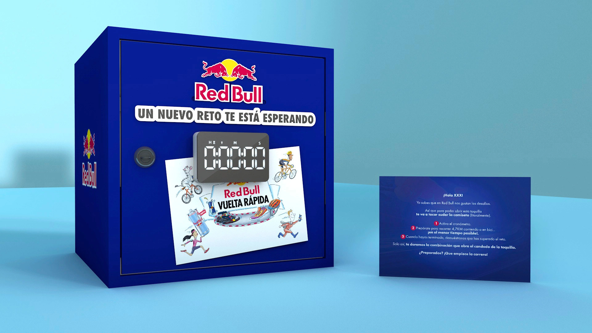 Para el lanzamiento del reto "RedBull Vuelta Rápida", creamos un original kit de unboxing para influencers, con una temática 100 % deportiva y un toque gamificado: había que superar un reto físico para poder abrir la caja.
