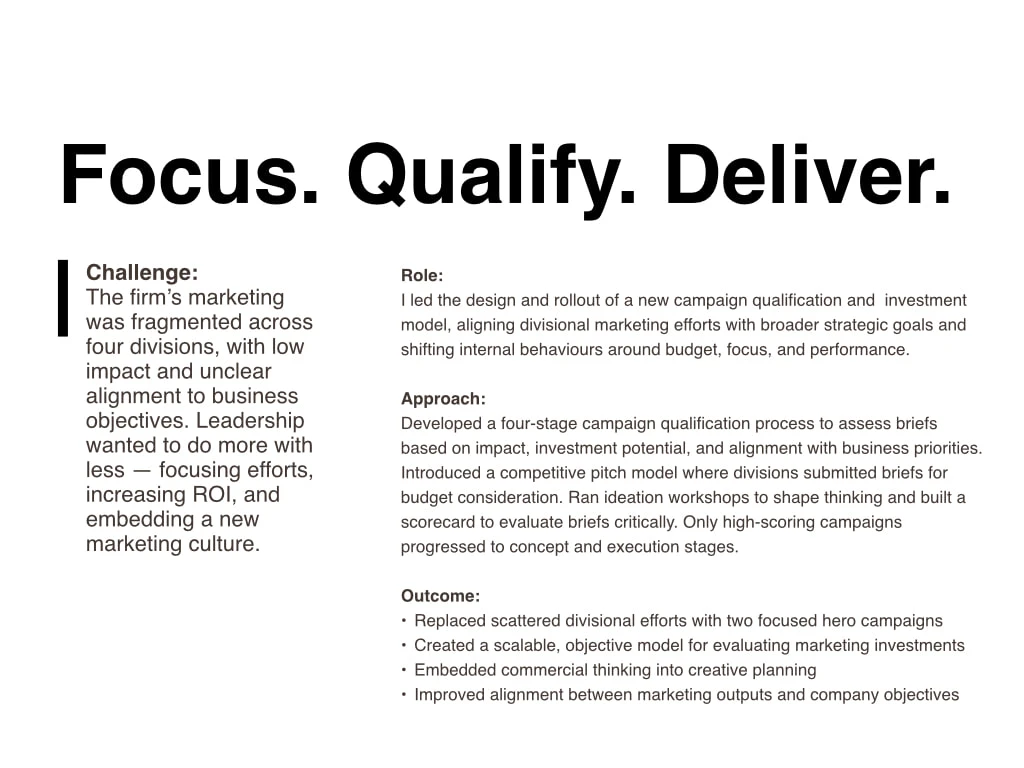 Redesigned a legal firm’s campaign model, introducing a 4-stage qualification process that aligned briefs to strategy, sharpened investment, and drove impact.