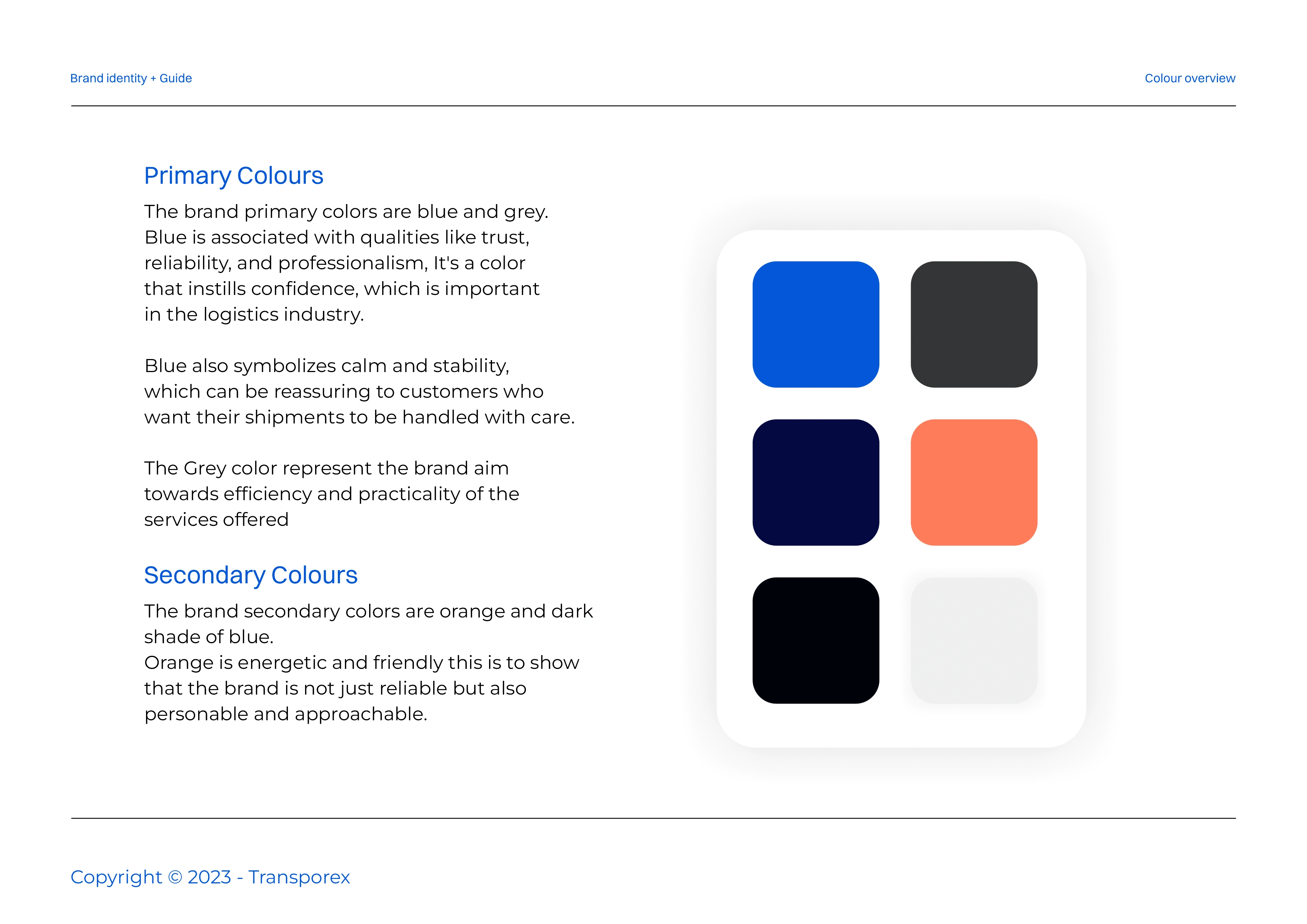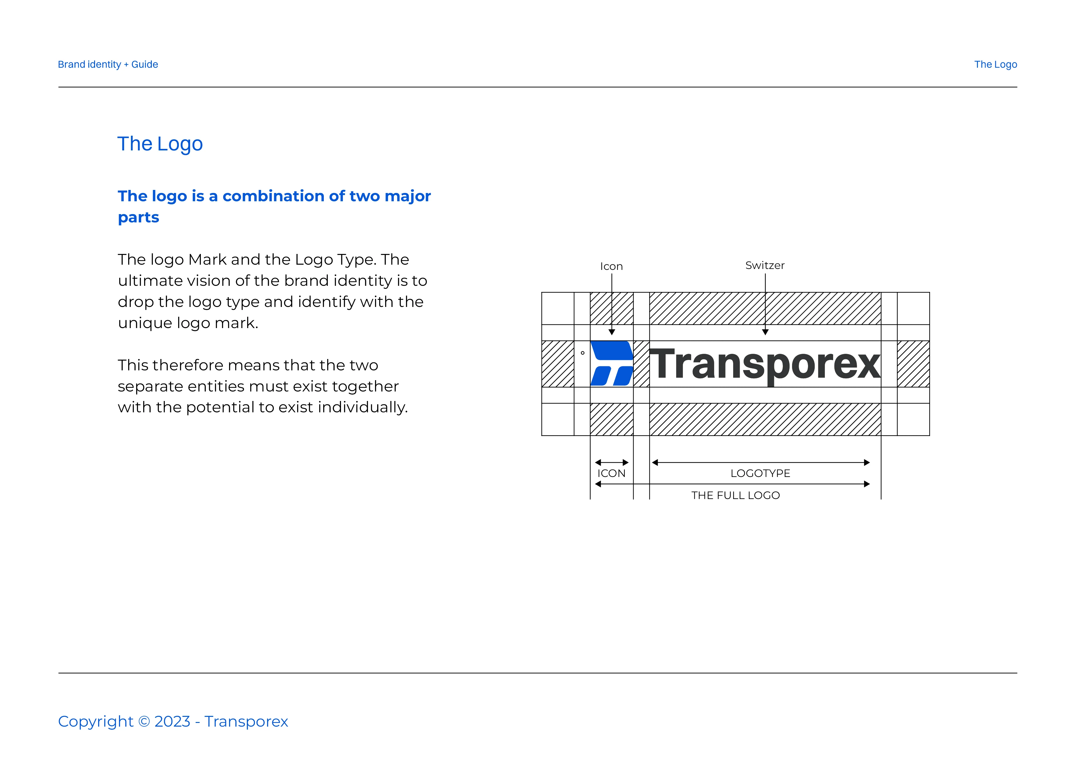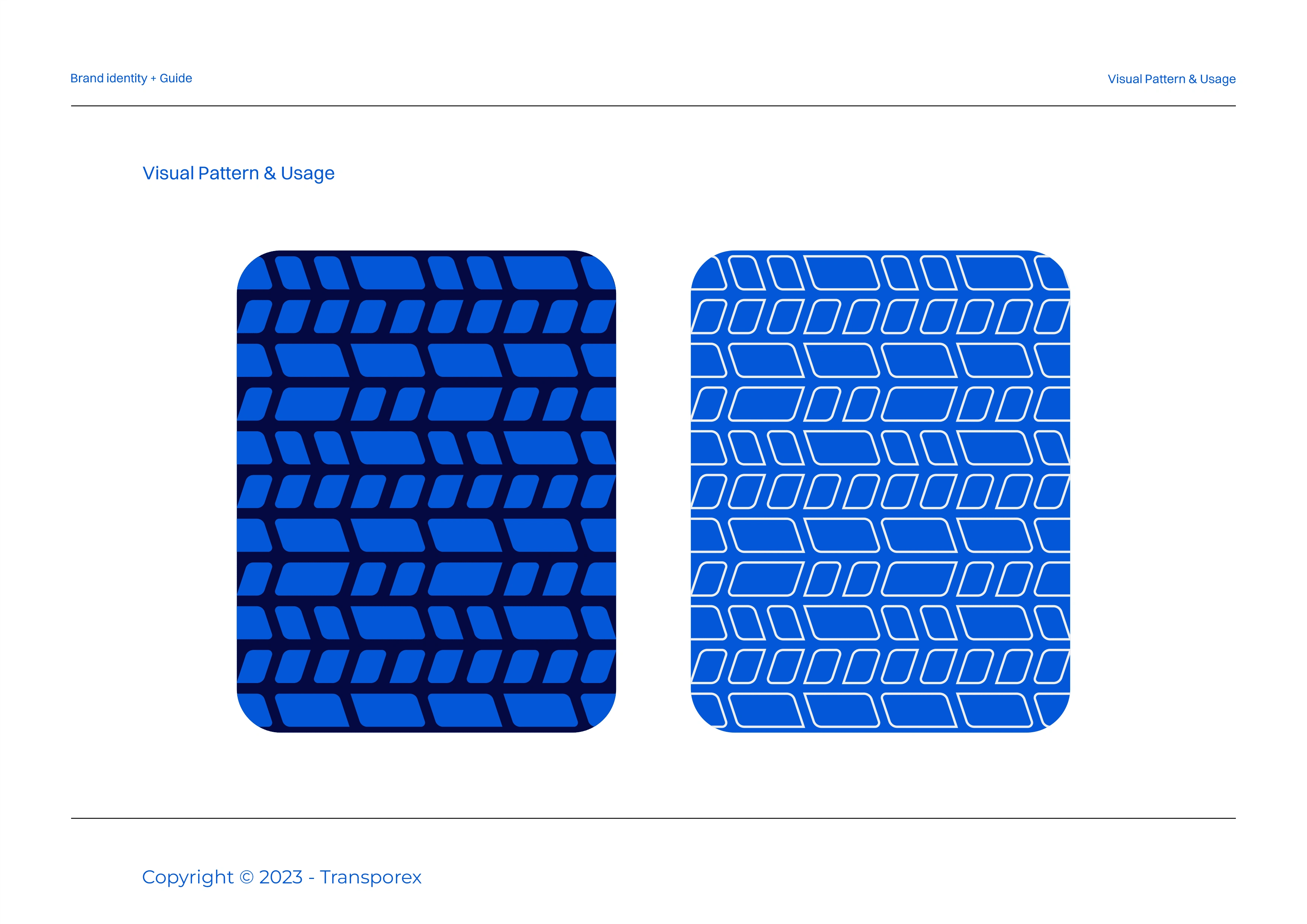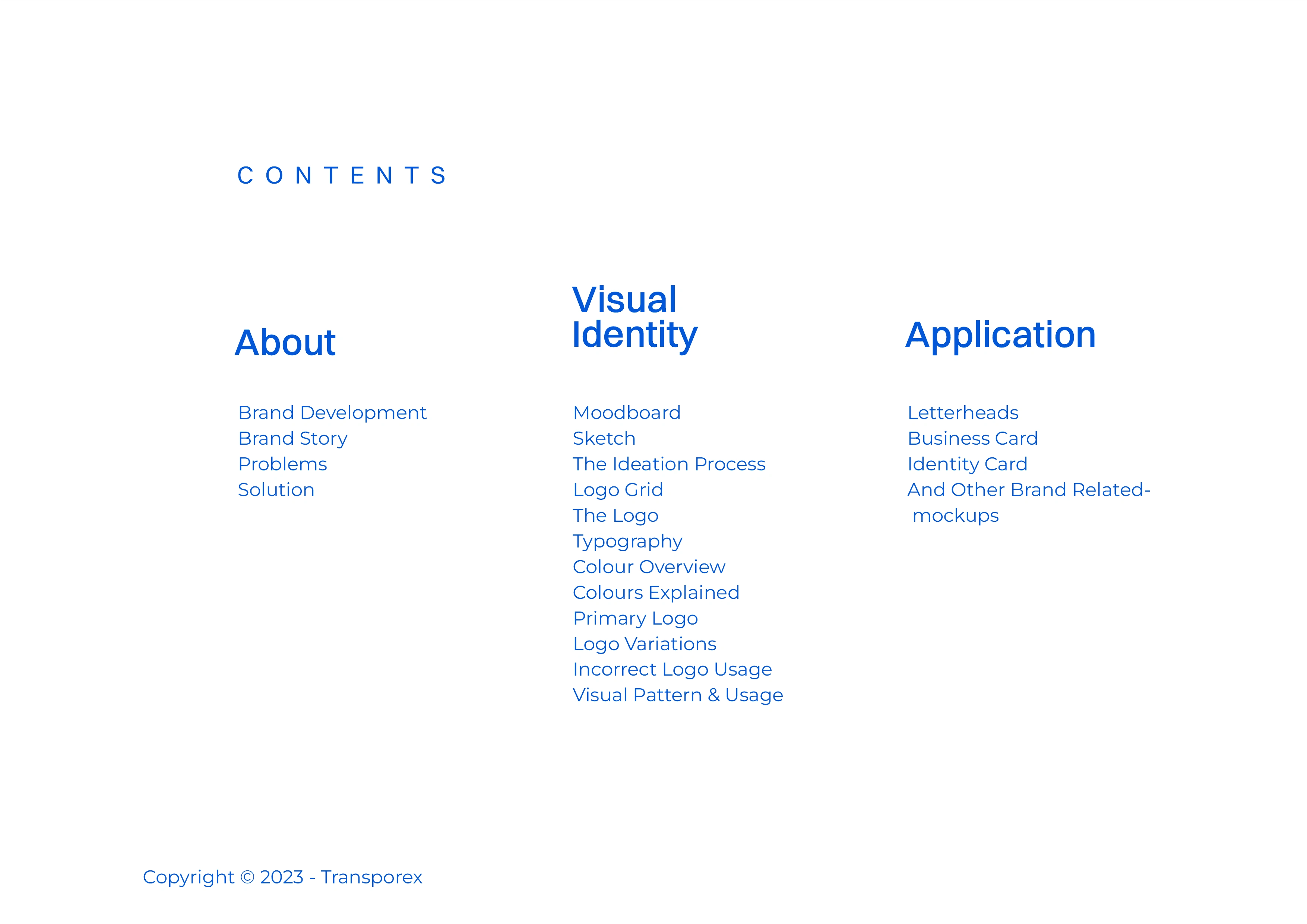 To reflect the brand's mission and vision, a unique identity was designed that captures its core essence. The brand logo combines a bold typeface with an icon. The icon integrates three elements: the brand initial "T" to represent Transporex, an arrow symbolizing the brand's commitment to efficiency and growth, and a bold form to convey trust.