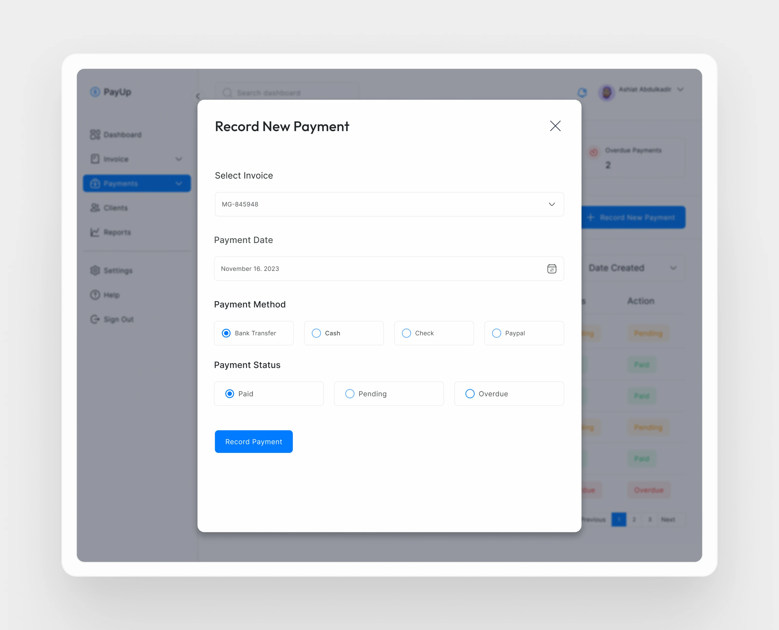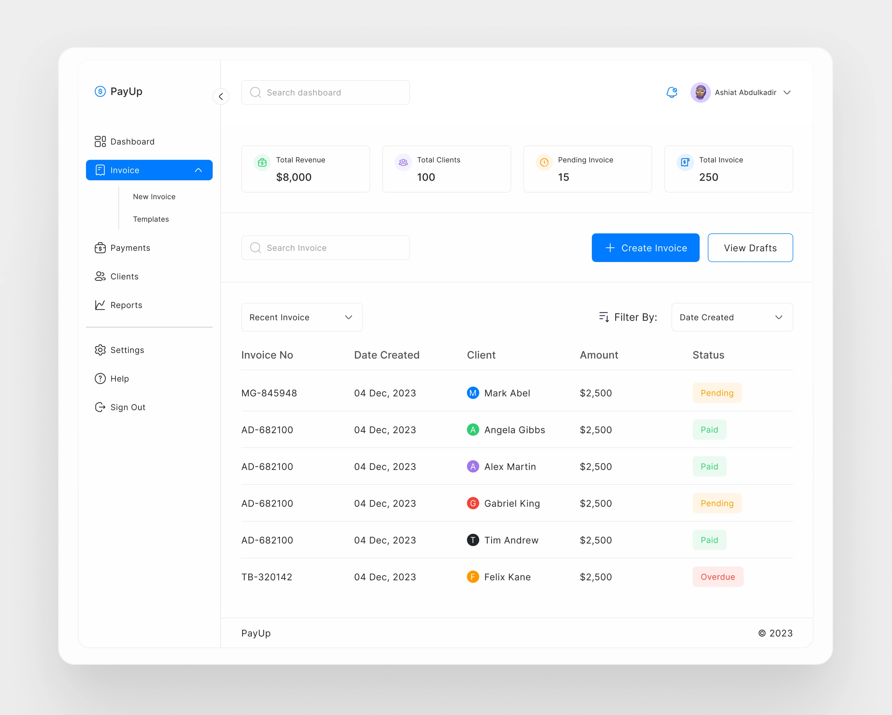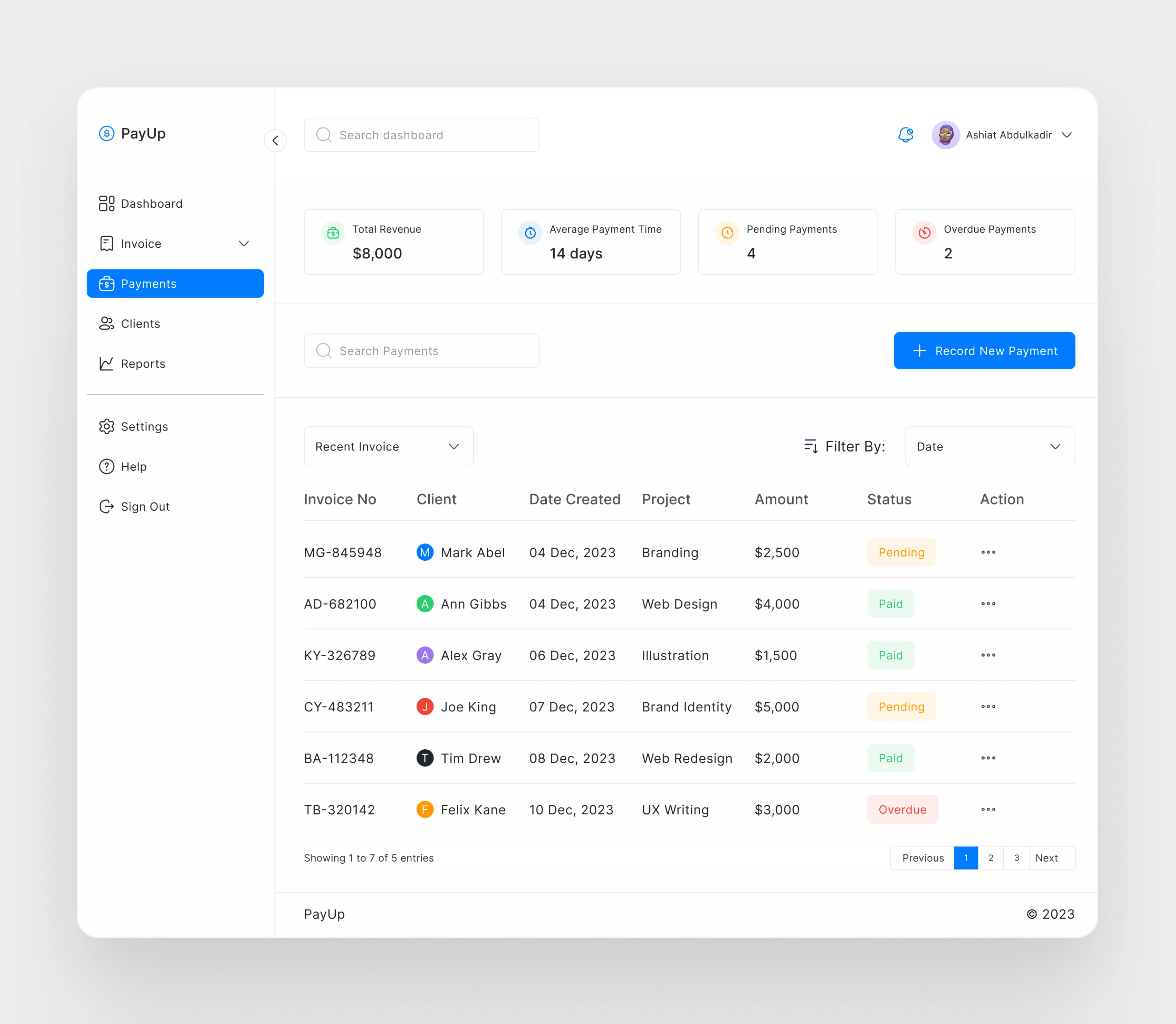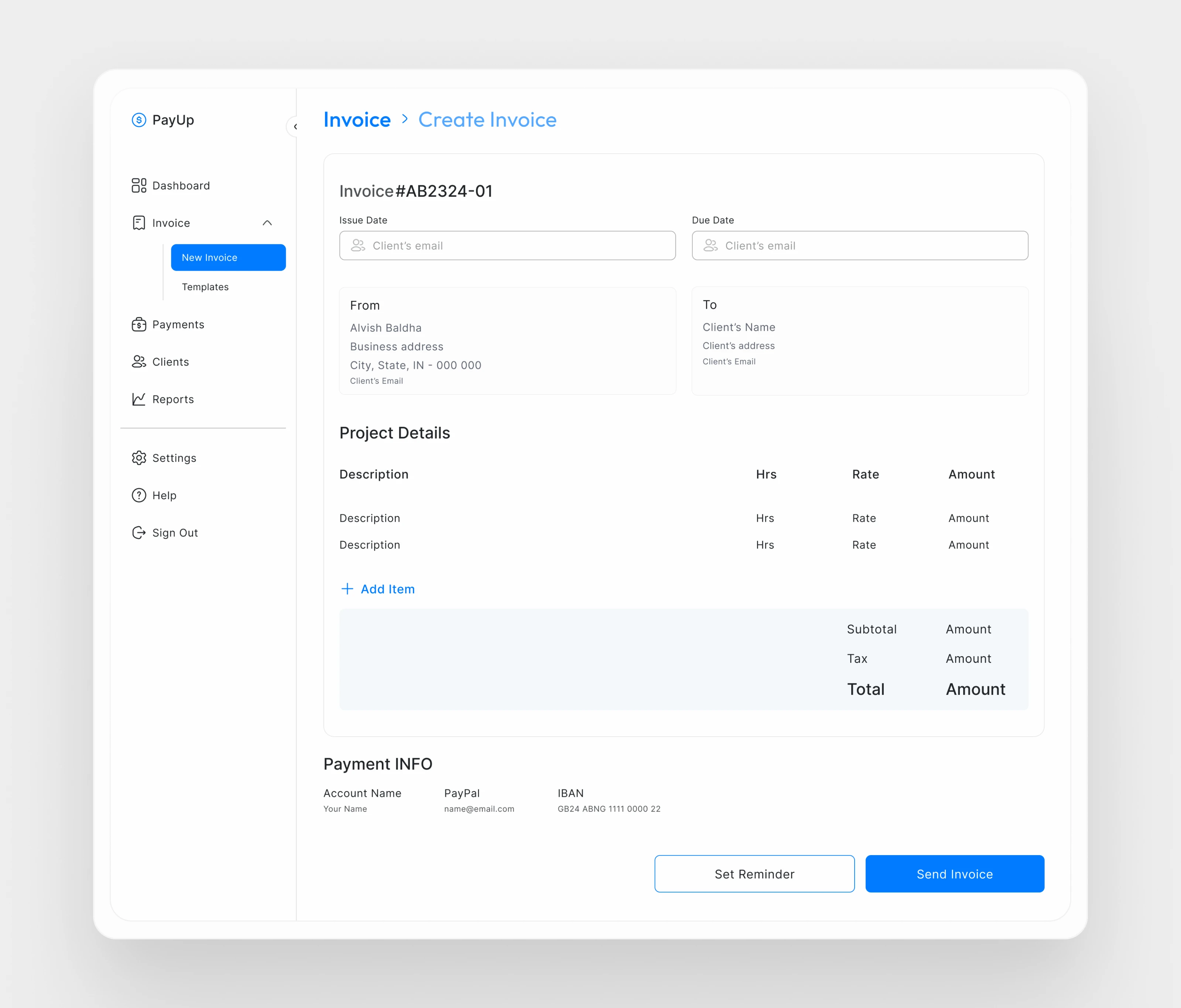 Invoice creation and sending: Users can easily create and send invoices to clients using the app. They can enter all the necessary details, including client name, project name, invoice date, due date, amount, and status. Additionally, users have the option to choose from different invoice templates and customize them to their liking. Sending the invoice to the client's email is also made simple through the app's email settings.