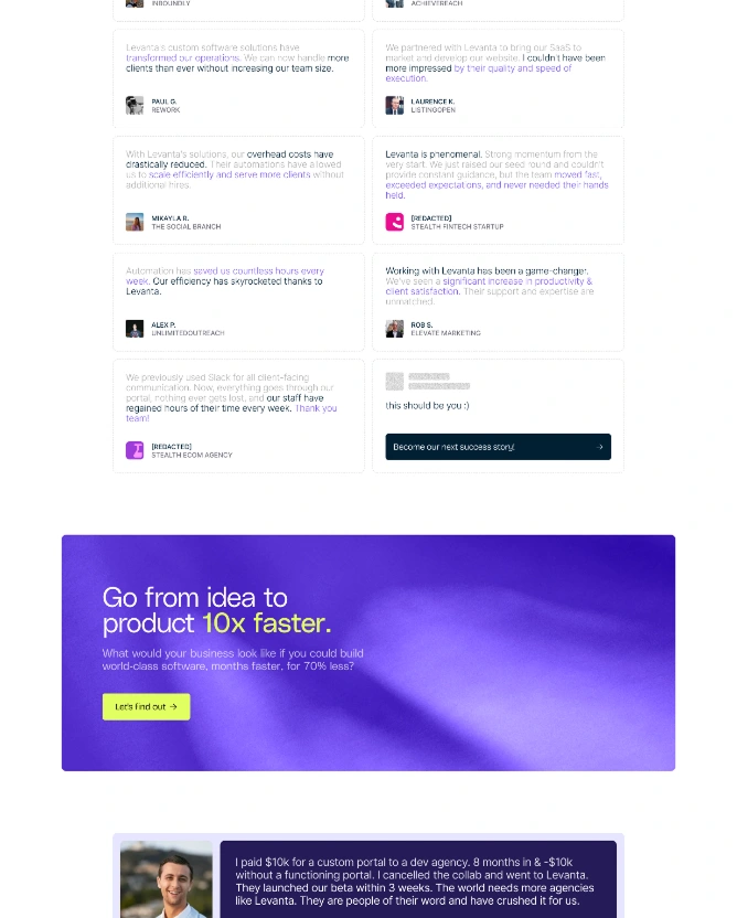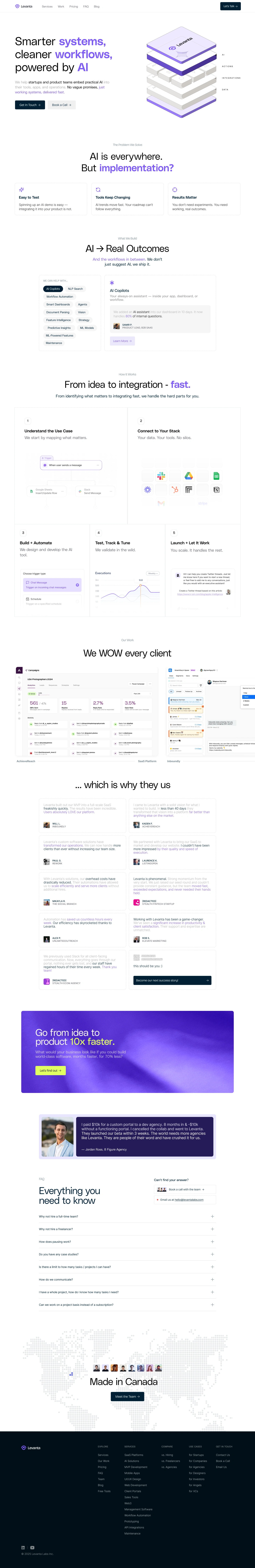 I led the website design for Levanta, an AI-powered automation platform for modern businesses. My approach focused on clarity and technical credibility, translating complex AI capabilities into simple, tangible outcomes. The site showcases Levanta’s product value with clean, modular sections—real client results, testimonial proof, and frictionless onboarding flows. I balanced deep product detail with bold headlines and interactive visuals, all designed to convert curious visitors into engaged leads. Every page reinforces Levanta’s positioning as the go-to partner for smarter systems and workflows, powered by real AI.