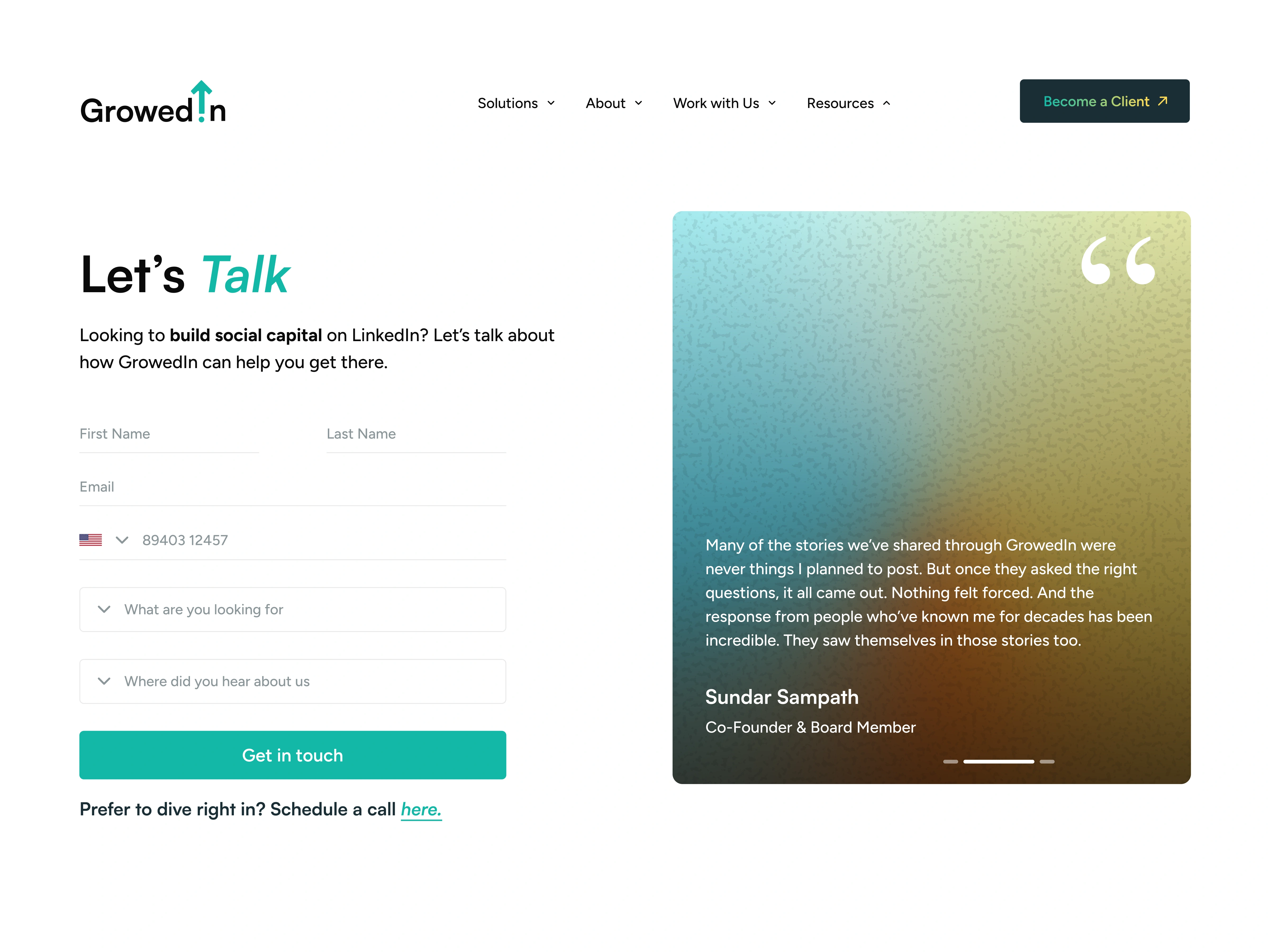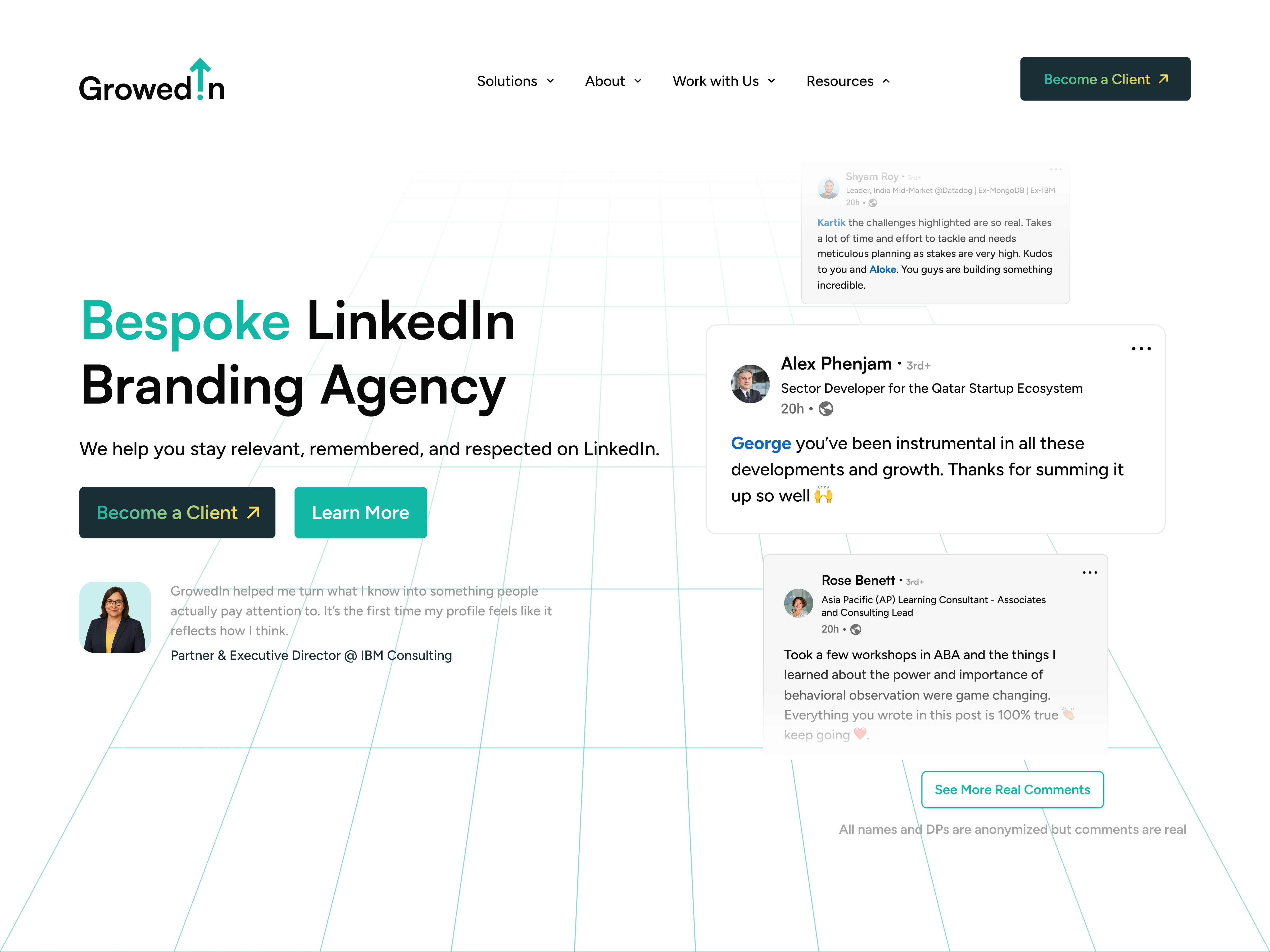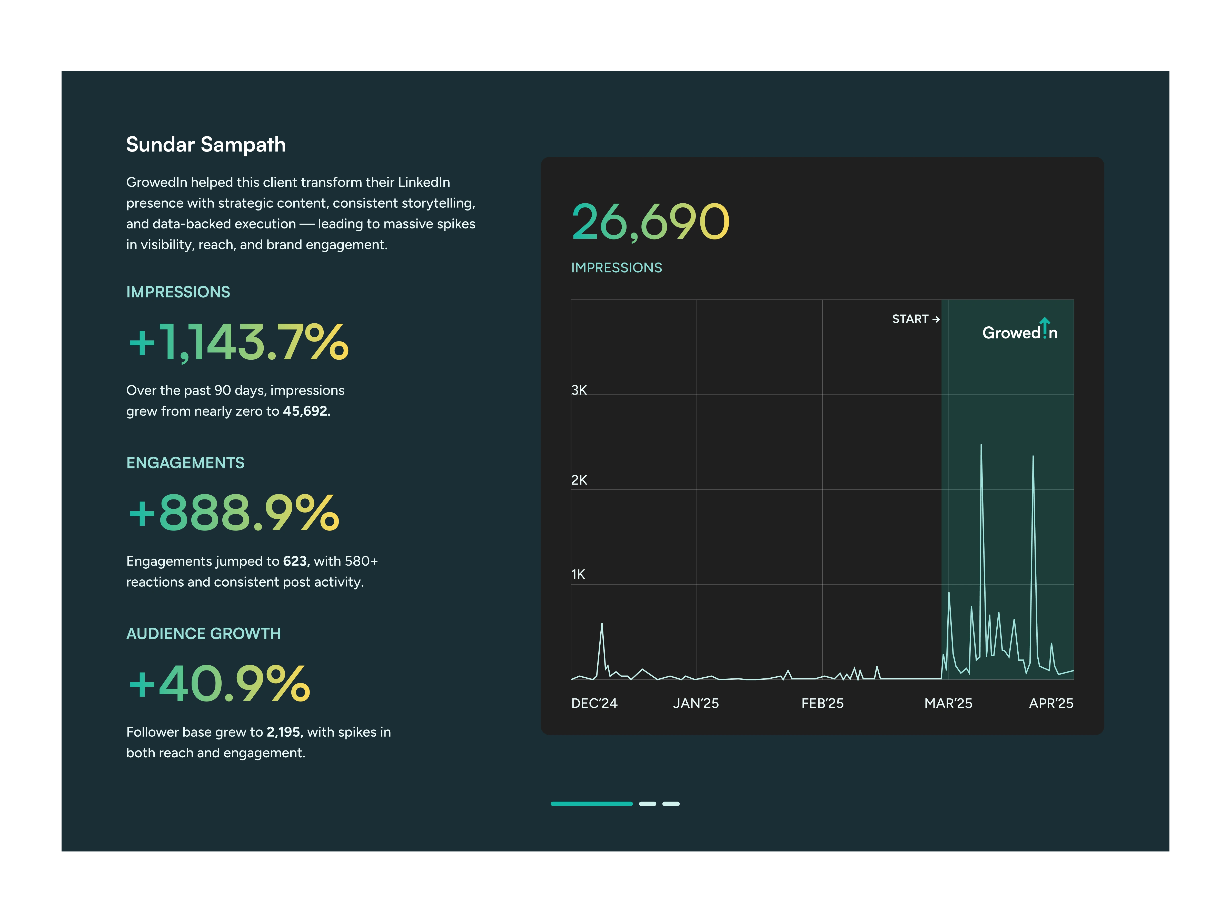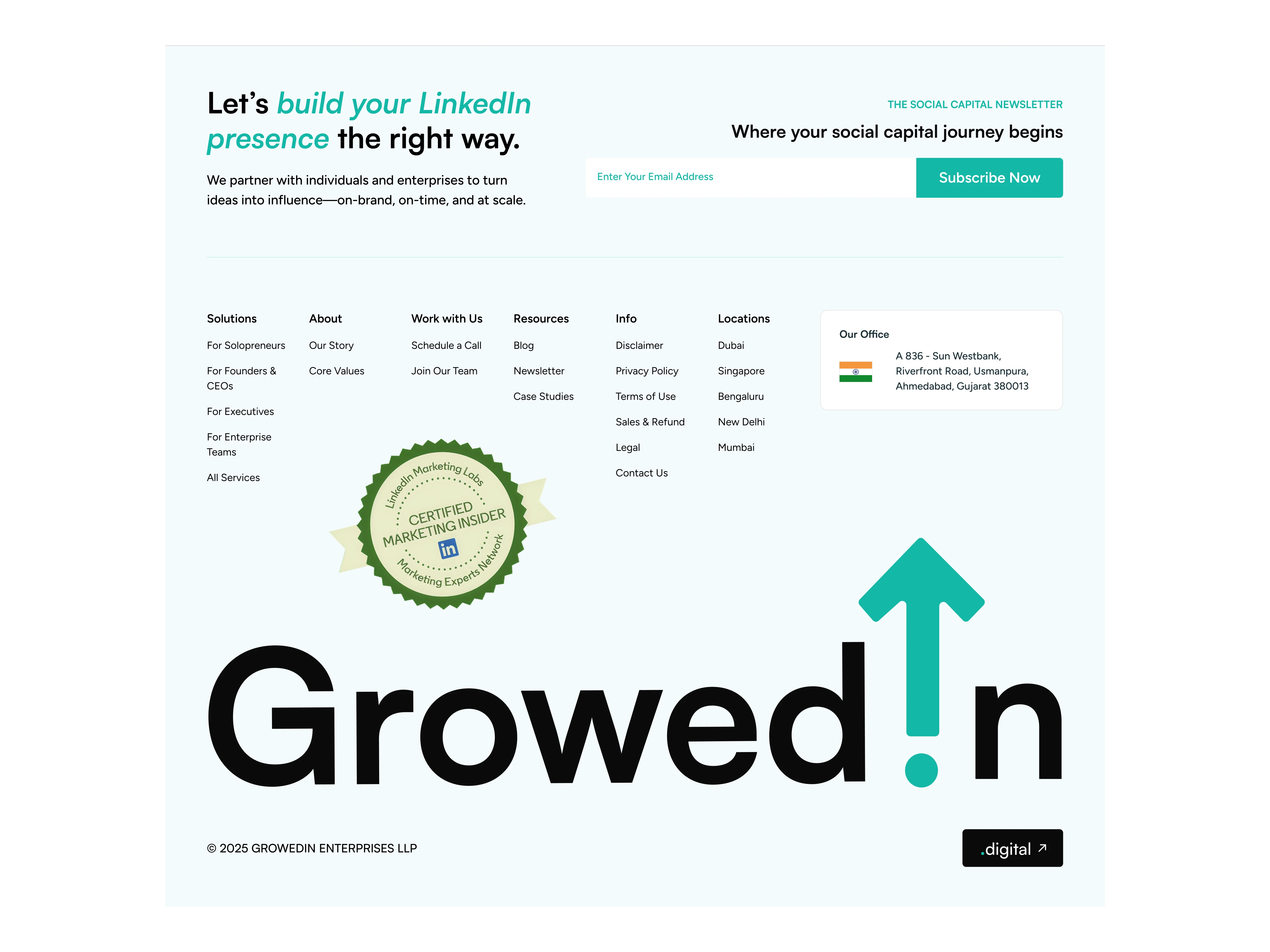 As Head of VisualOS, Suraj led all design operations at GrowedIn, a leading LinkedIn branding agency trusted by enterprise leaders and Fortune 500 execs. His role included designing and launching their website, shaping the brand’s digital identity, and building out all key presentation and sales decks.
