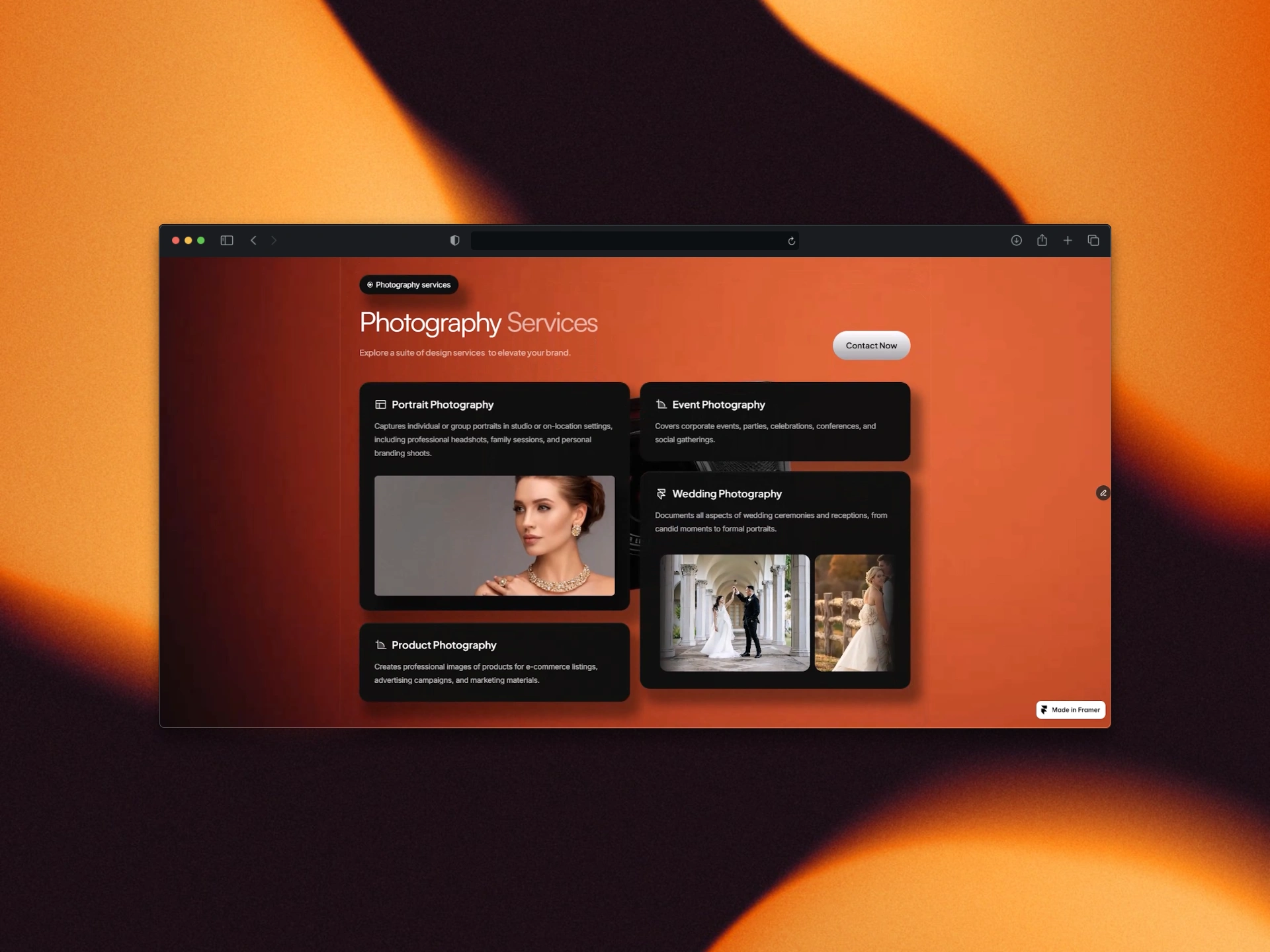 This project is a modern, responsive portfolio website designed specifically for professional photographers, built using Framer with custom 3D elements created in Blender to add depth and visual impact to the experience. The goal was to create a cinematic, immersive way for photographers to showcase their work while keeping the interface clean, intuitive, and conversion-focused.
