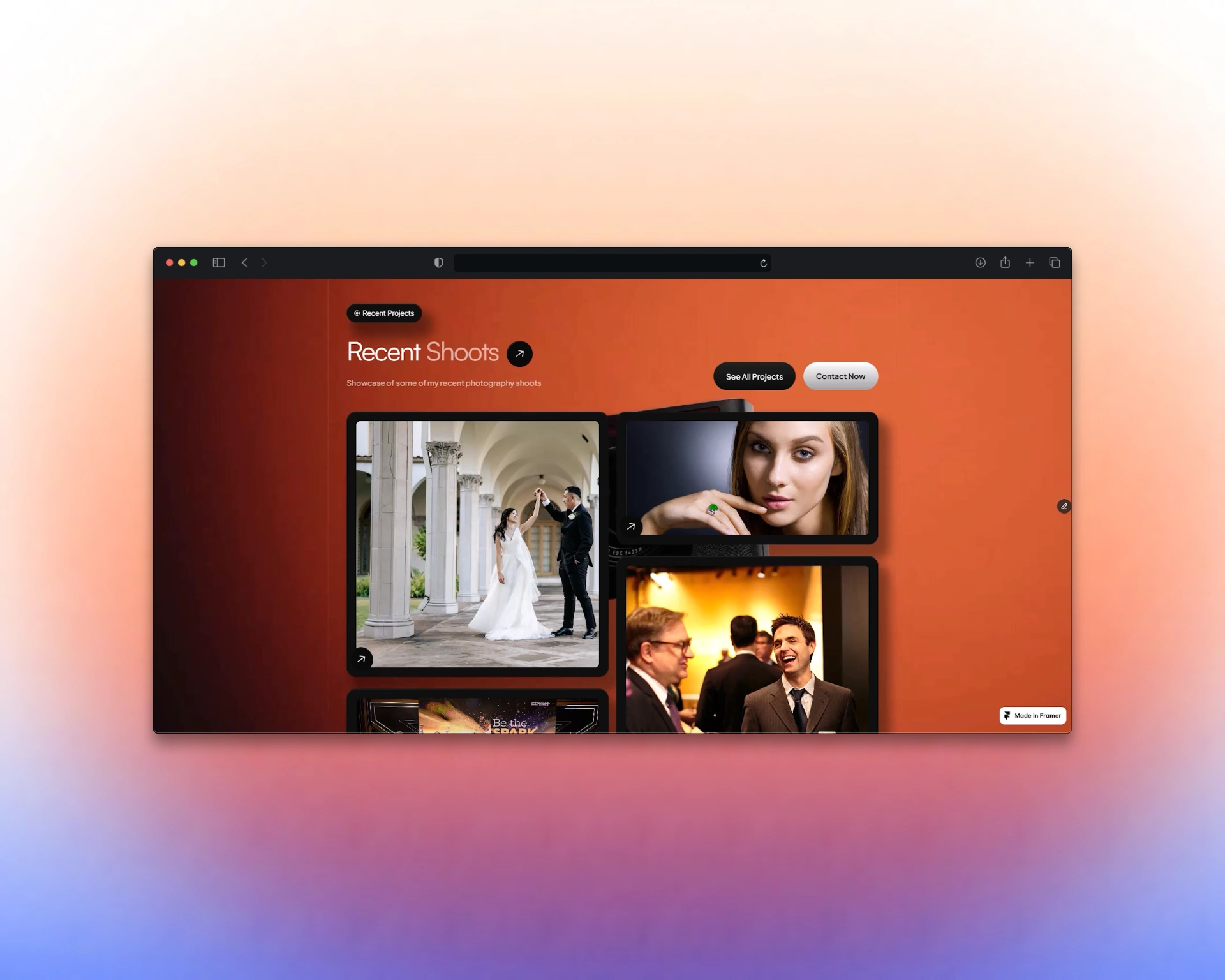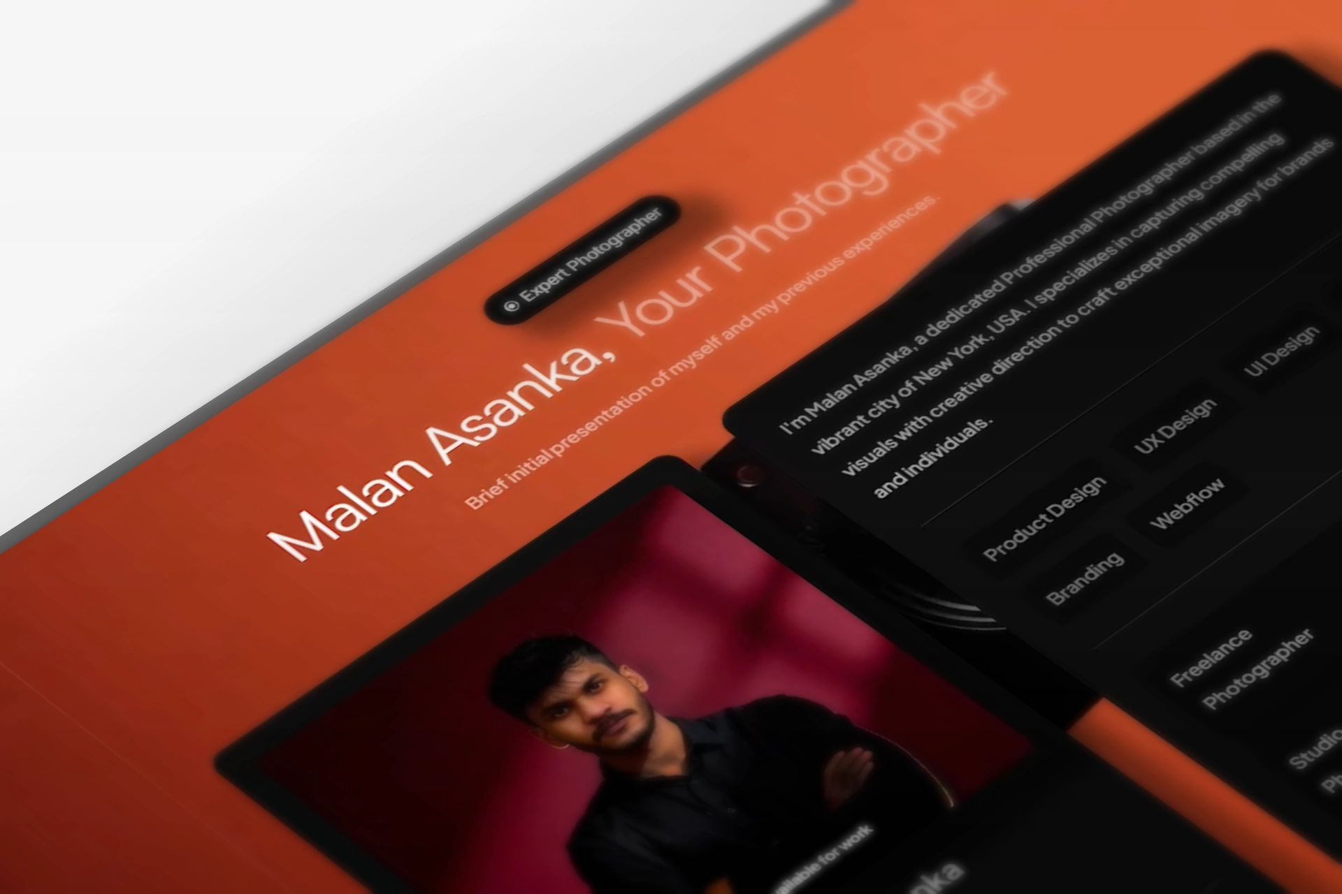 This project is a modern portfolio website designed specifically for professional photographers, using Framer with custom 3D elements created in Blender.