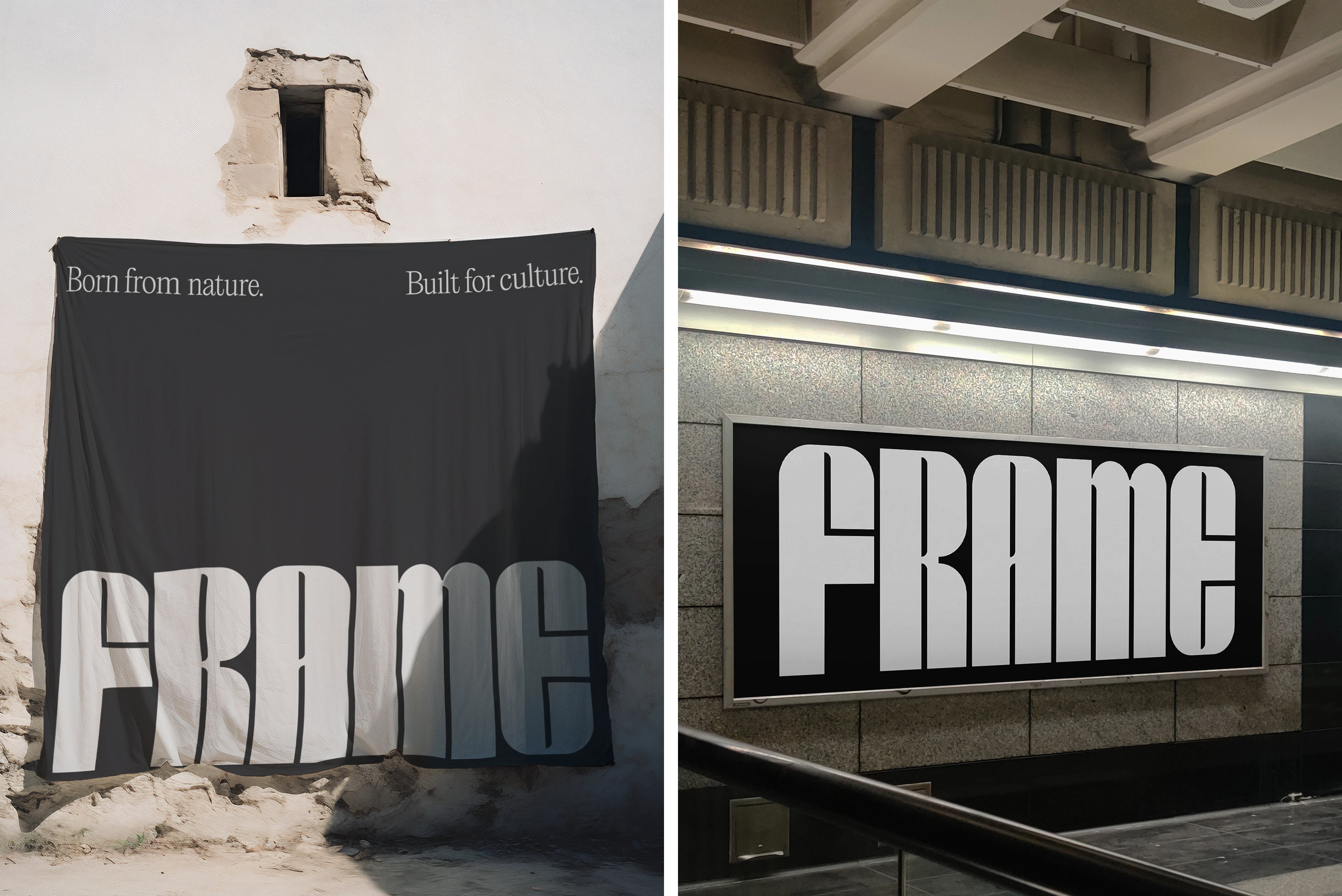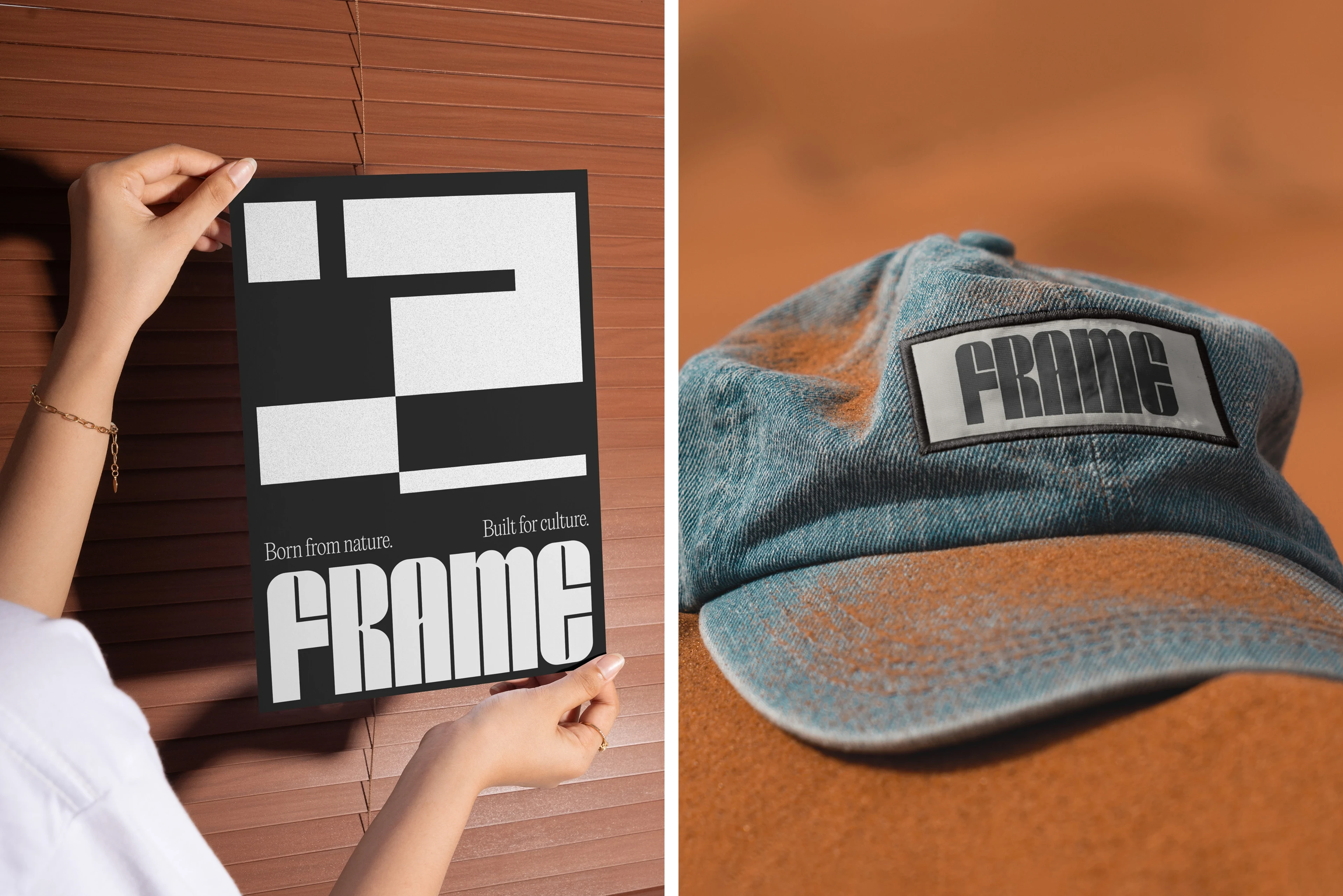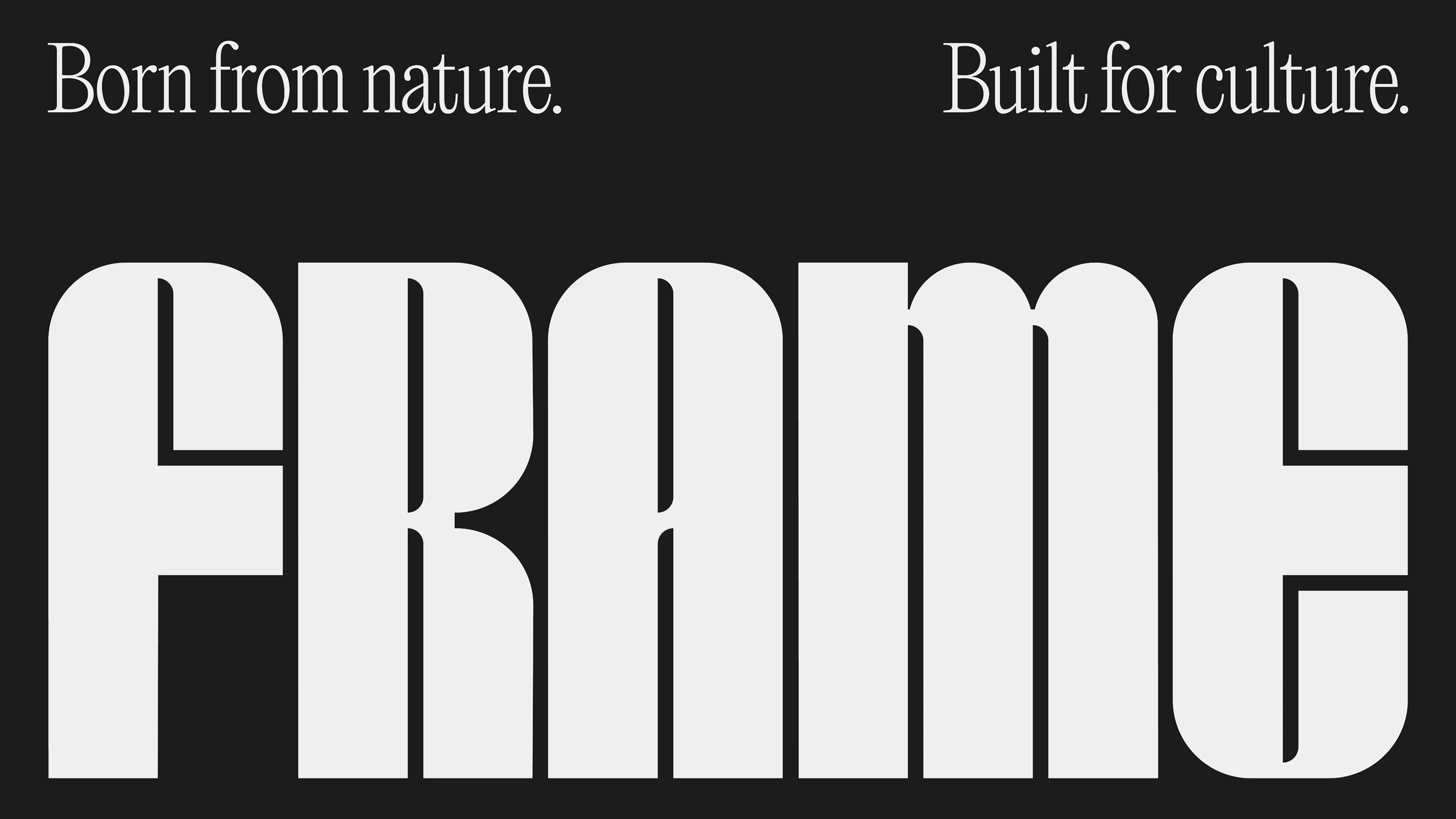 The logo reflects this positioning through a structured typography that combines verticality and symmetry. The bold, geometric letters, enriched with subtle details in their connections, evoke both attentive listening and FRAME’s ability to create connections between stories, formats, and different fields of exploration.
