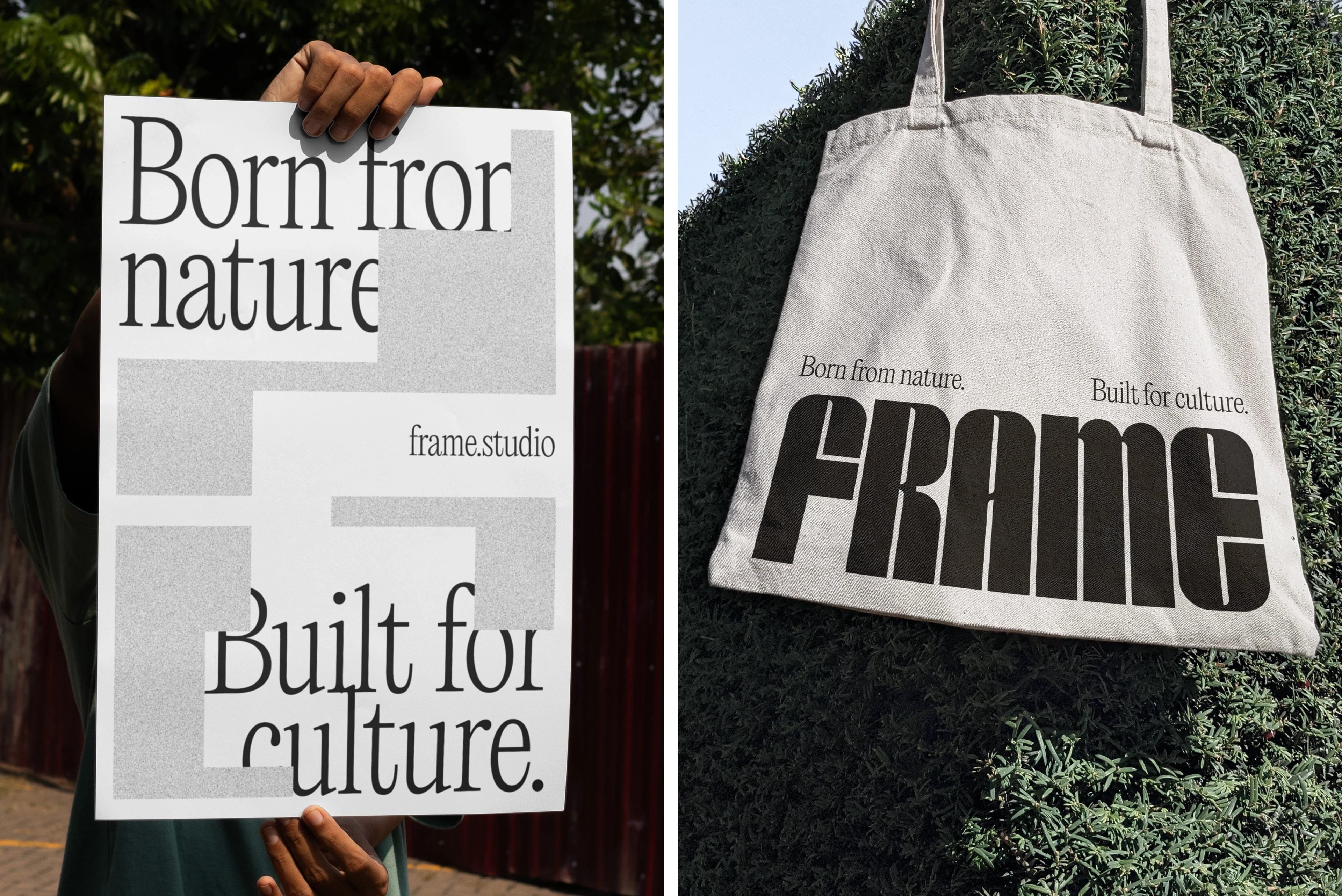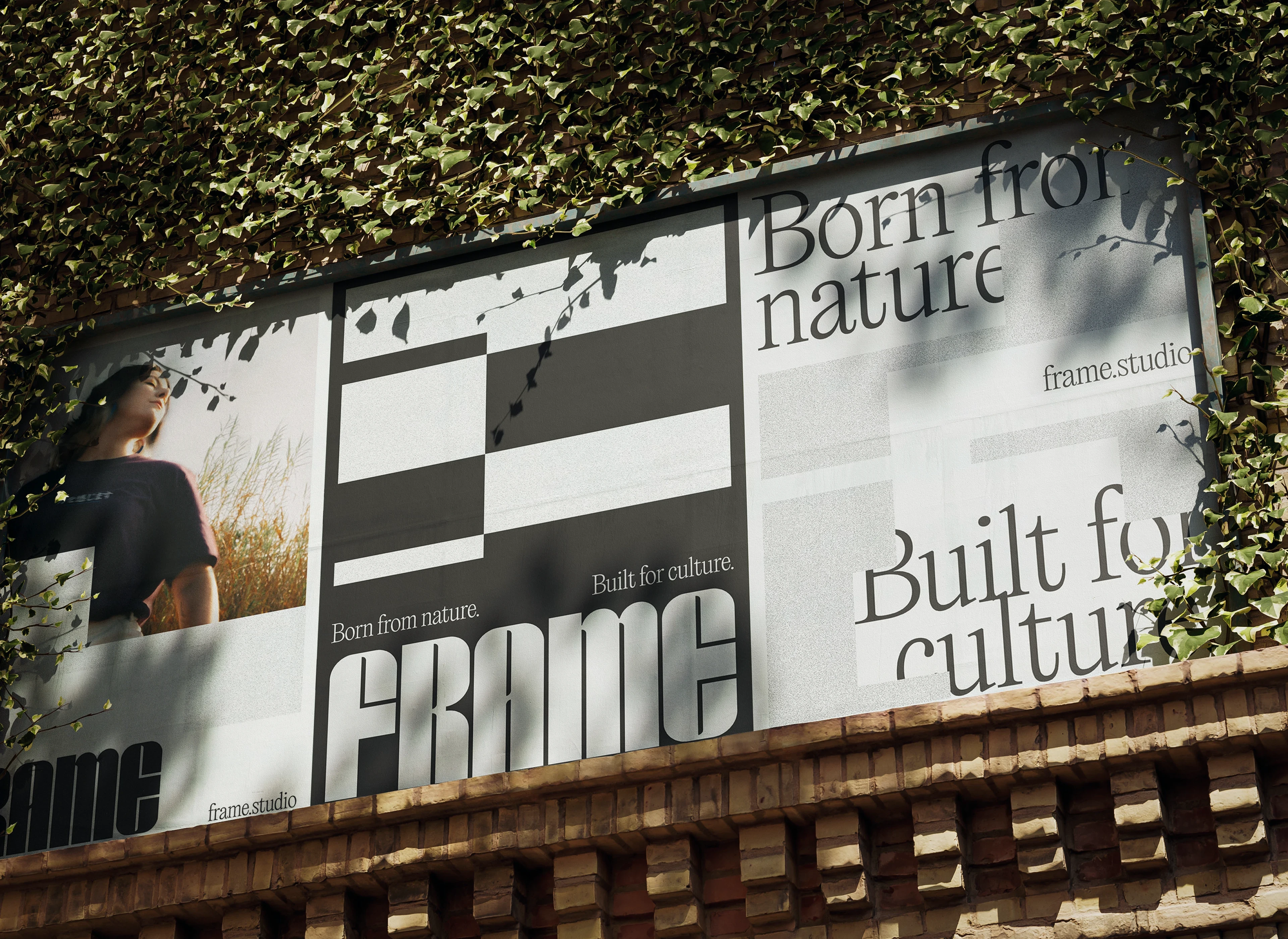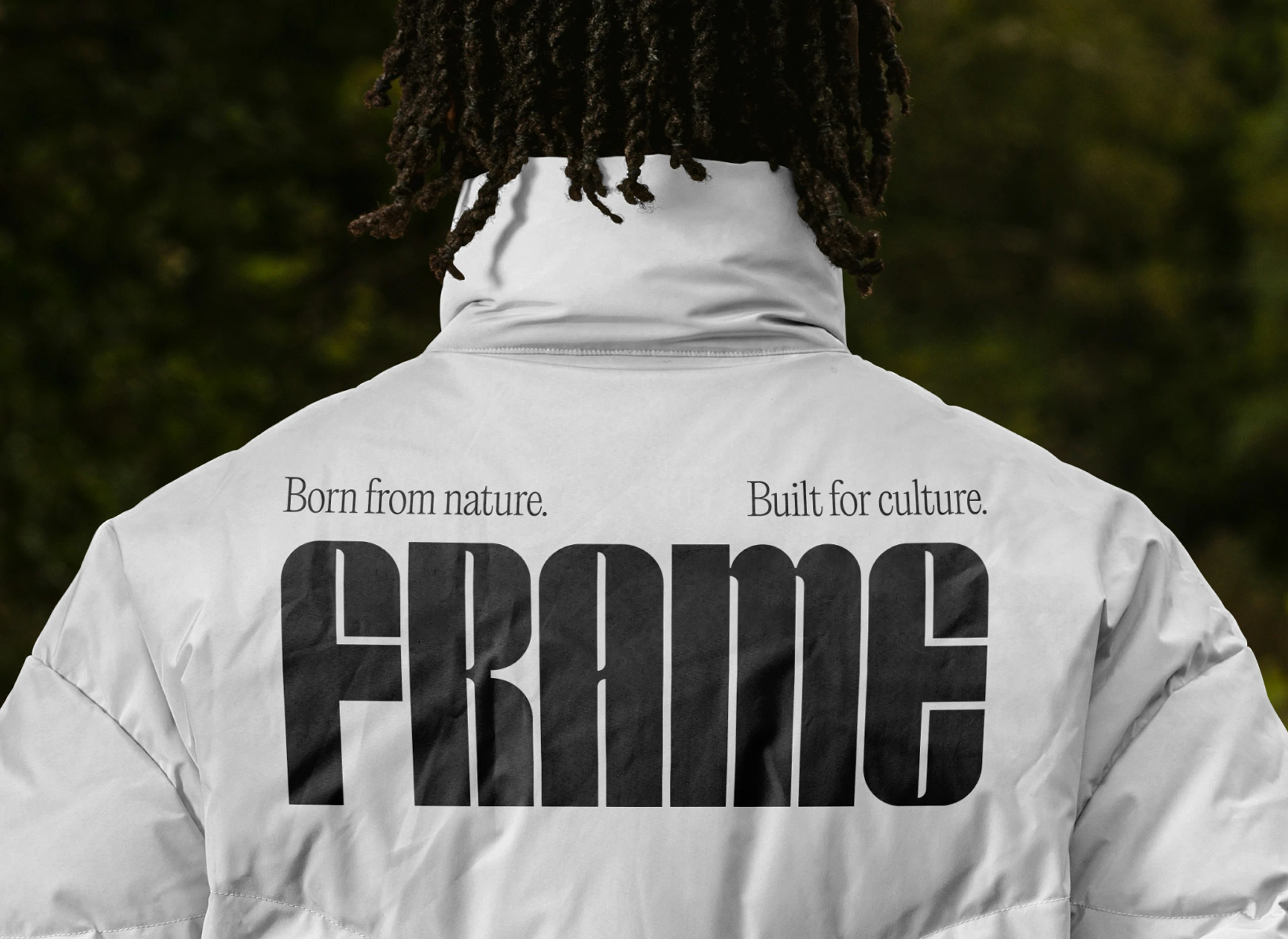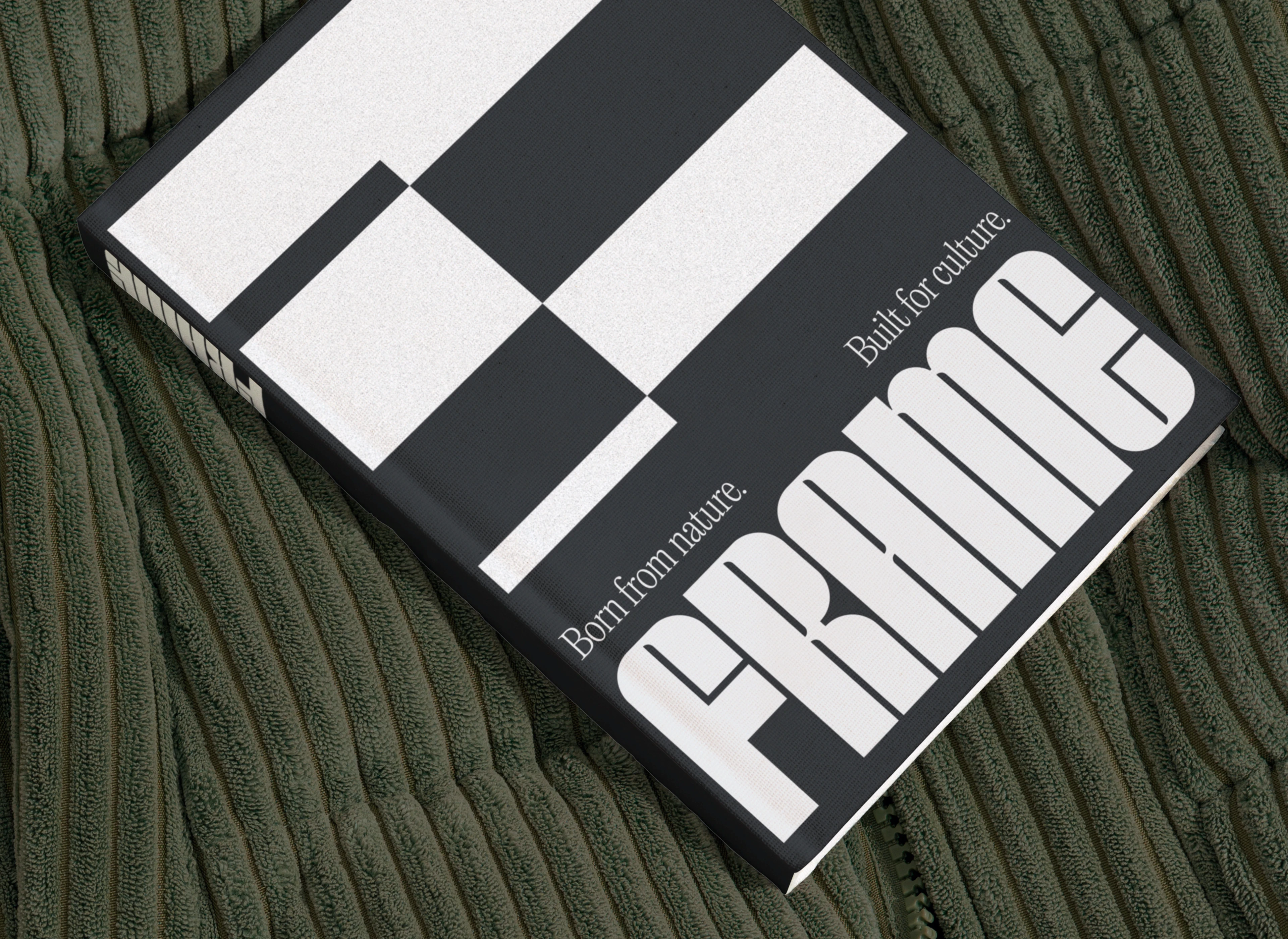 The logo reflects this positioning through a structured typography that combines verticality and symmetry. The bold, geometric letters, enriched with subtle details in their connections, evoke both attentive listening and FRAME’s ability to create connections between stories, formats, and different fields of exploration.