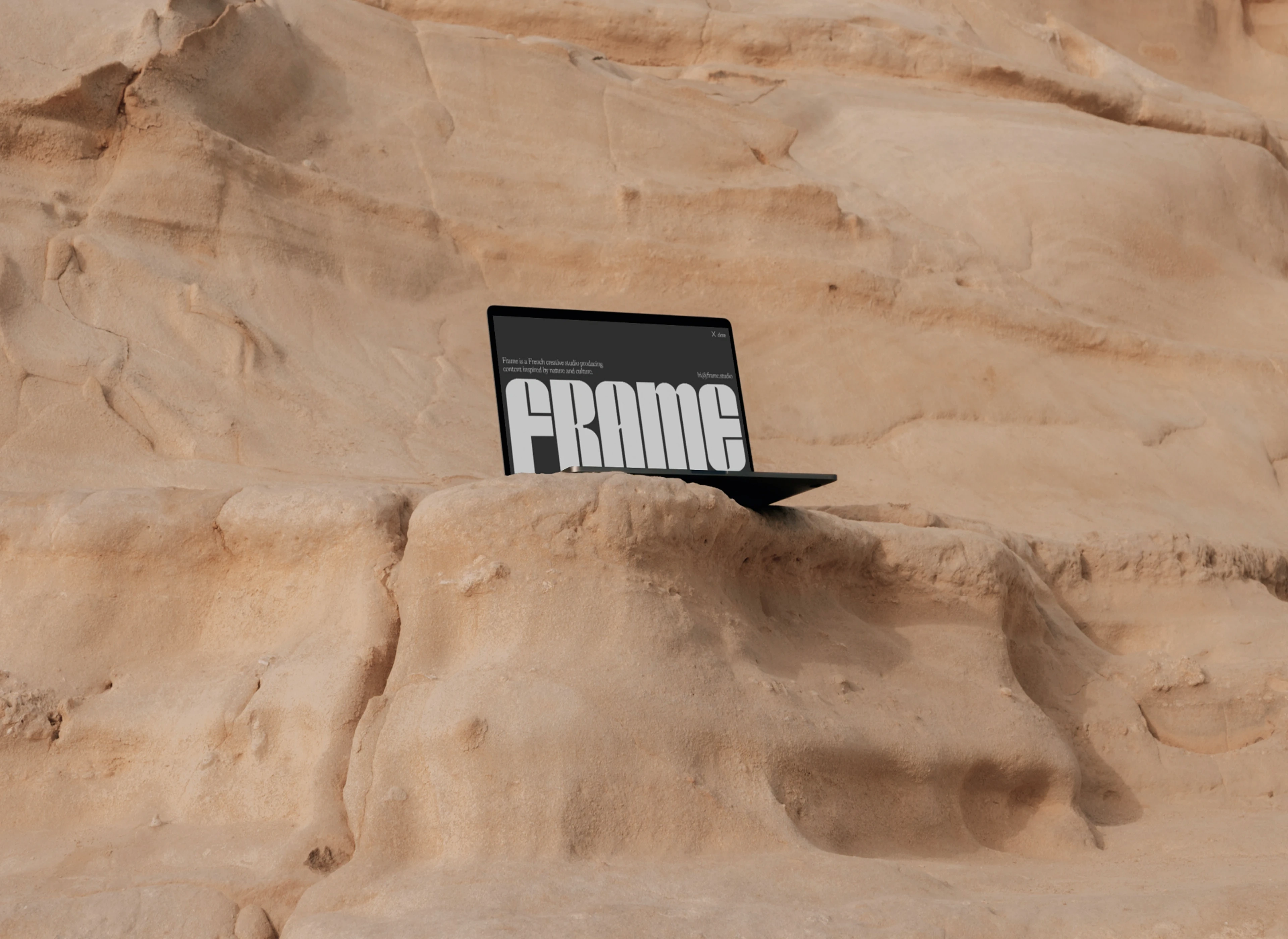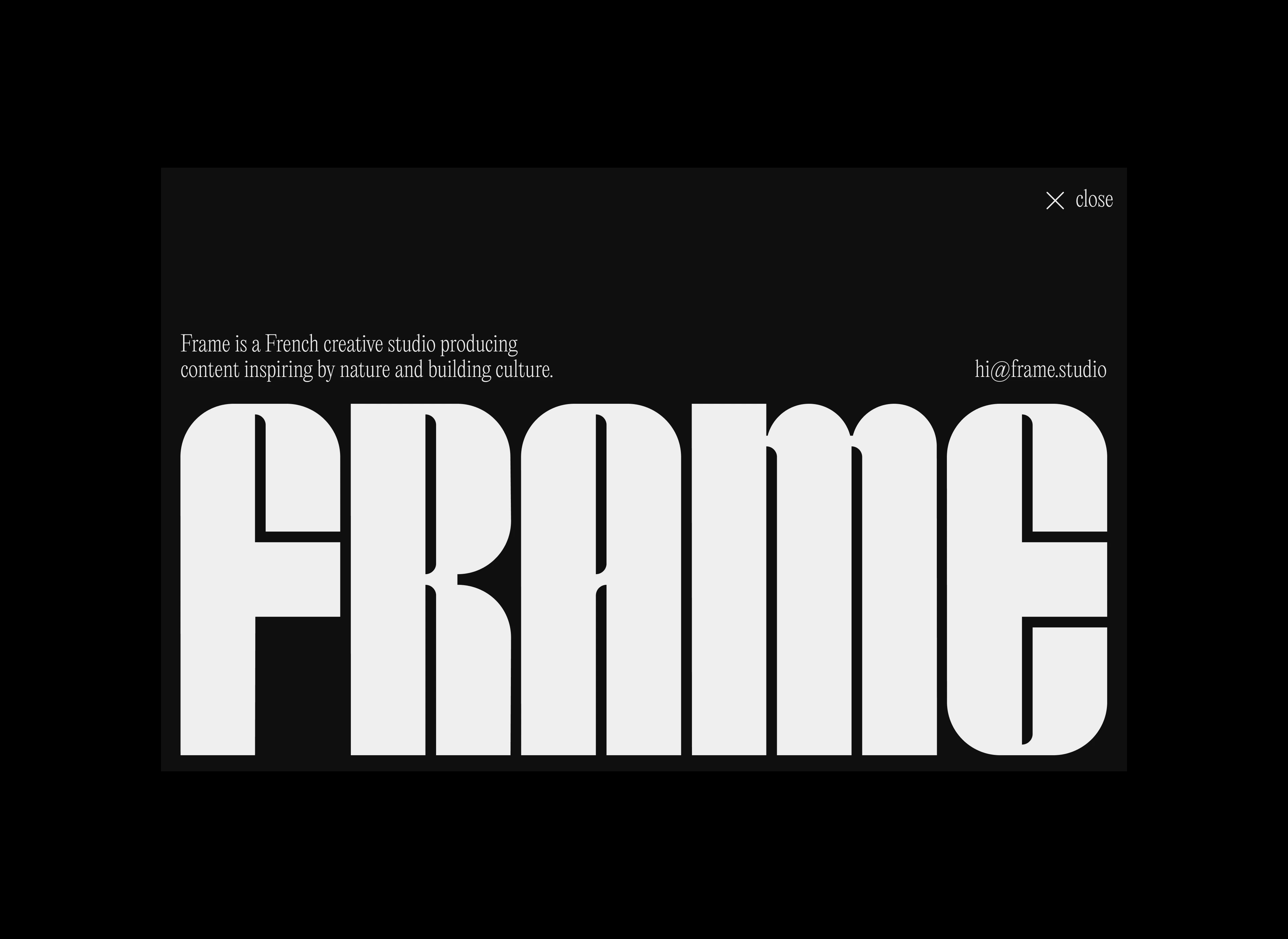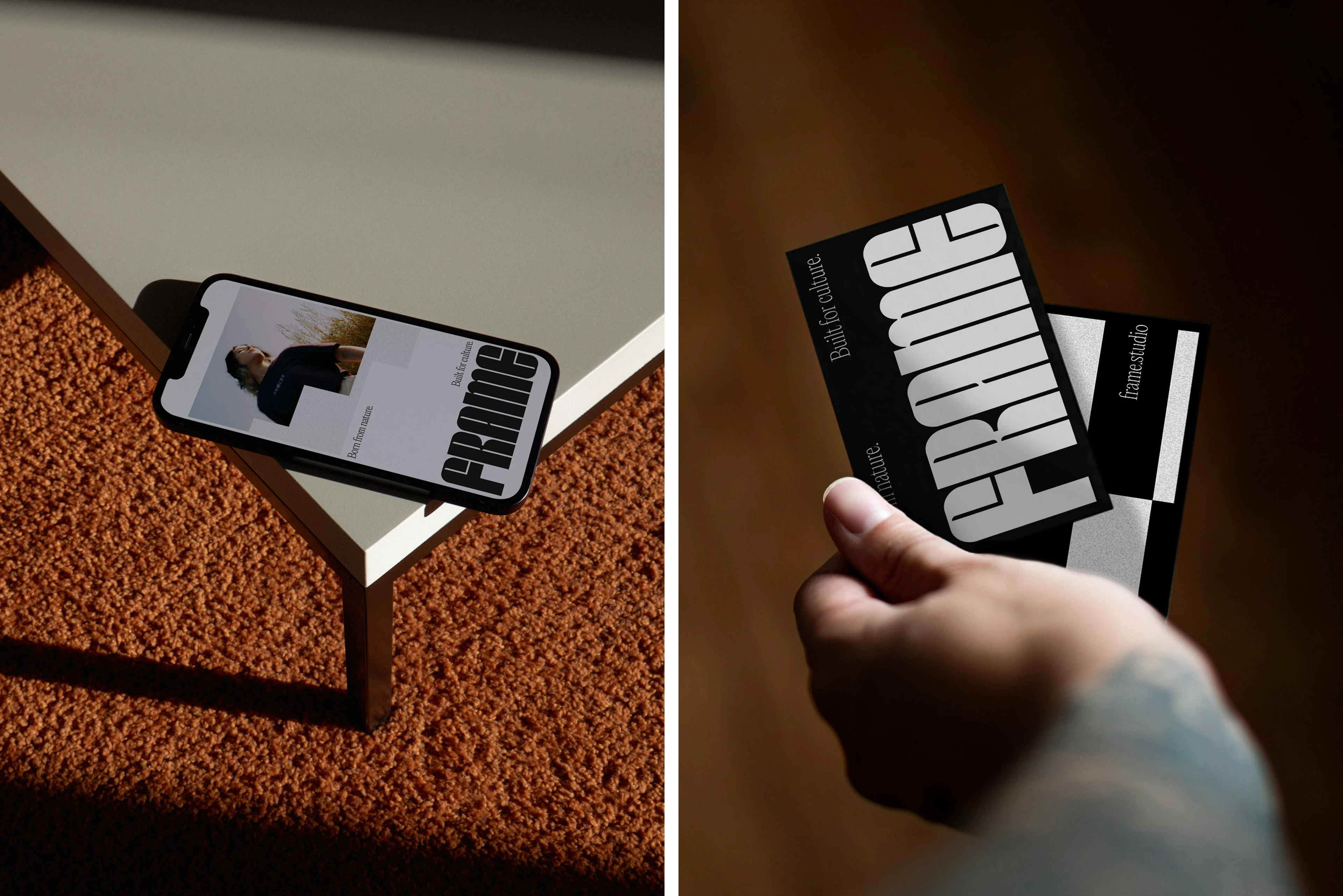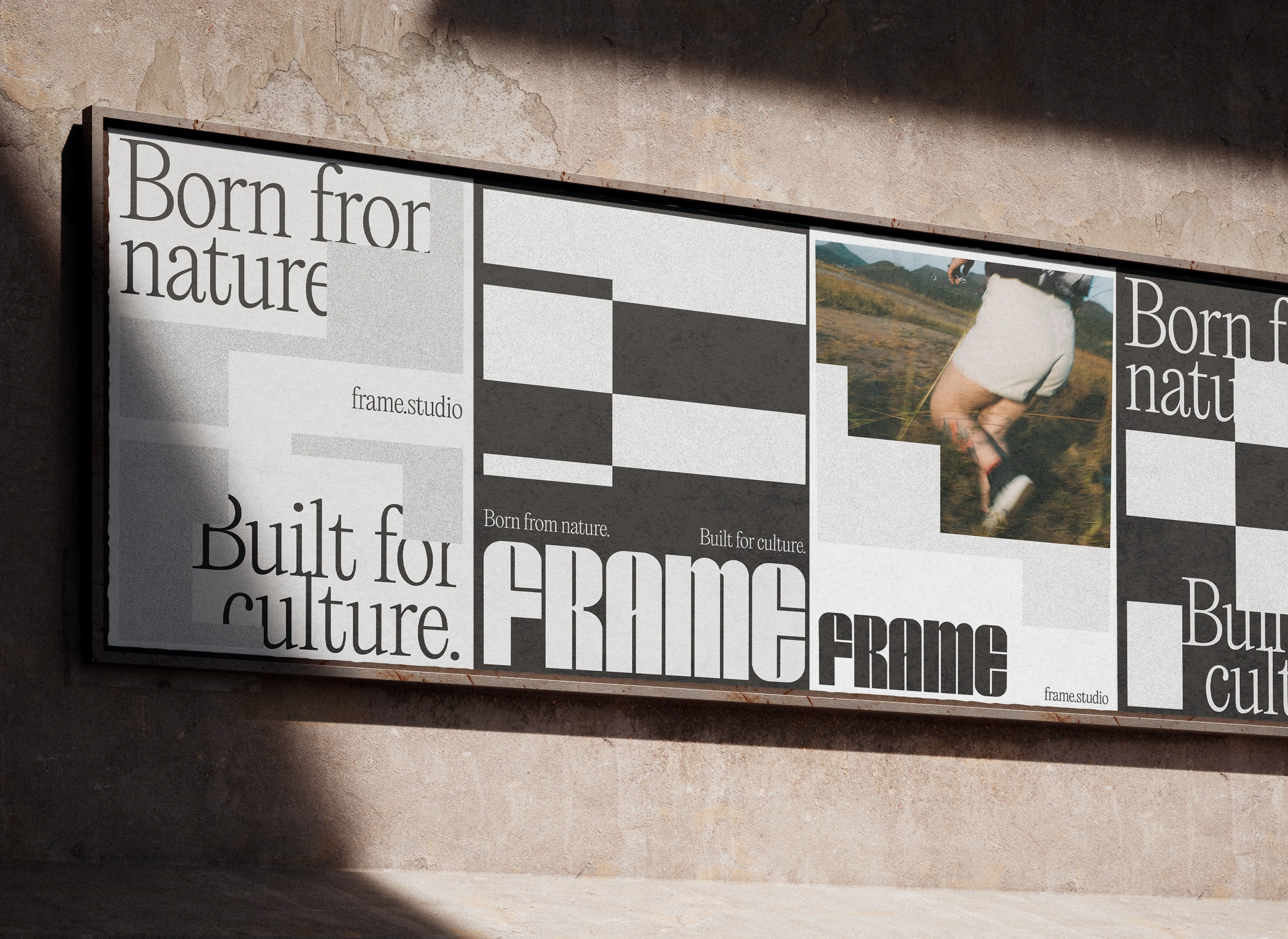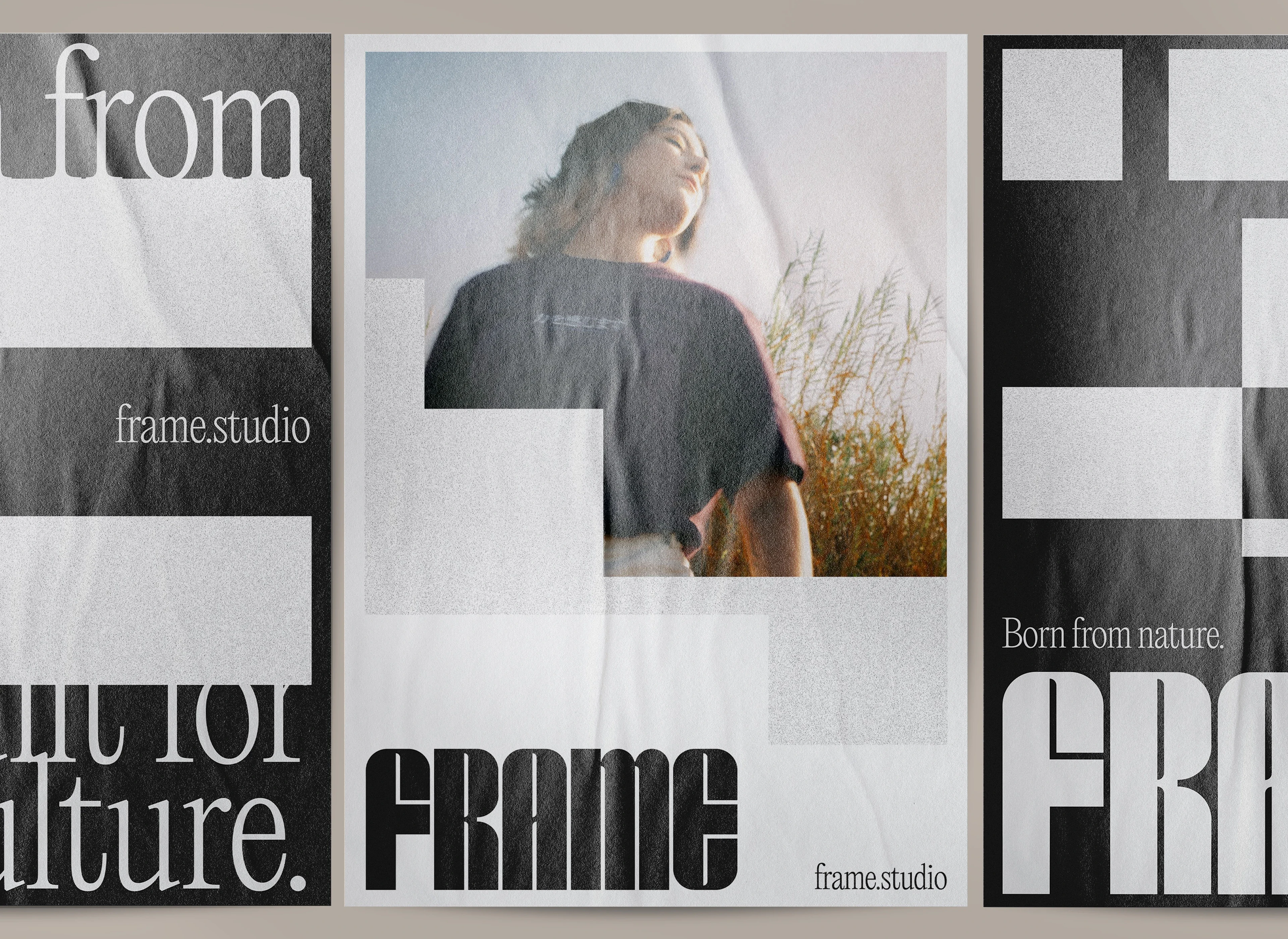 The graphic system extends this approach by drawing from the technical world of framing and editing: fragmented lines and partial frames structure the visual identity. These graphic codes compose a coherent language that guides FRAME’s creations while preserving the emphasis on the produced content and images.