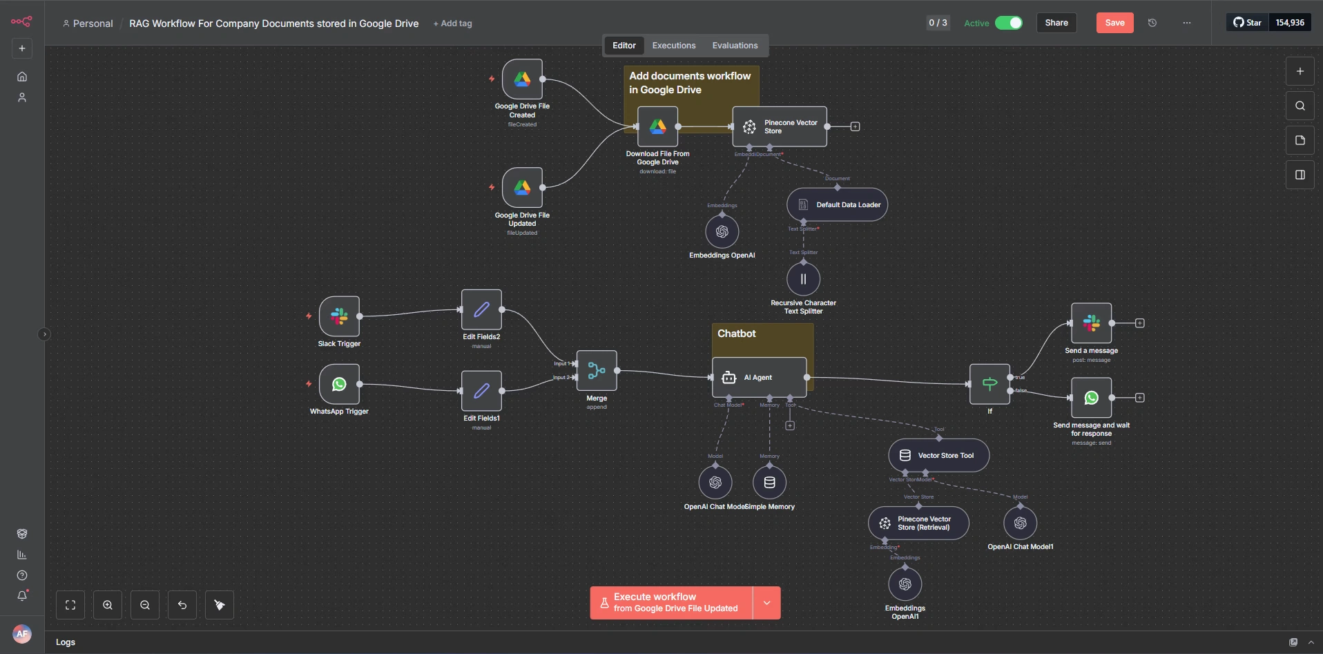 Whenever new documents are added to the companyโs Drive folder, they are automatically processed, vectorized, and added to a Pinecone database for contextual search.