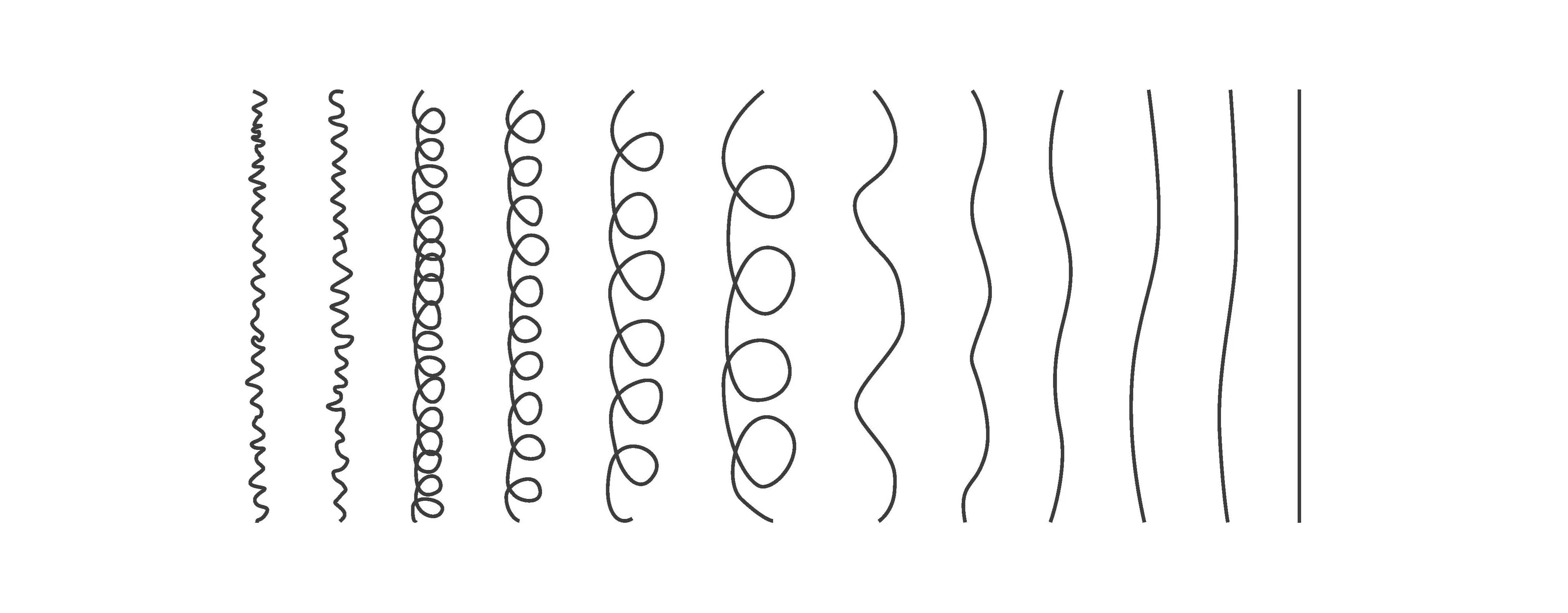 La tipografía limpia en blanco, combinada con un sistema de ondas ilustradas, crea una narrativa visual coherente que representa la textura natural del cabello. Las etiquetas son minimalistas, pero informativas, con ingredientes destacados y mensajes clave visibles desde el primer vistazo.